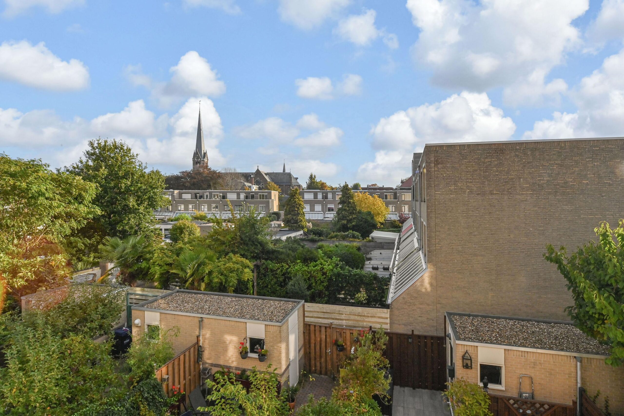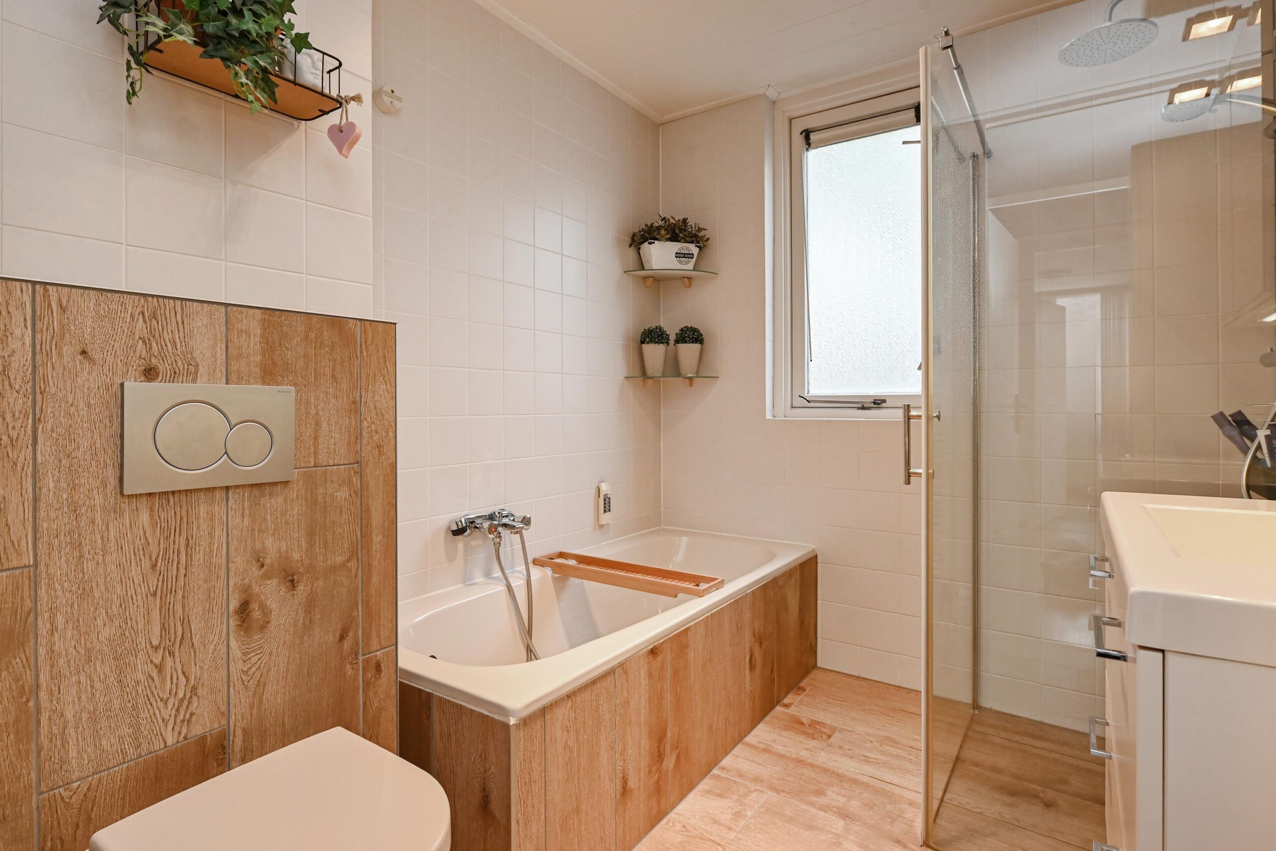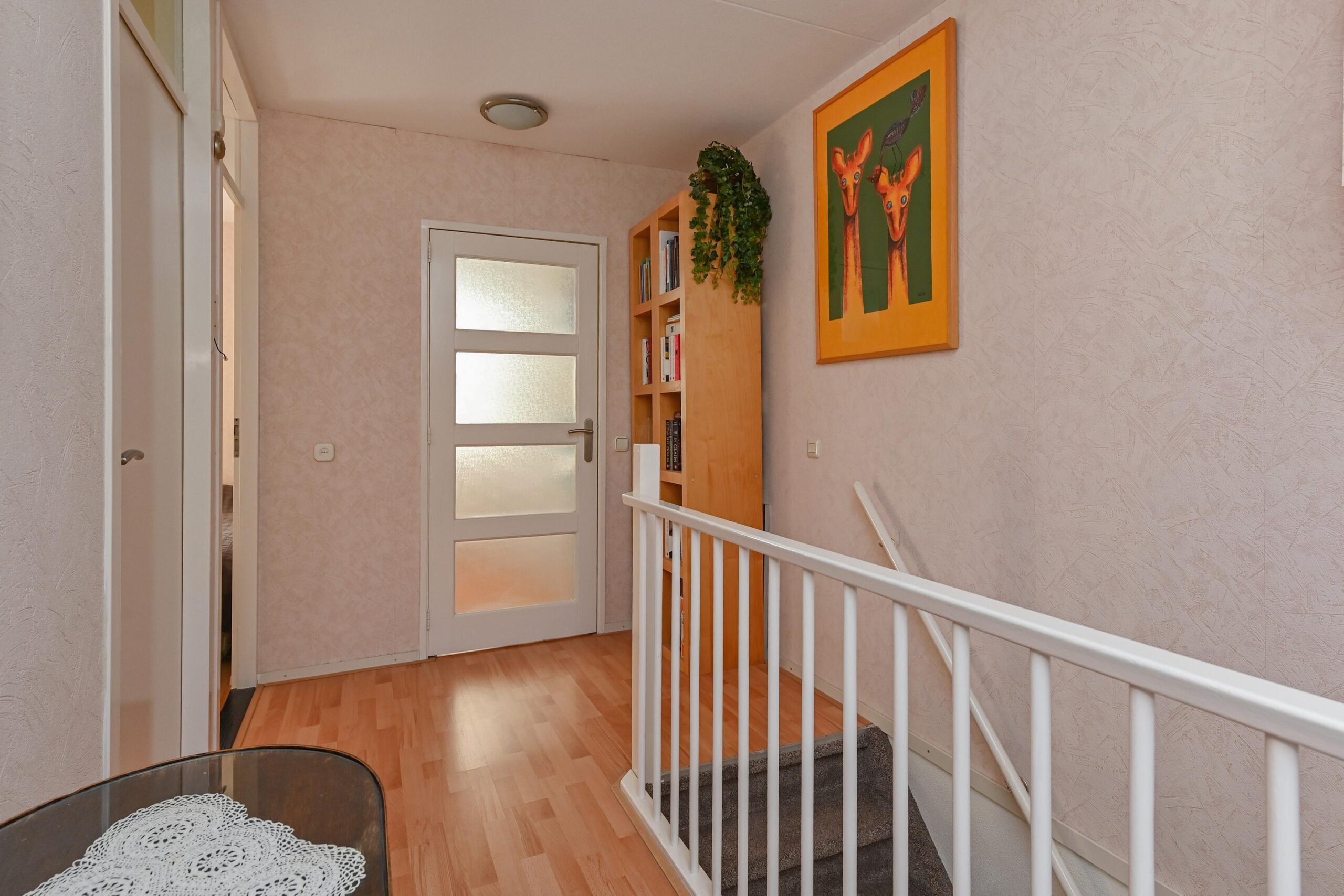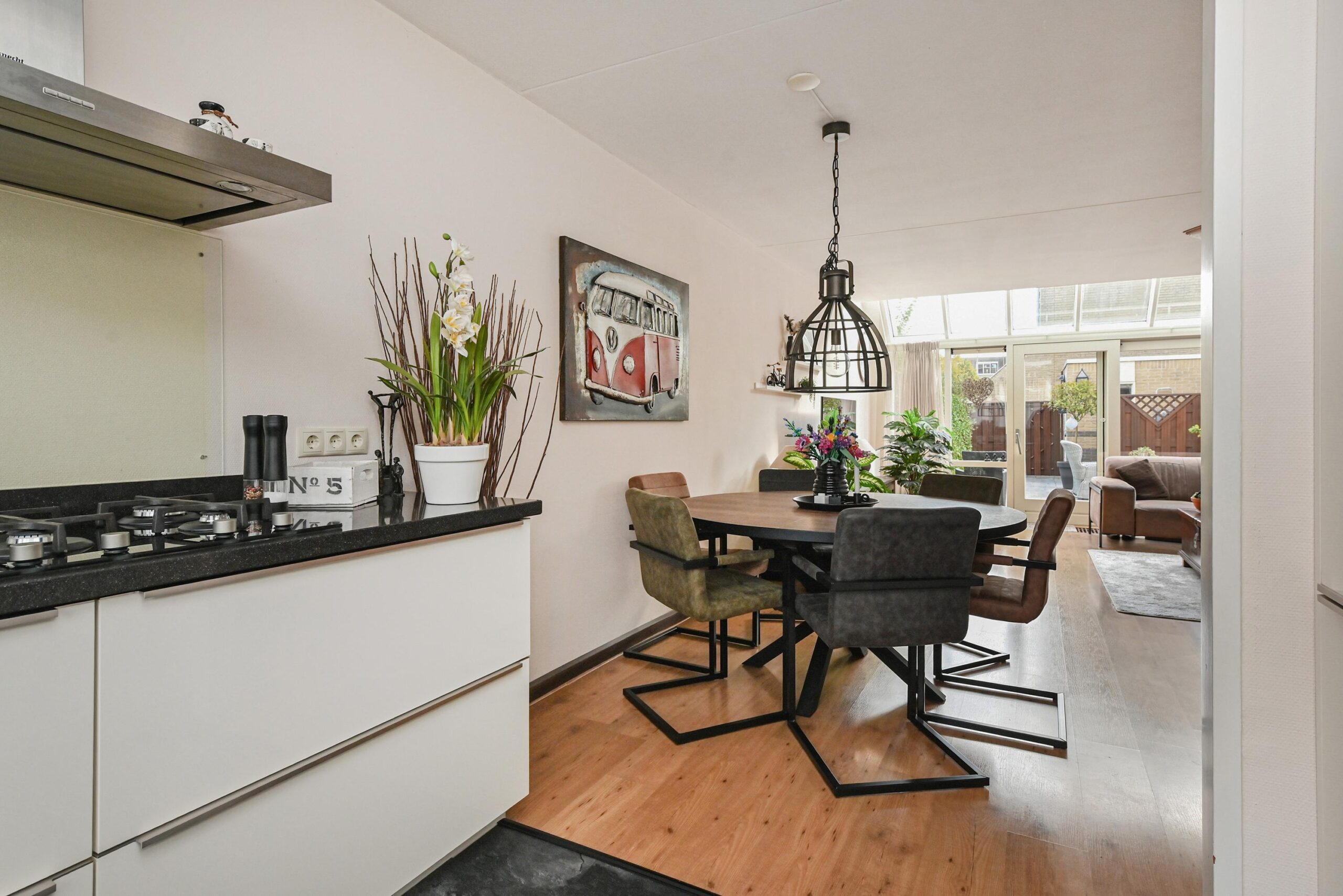 Dankzij de grote schuifpui stap je zo de ruime achtertuin in, waardoor binnen en buiten mooi in elkaar overlopen. De trap naar boven bevindt zich in de woonkamer, praktisch én sfeervol geplaatst.