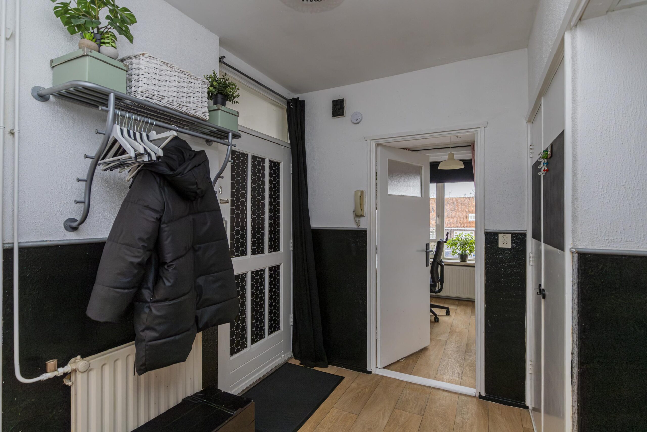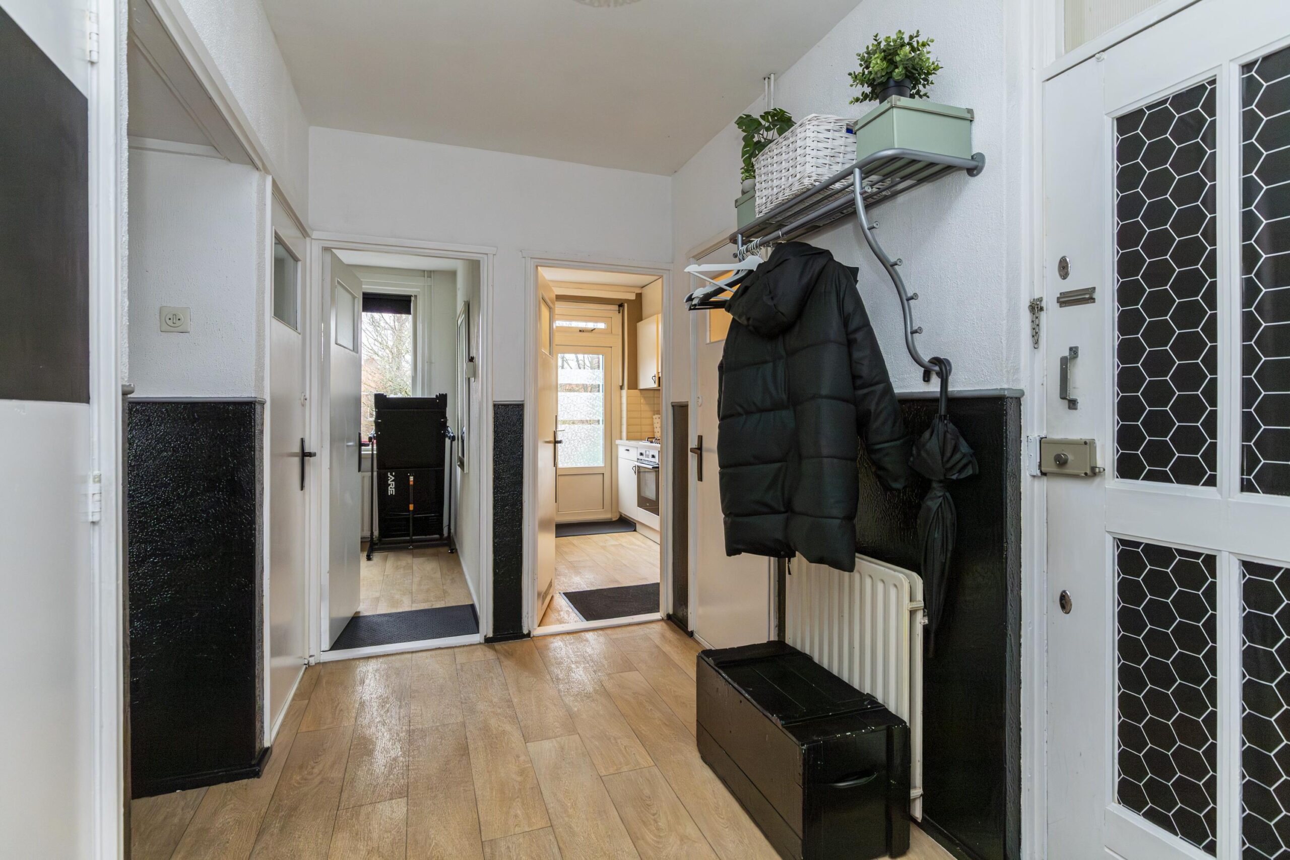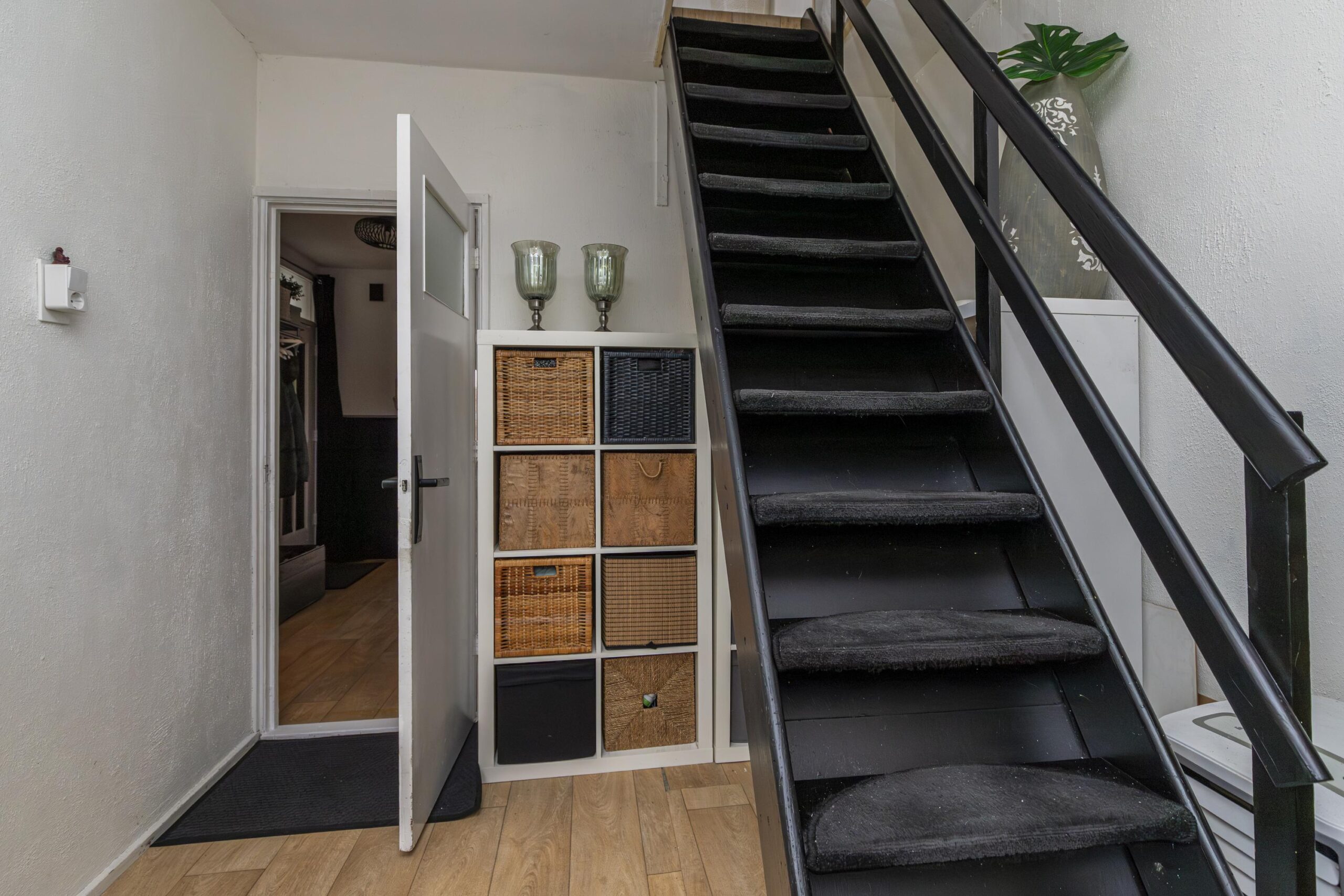 Via het gemeenschappelijke trappenhuis bereikt u de entree van de woning op de derde verdieping. De centrale hal geeft toegang tot verschillende vertrekken en zorgt voor een praktische indeling van de woonlaag.