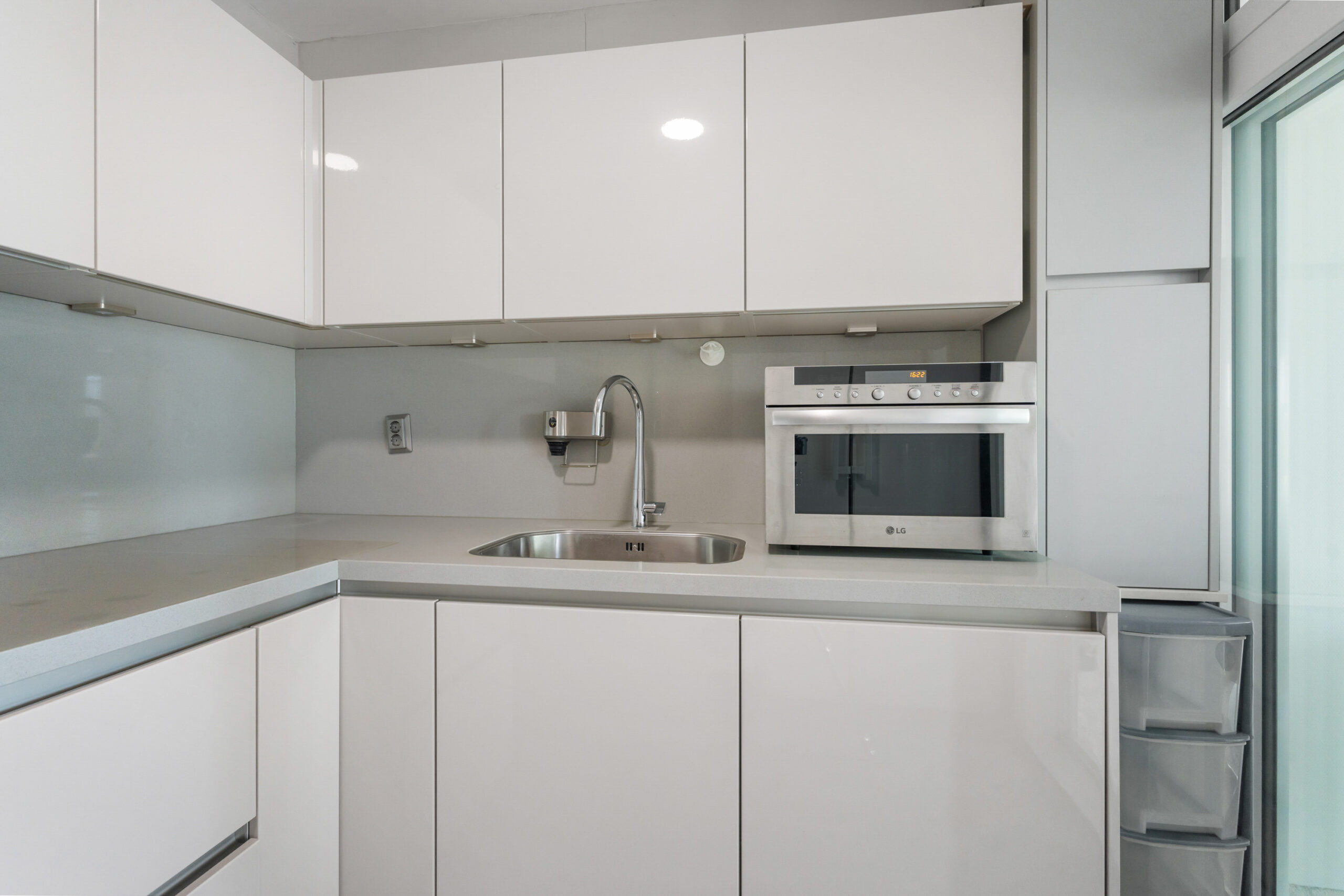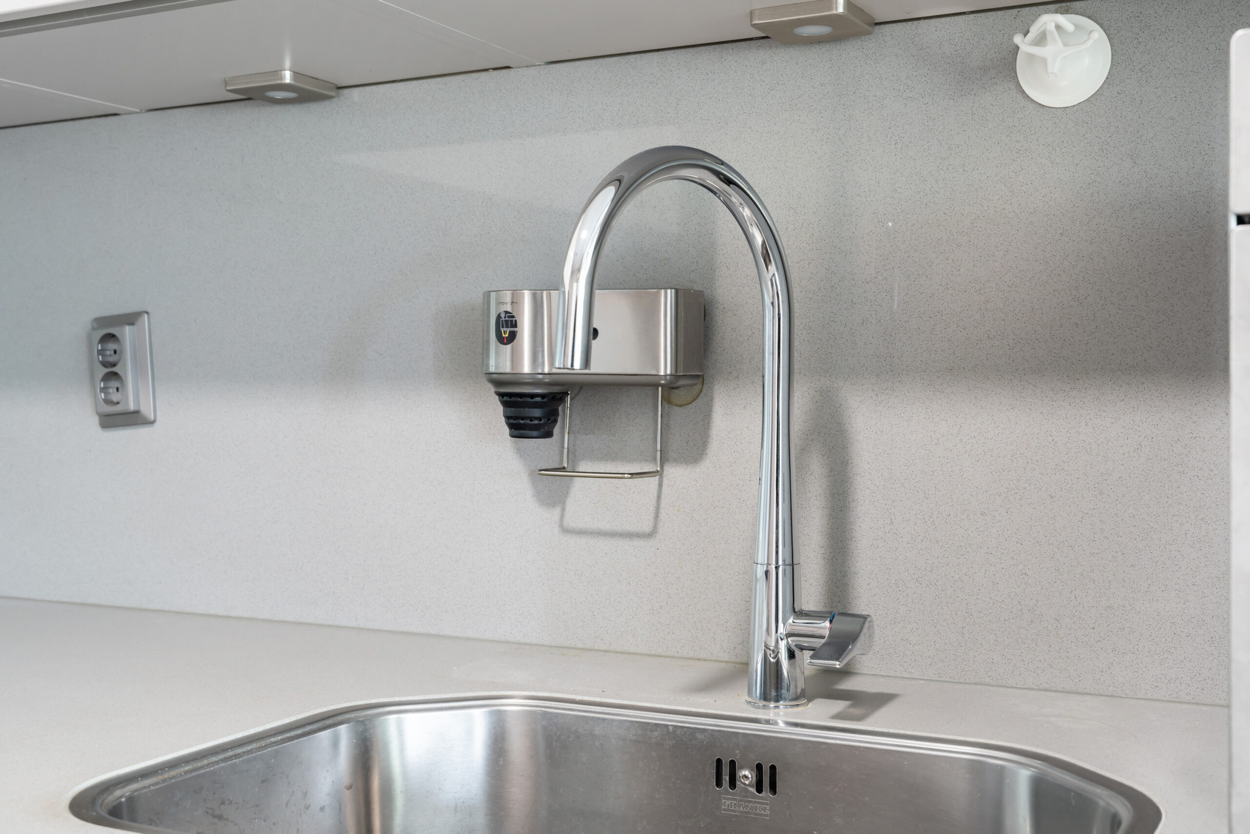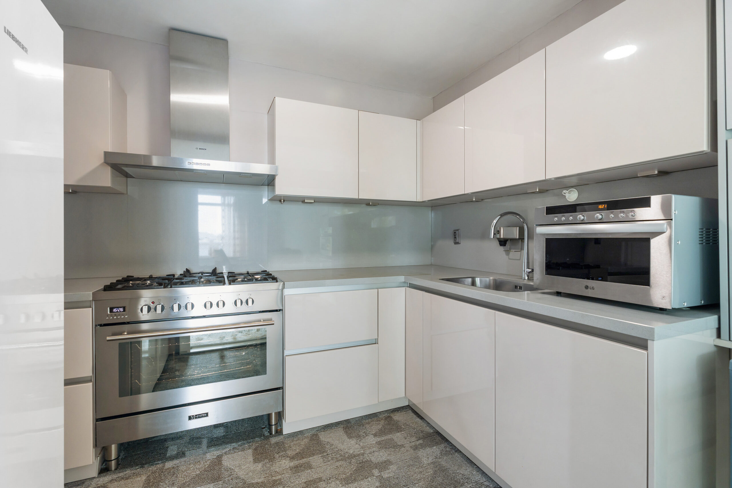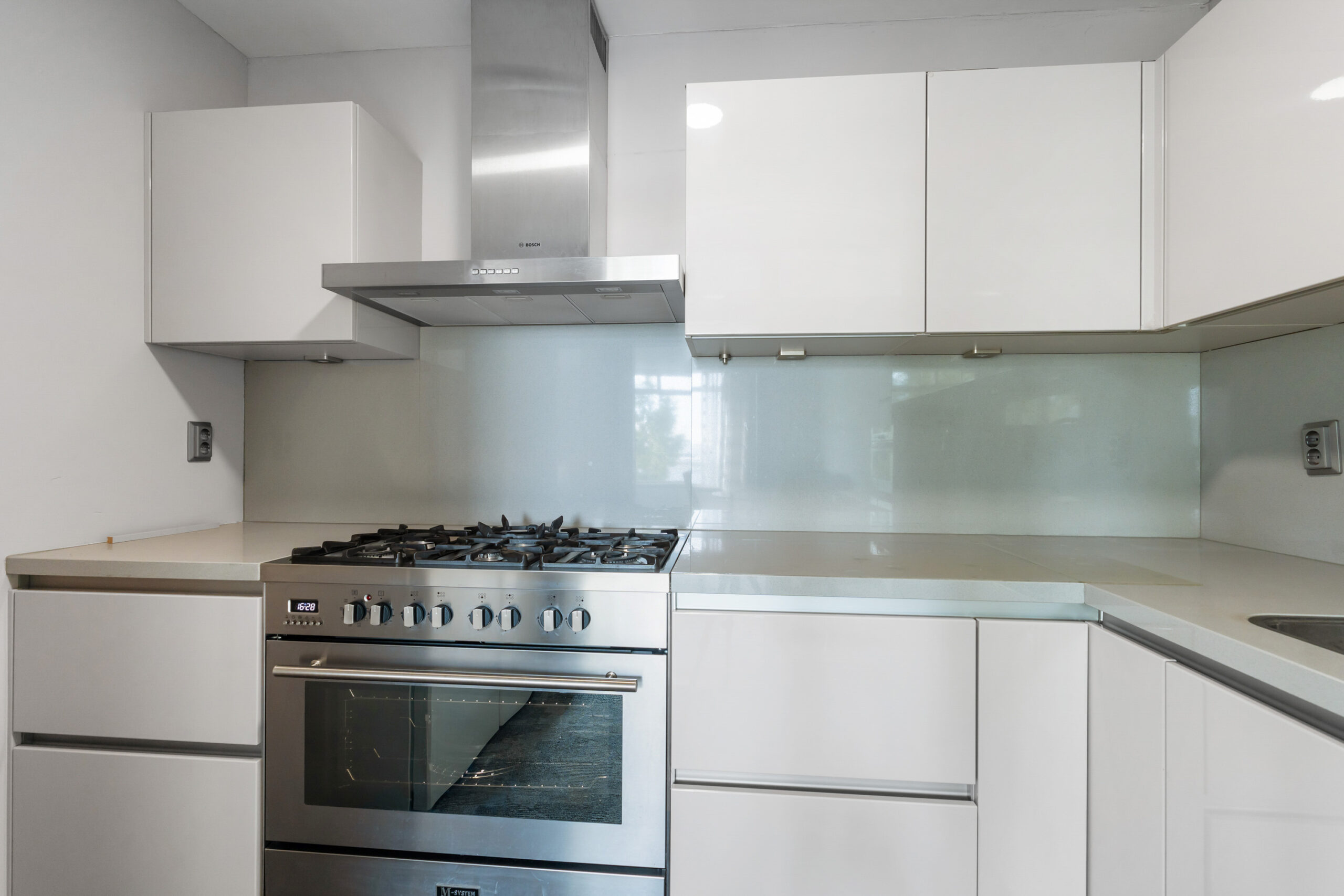 De eetkamer/woonkeuken is strak vormgegeven met crème keukenkasten, uitgerust met een 6pits gasfornuis inclusief wokbrander, oven en afzuigkap. Dankzij de schuifdeuren kun je de keuken afsluiten als je dat wilt.