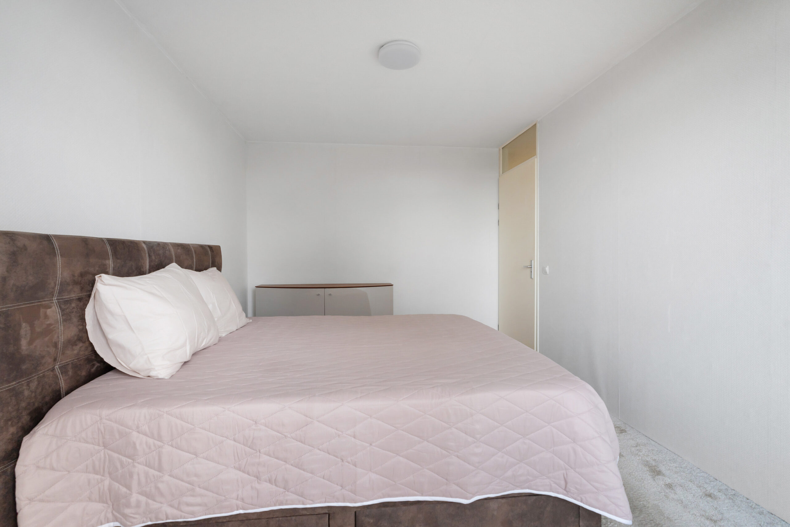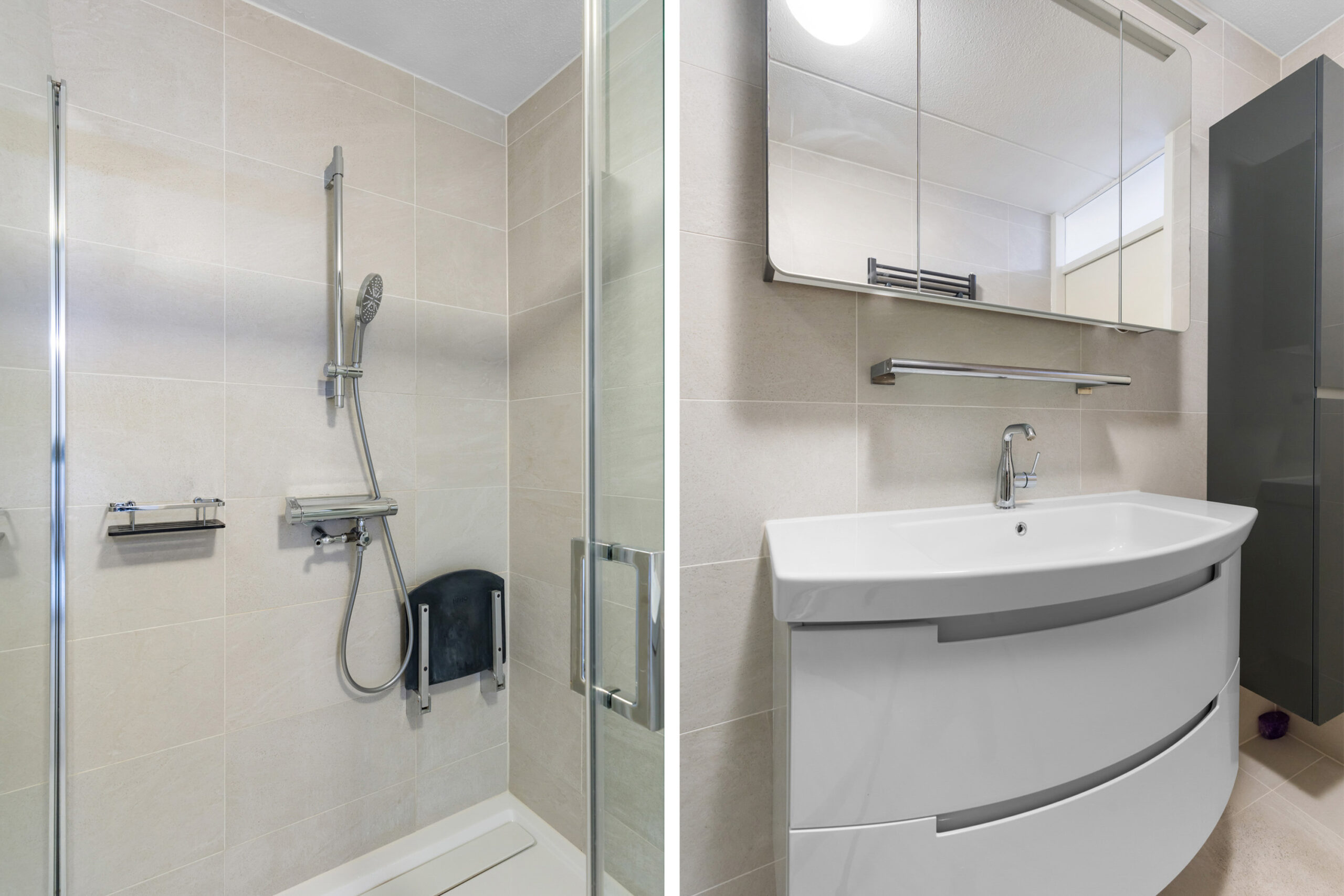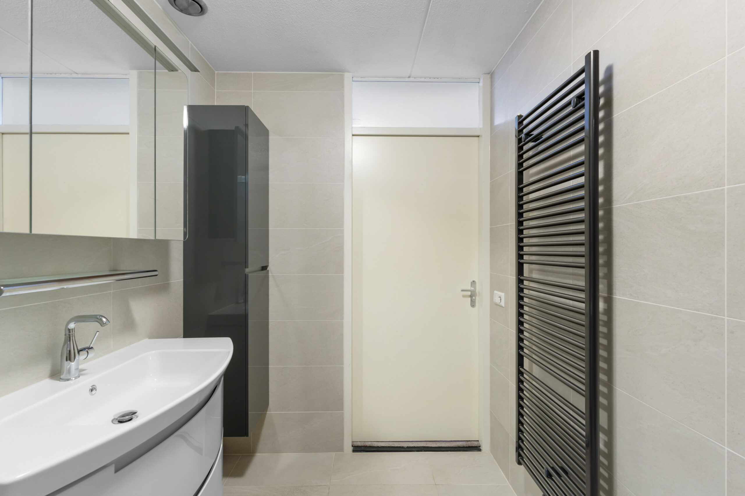 Er zijn twee ruime slaapkamers aanwezig, elk met voldoende ruimte voor bed en kledingmeubel. De badkamer is verzorgd afgewerkt met lichte wand- en vloertegels, voorzien van een wastafel met spiegel, handdoekenradiator en aparte douchecabine.