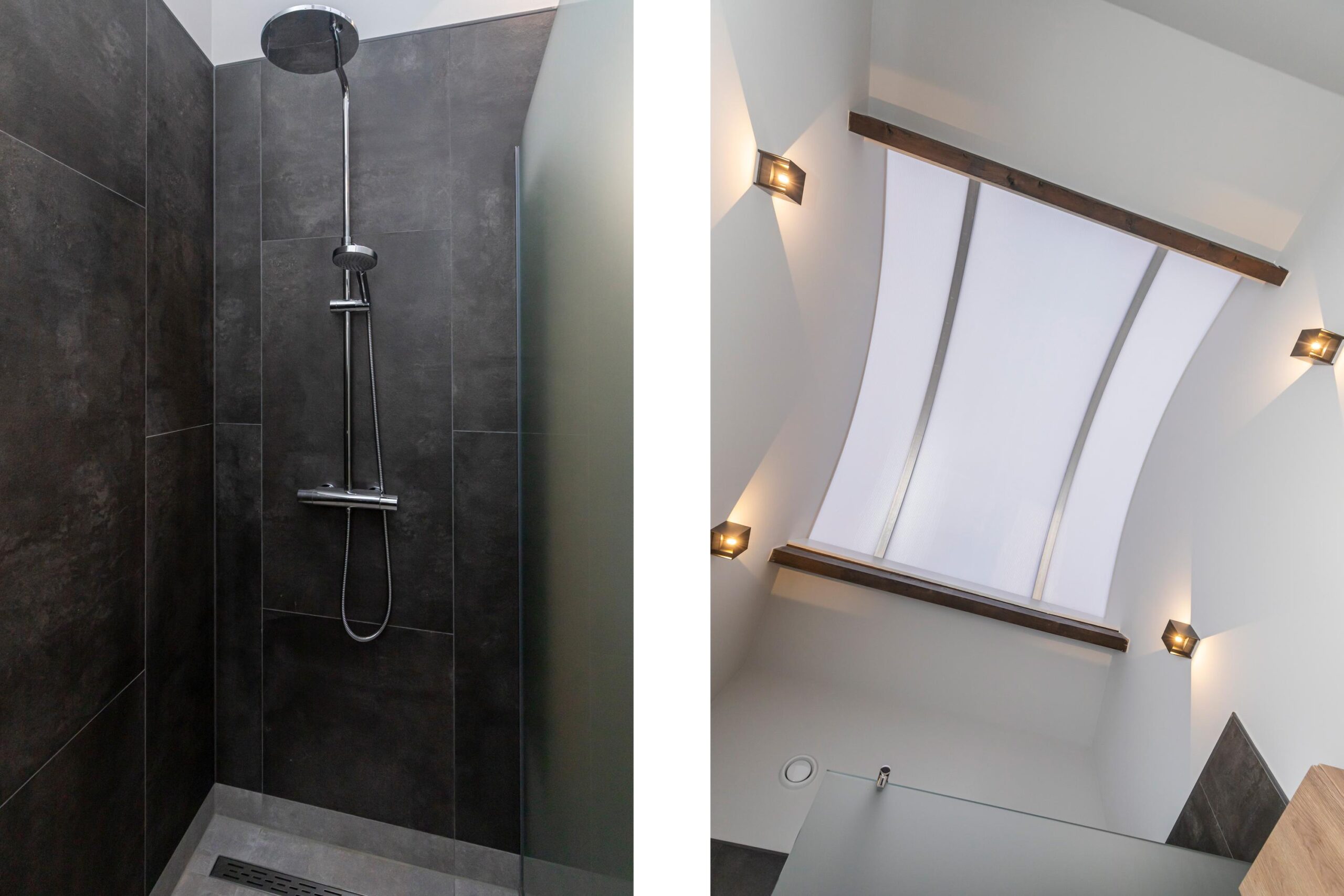 Naast het woonhuis zijn er drie woonstudio’s op de eerste etage, met een gezamenlijke kitchenette onder een grote lichtkoepel. Ideaal voor oudere kinderen die zelfstandig willen wonen, of voor verhuur. Goed om te weten: de verhuurvergunning is rond. Alle studio’s zijn voorzien van airconditioning (tevens verwarming) en modern afgewerkte badkamers met inloopdouche, toilet en wastafelmeubel.