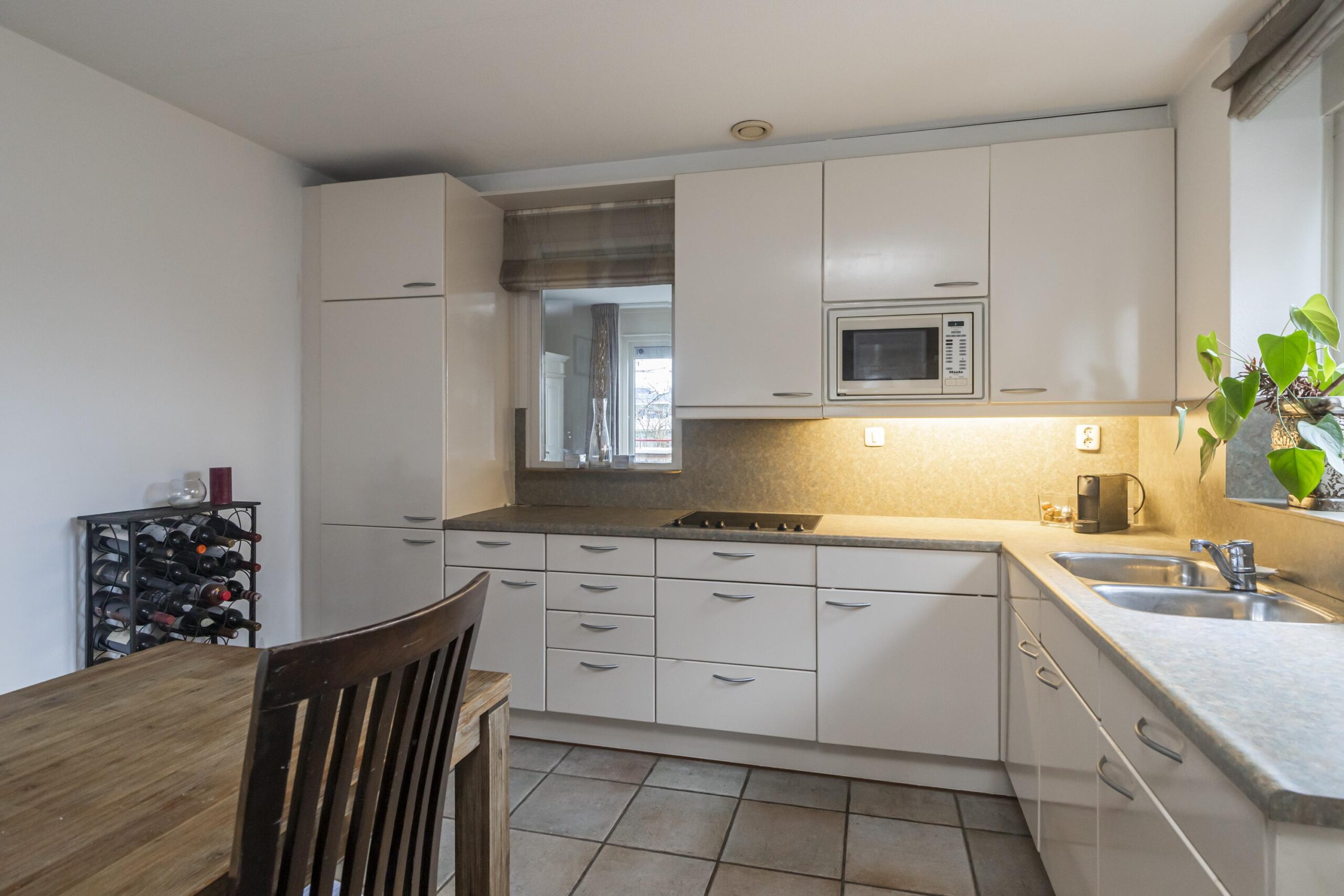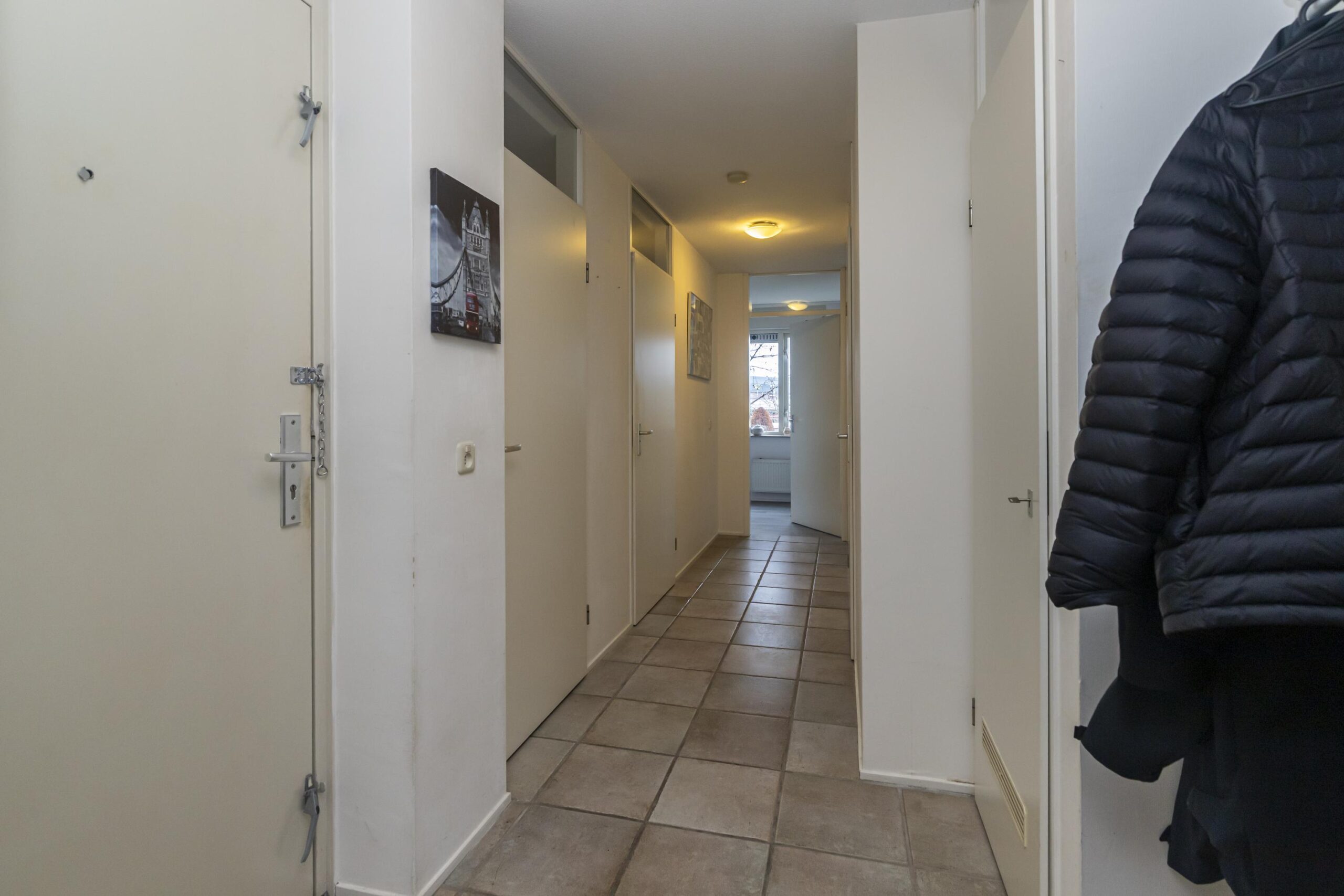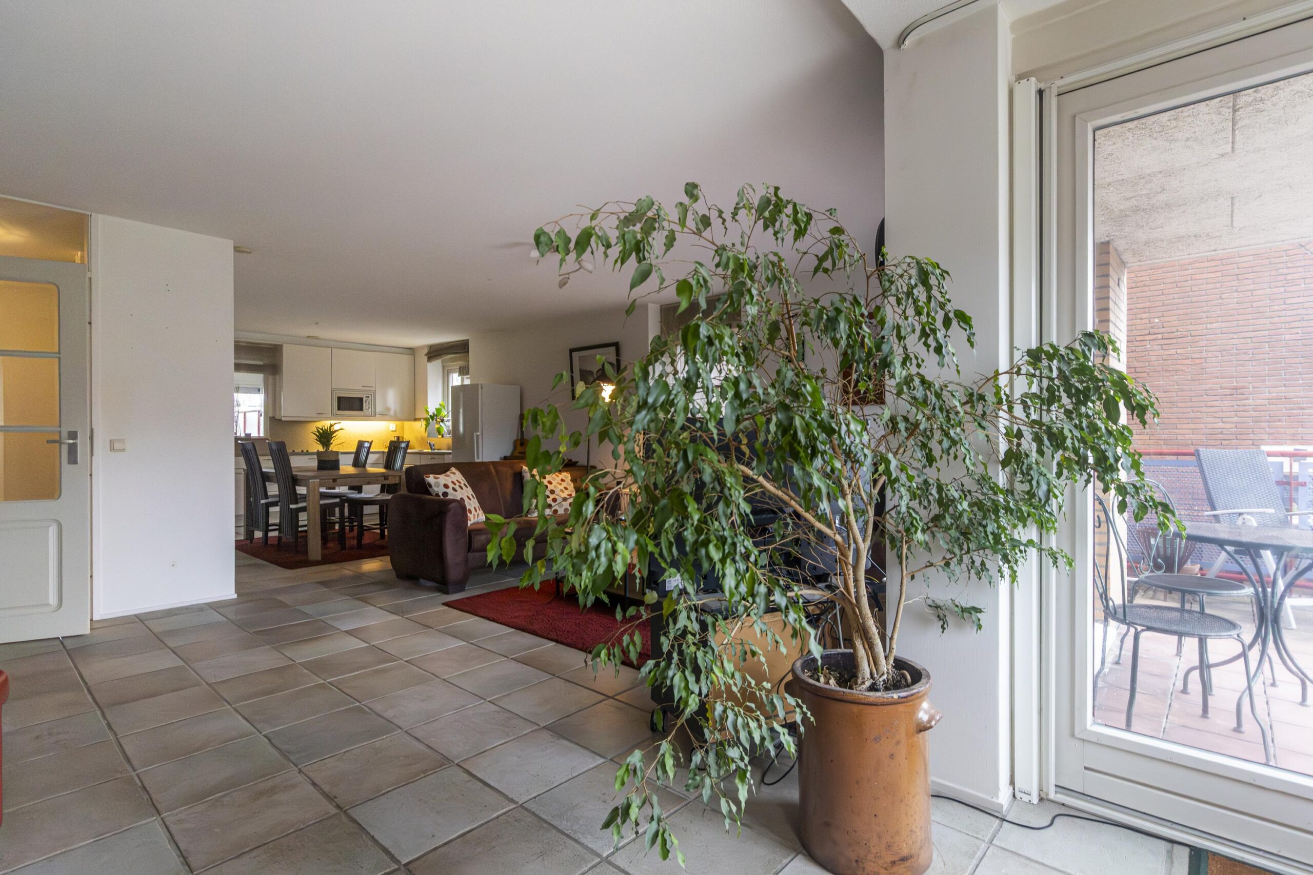 Via de afgesloten centrale hal met bellentableau stap je het complex binnen. Met de lift of trap bereik je de woonlaag en de entree van het appartement. De hal geeft toegang tot de meterkast en een technische ruimte met de cv-combiketel en aansluitingen voor de wasmachine. Vanuit hier loop je door naar de lichte woonkamer met open keuken; een praktische opstelling die prettig contact houdt met de living. Aan de voorzijde is een deur naar het balkon, ideaal voor een koffie in de ochtend. Terug in de hal vind je het separate toilet met fonteintje en de badkamer met douche, ligbad en een dubbele wastafel met ondermeubel. Aan de achterzijde liggen twee slaapkamers. Beide kamers hebben een deur naar het zeer ruime dakterras, waar plek is voor een eettafel, loungeset en groen.