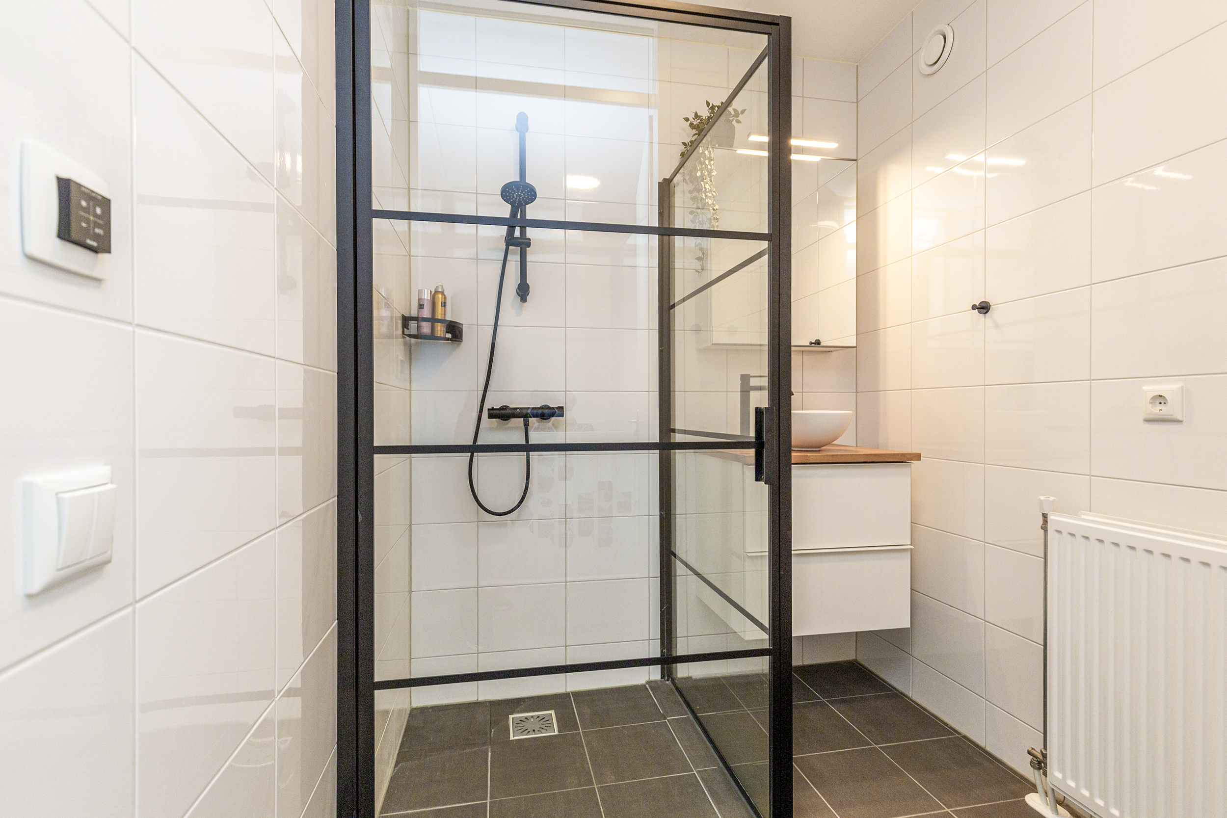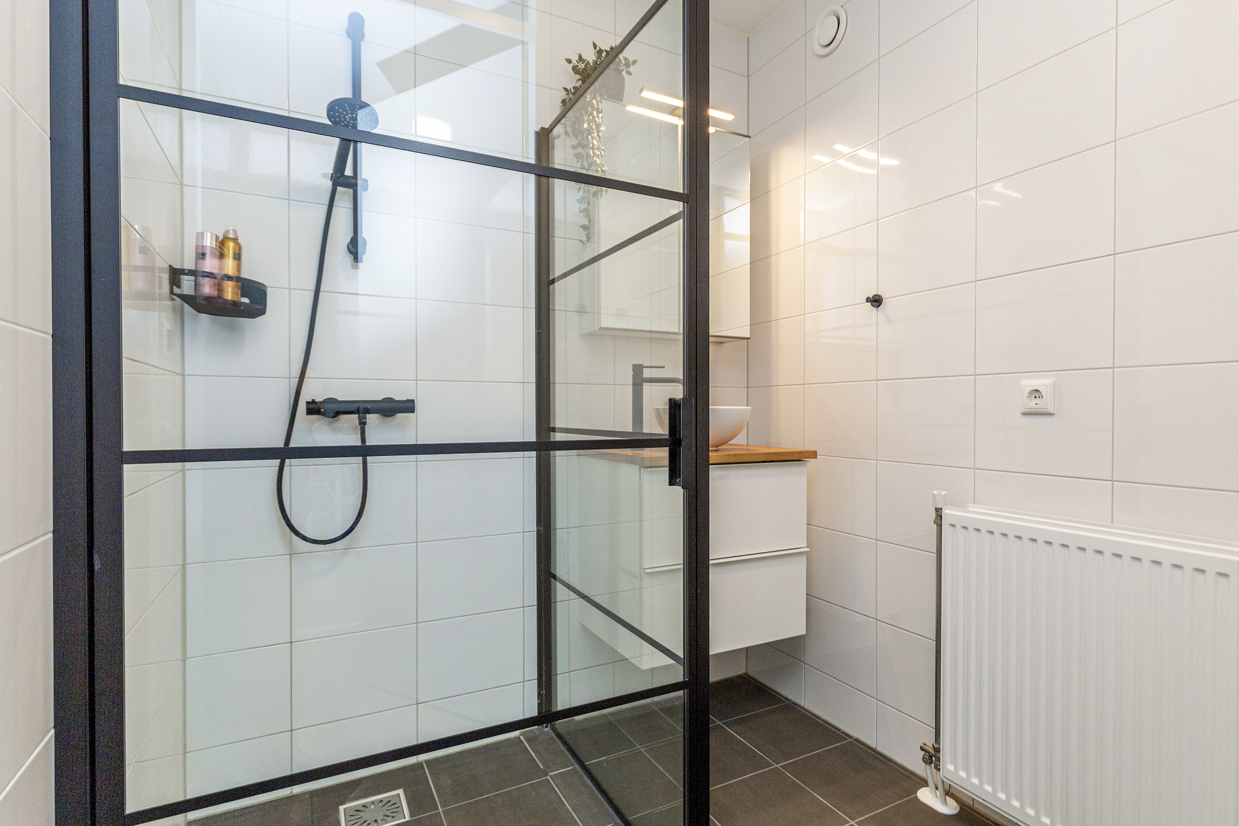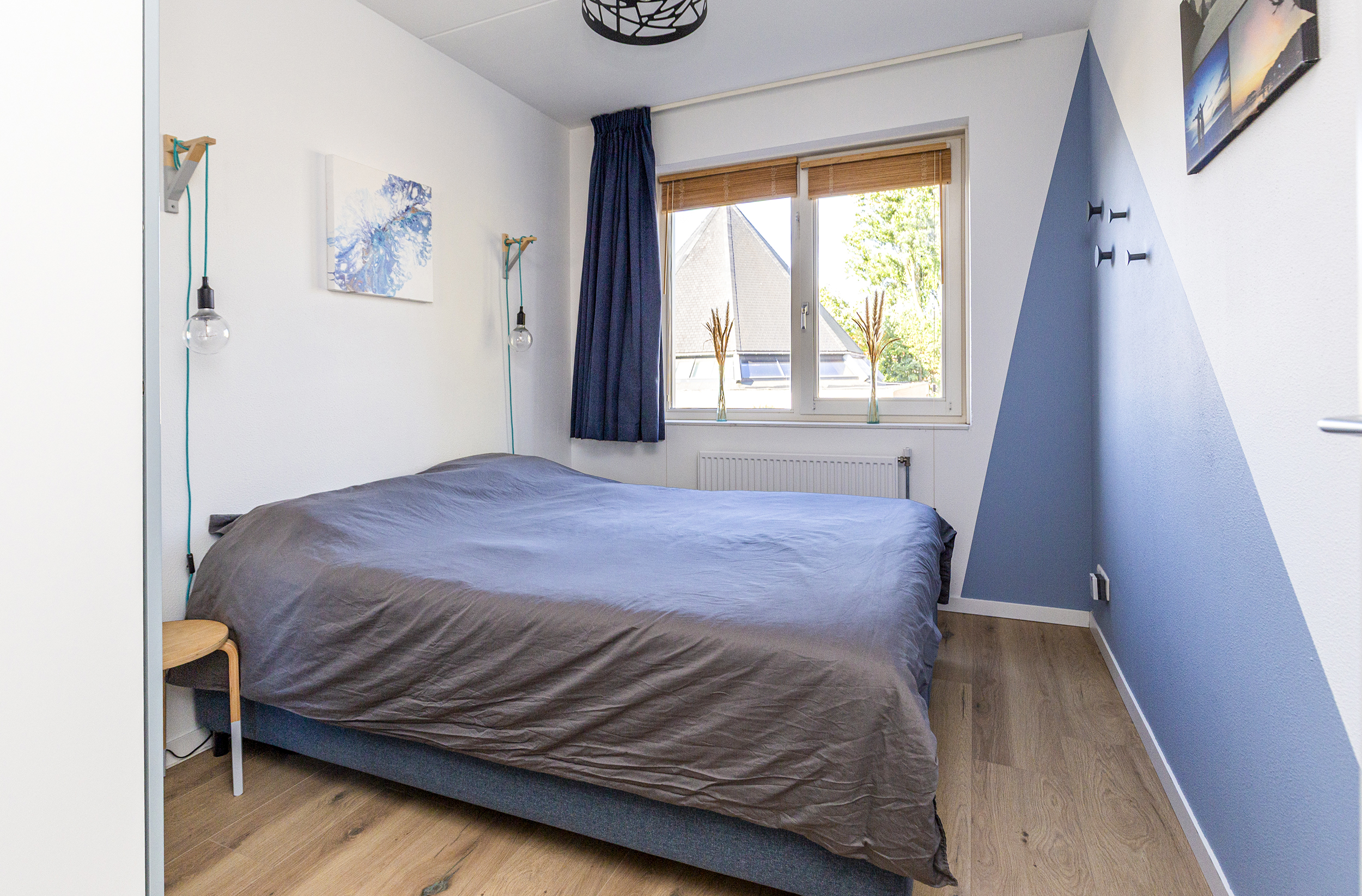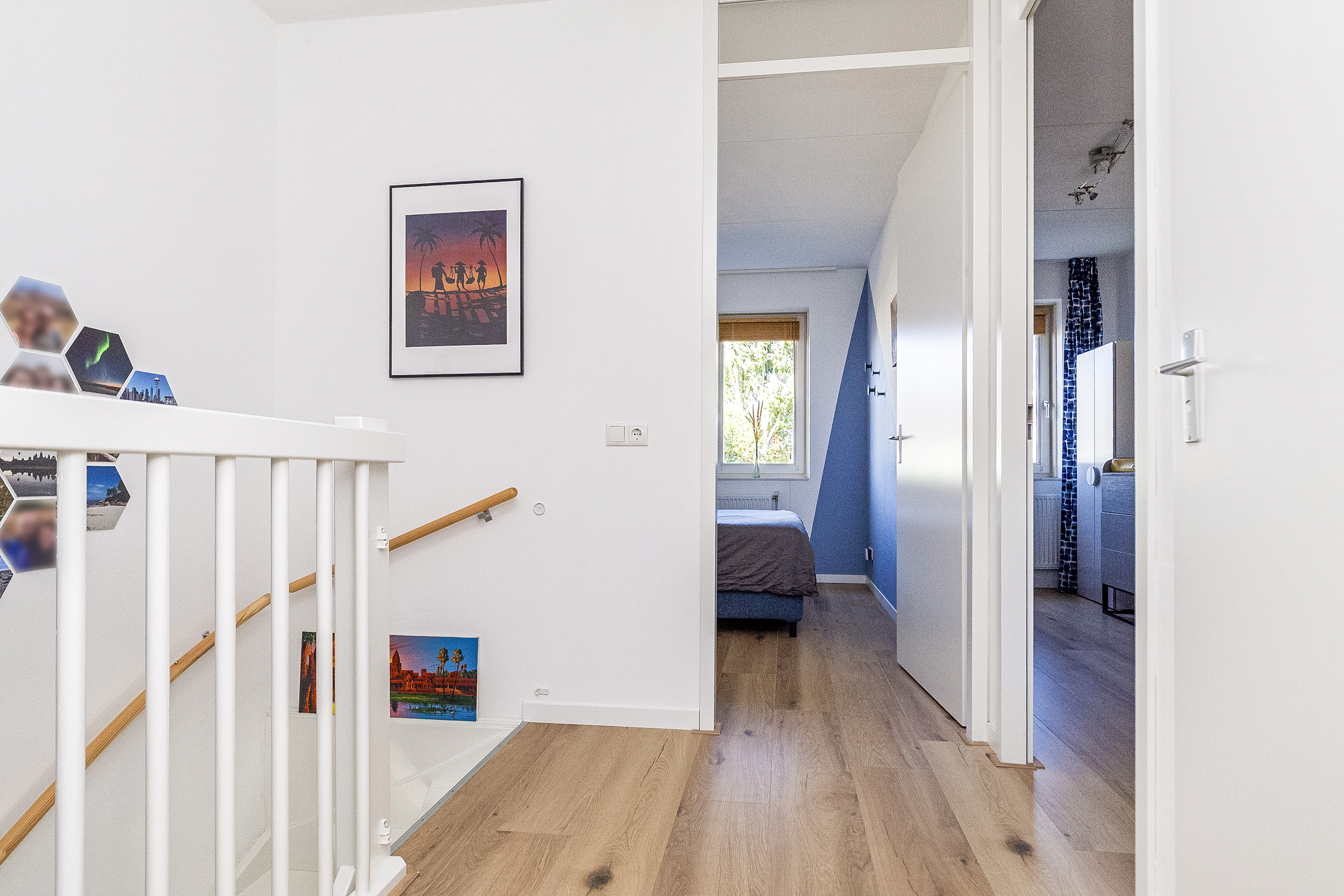 Ruime overloop met toegang tot een ruime slaapkamer aan de achterzijde en een praktische tweede slaapkamer, beide gelegen aan de achterzijde van de woning. Aan de voorzijde bevindt zich een ruime berging over de gehele breedte van de woning, voorzien van een Velux dakraam, wasmachineaansluiting en de opstelplaats voor de CV-combiketel. De badkamer is modern uitgevoerd met een douchecabine, wastafelmeubel en mechanische ventilatie.