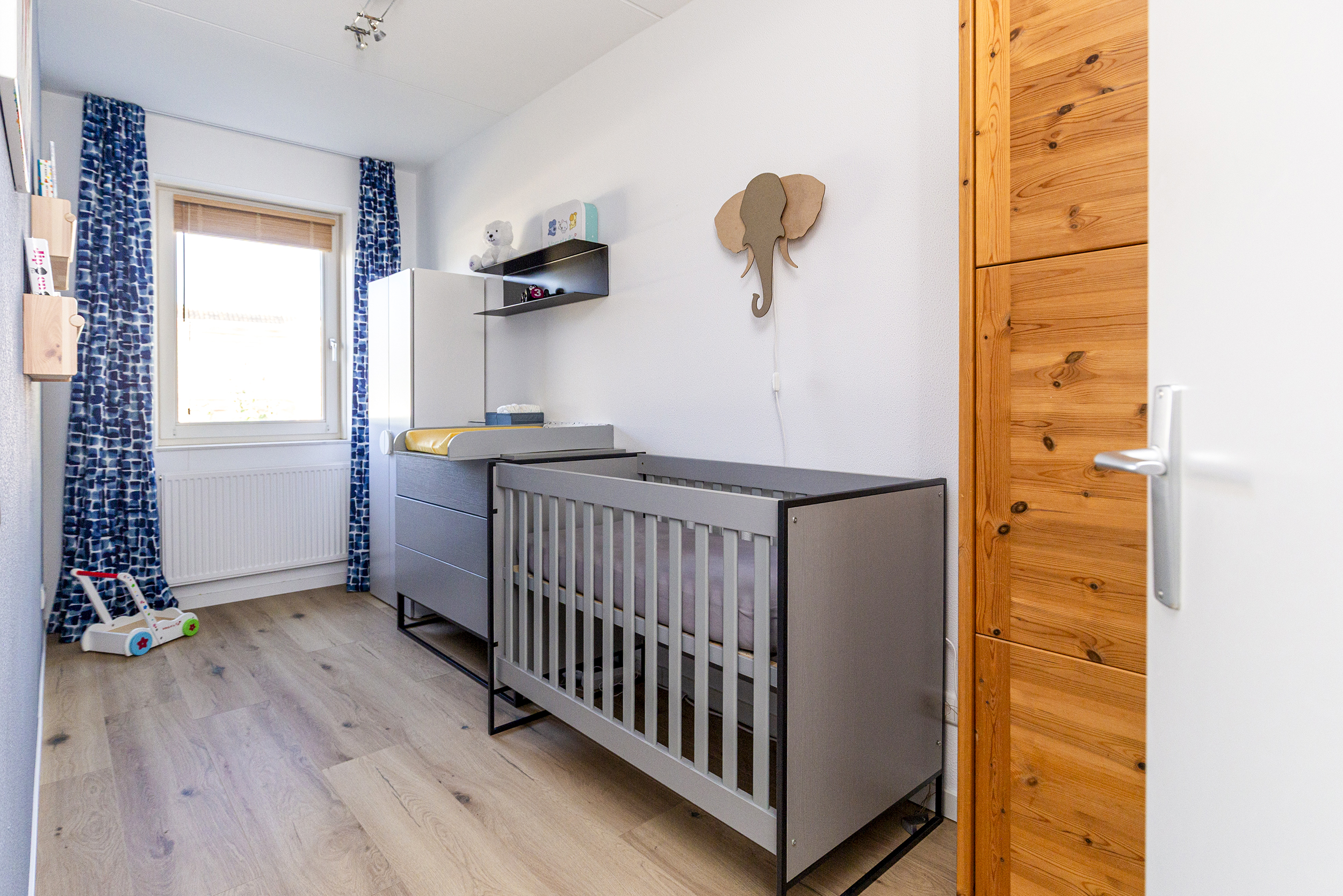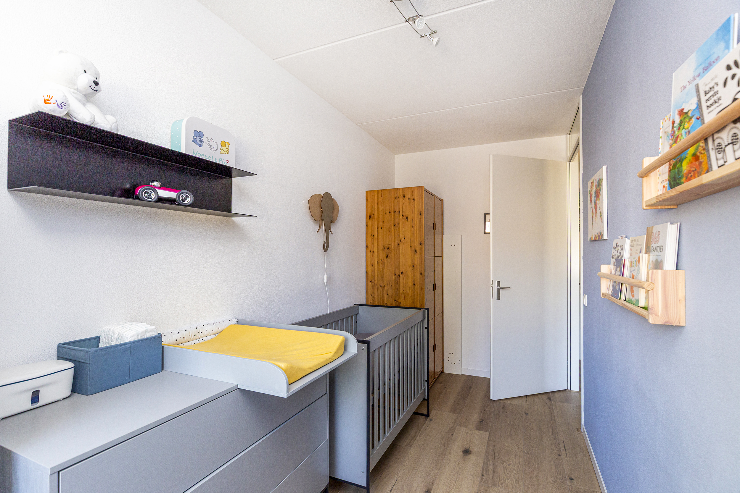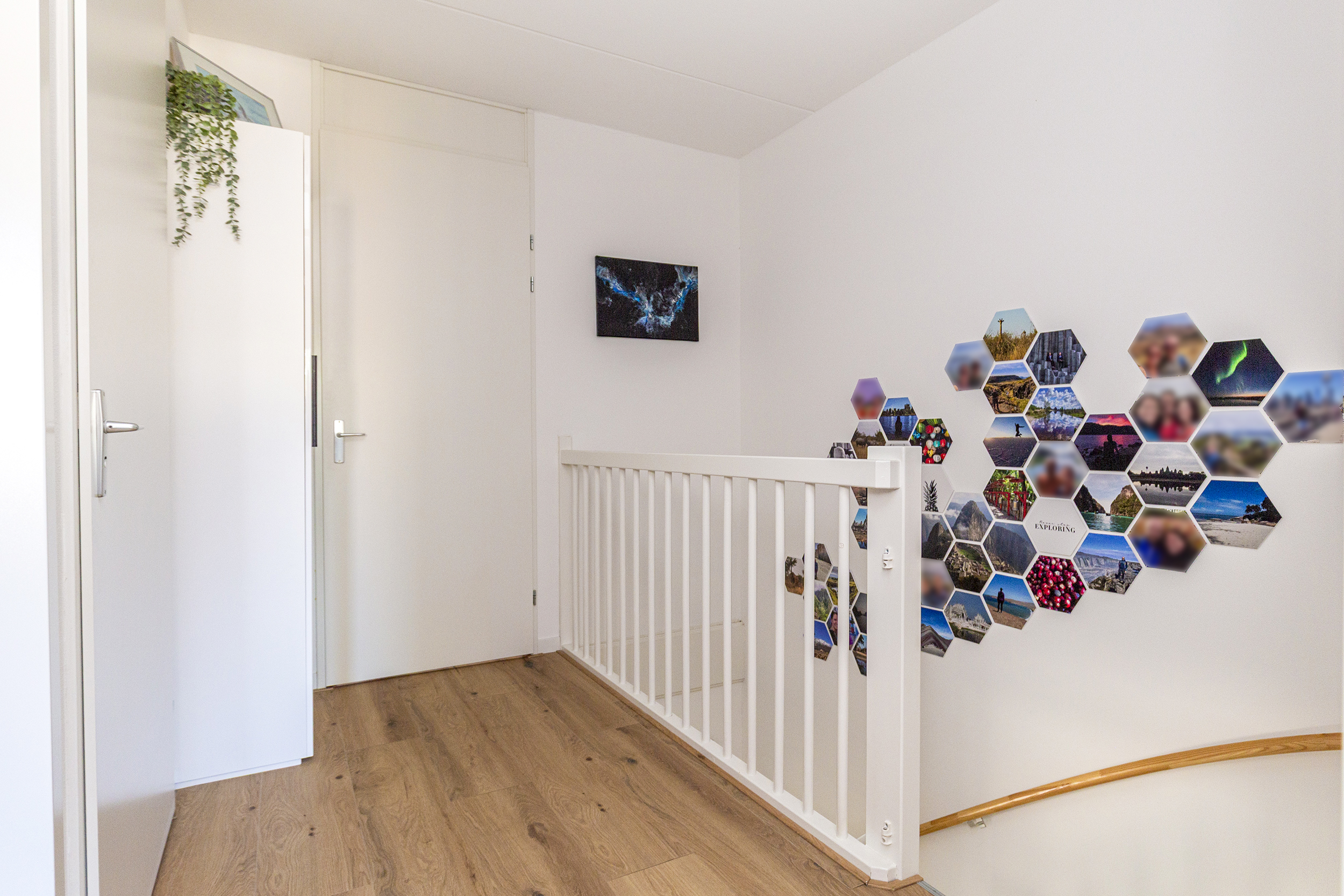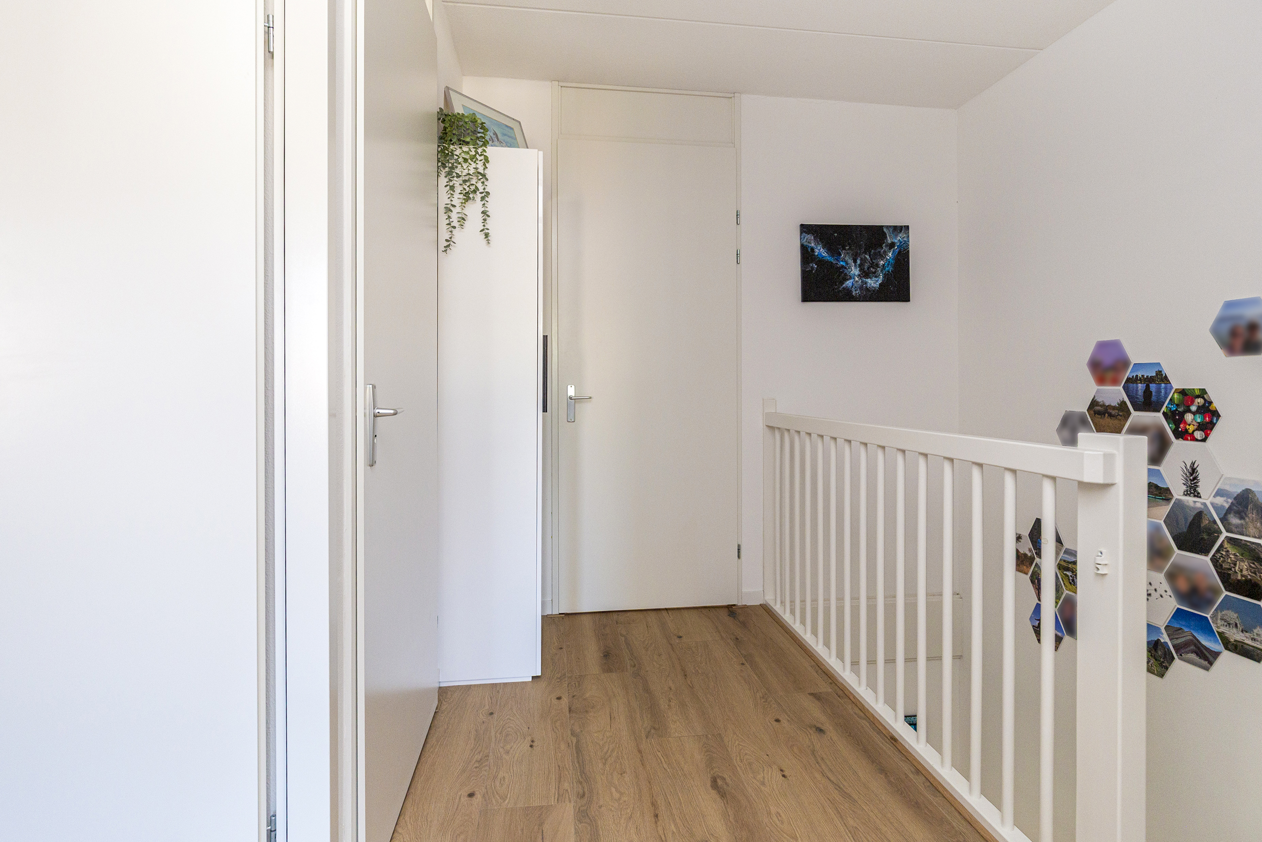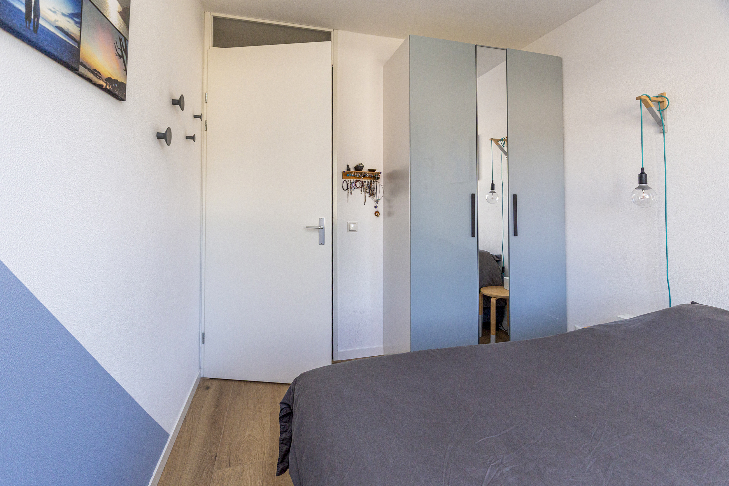 Ruime overloop met toegang tot een ruime slaapkamer aan de achterzijde en een praktische tweede slaapkamer, beide gelegen aan de achterzijde van de woning. Aan de voorzijde bevindt zich een ruime berging over de gehele breedte van de woning, voorzien van een Velux dakraam, wasmachineaansluiting en de opstelplaats voor de CV-combiketel. De badkamer is modern uitgevoerd met een douchecabine, wastafelmeubel en mechanische ventilatie.