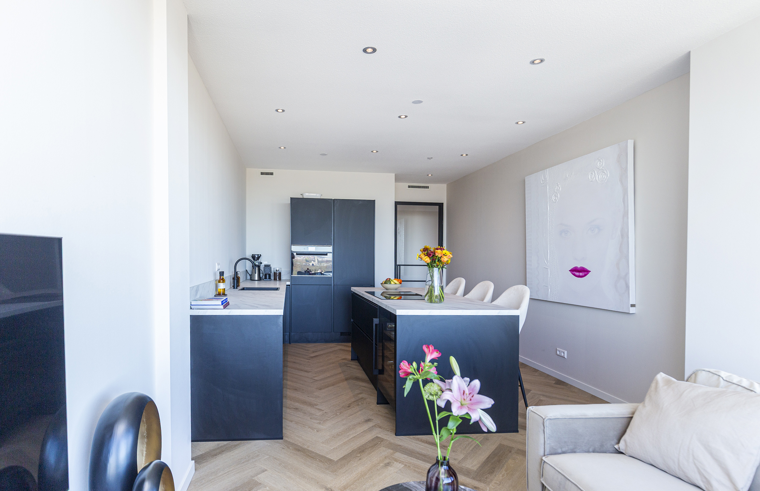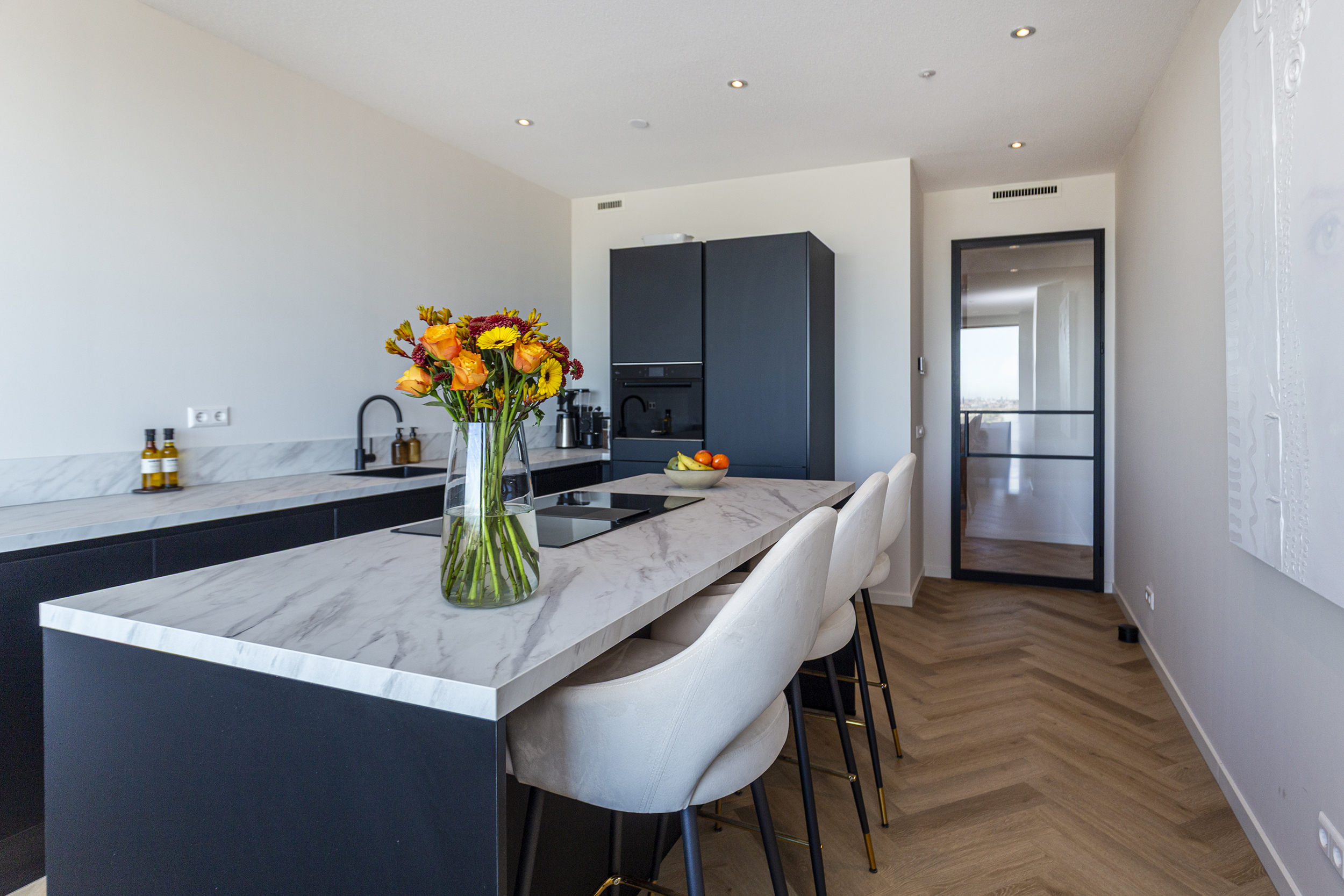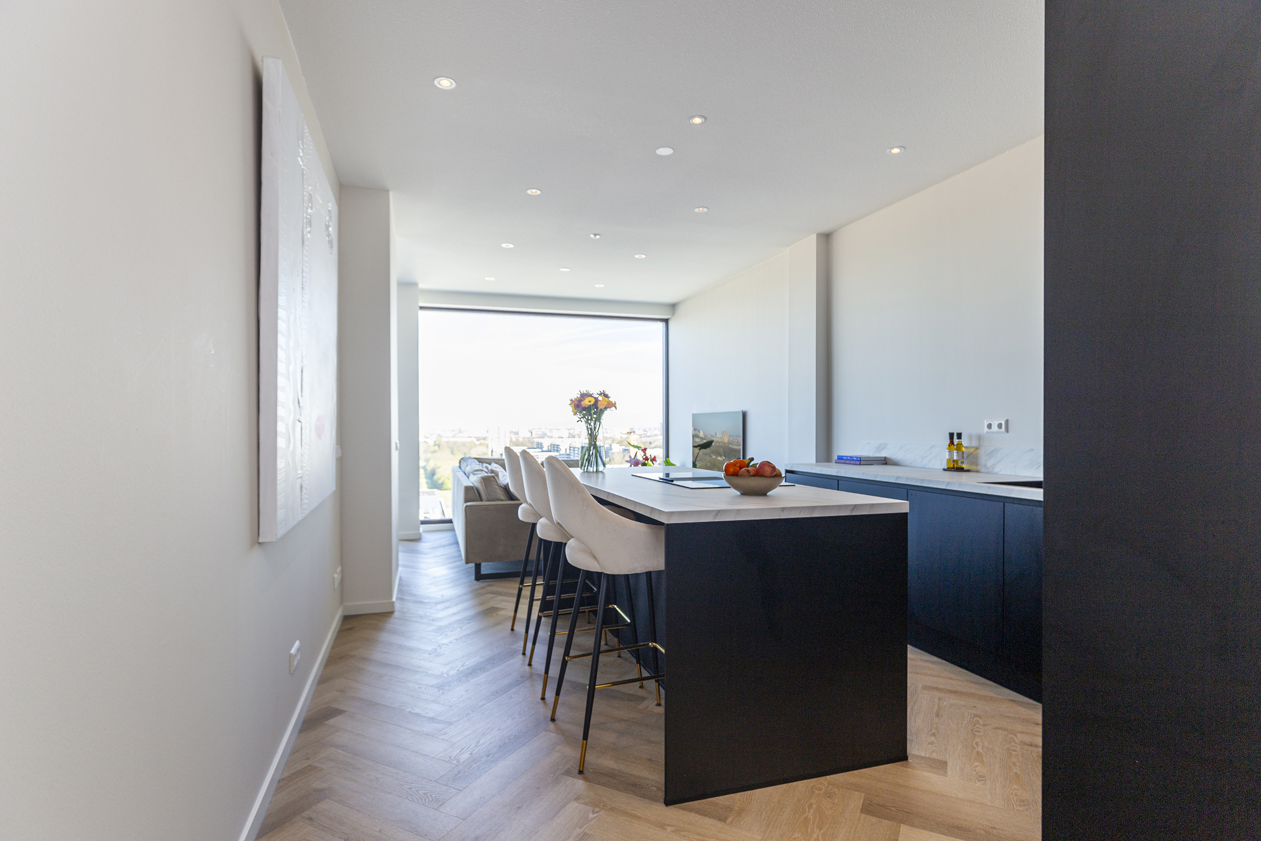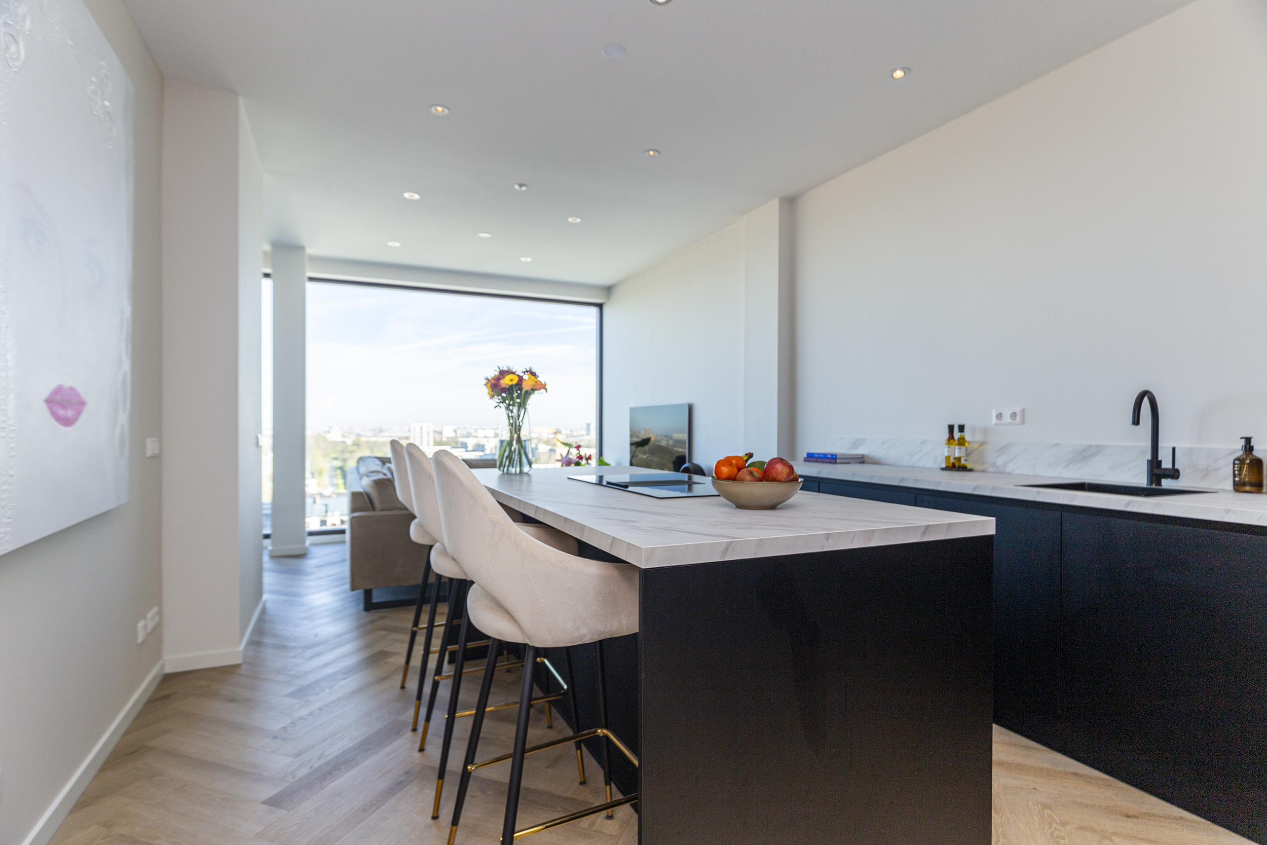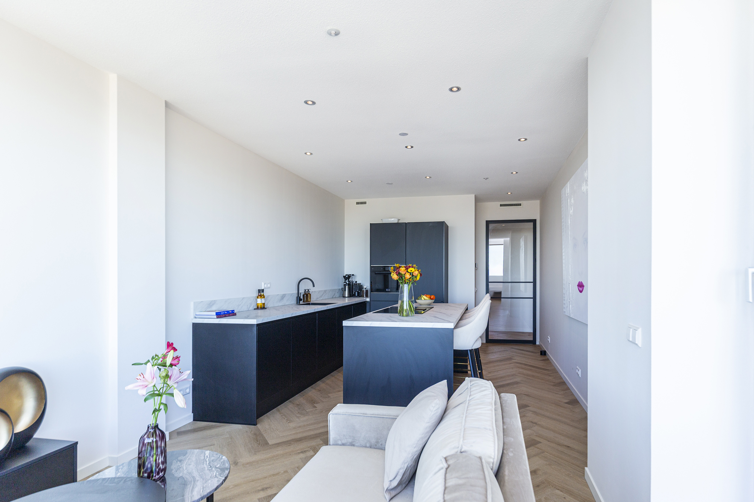 De open en ruime woon-/eetkamer is een heerlijke plek om te verblijven. Dankzij de grote raampartijen die reiken van de vloer tot het plafond geniet je hier van een indrukwekkend uitzicht over de omgeving. De open keuken met groot eiland, diverse inbouw apparatuur (waaronder een ruime wijnklimaatkast) en eetbar bied alle mogelijkheid voor gezellig koken en tafelen. Via de woonkamer stap je zo het ruime balkon/terras op waar je heerlijk kunt ontspannen en genieten van de zon. Door de ligging is zomers lang te genieten van de ondergaande zon.