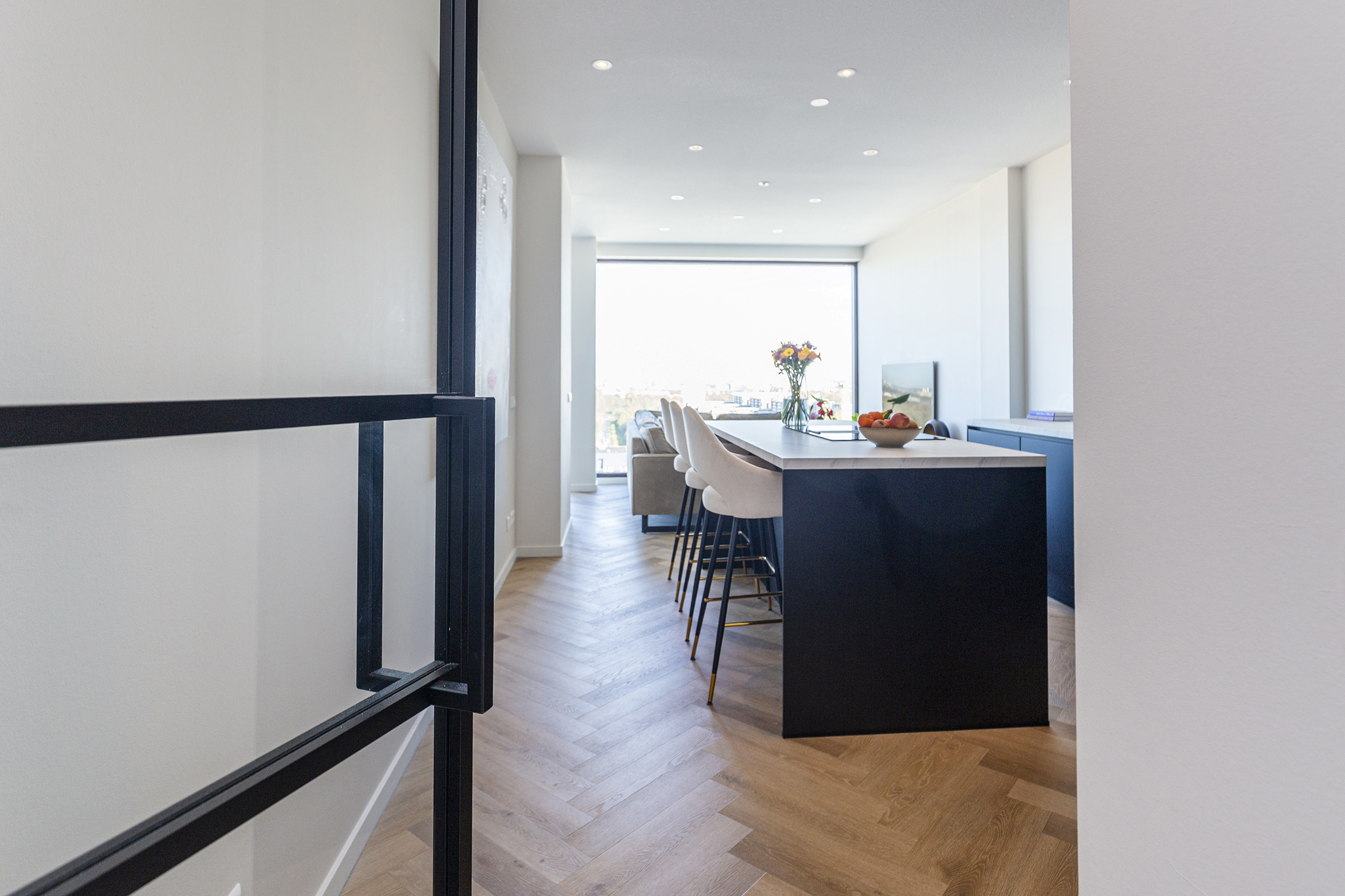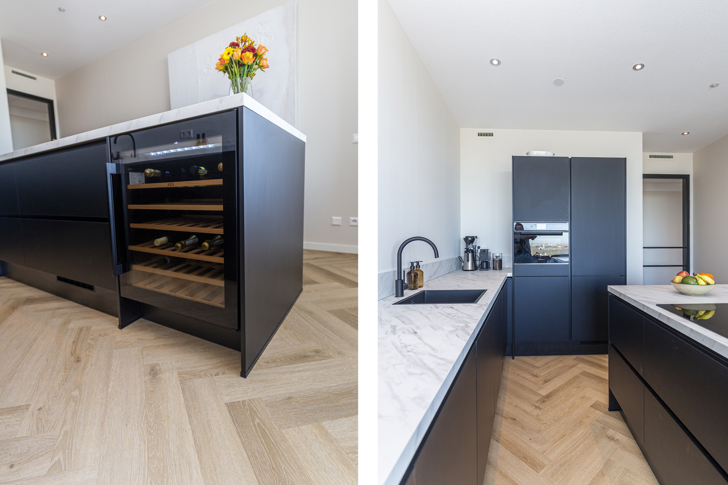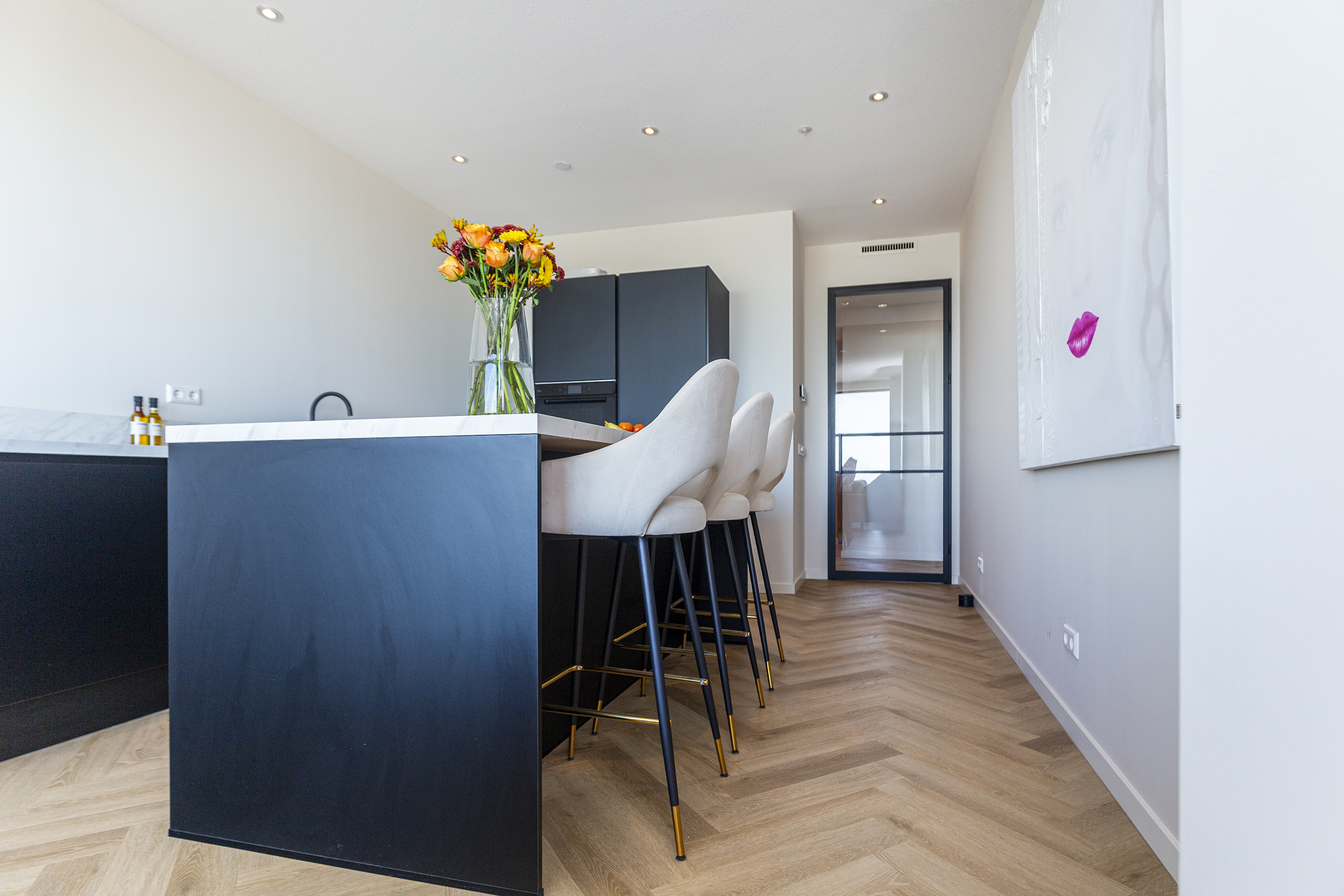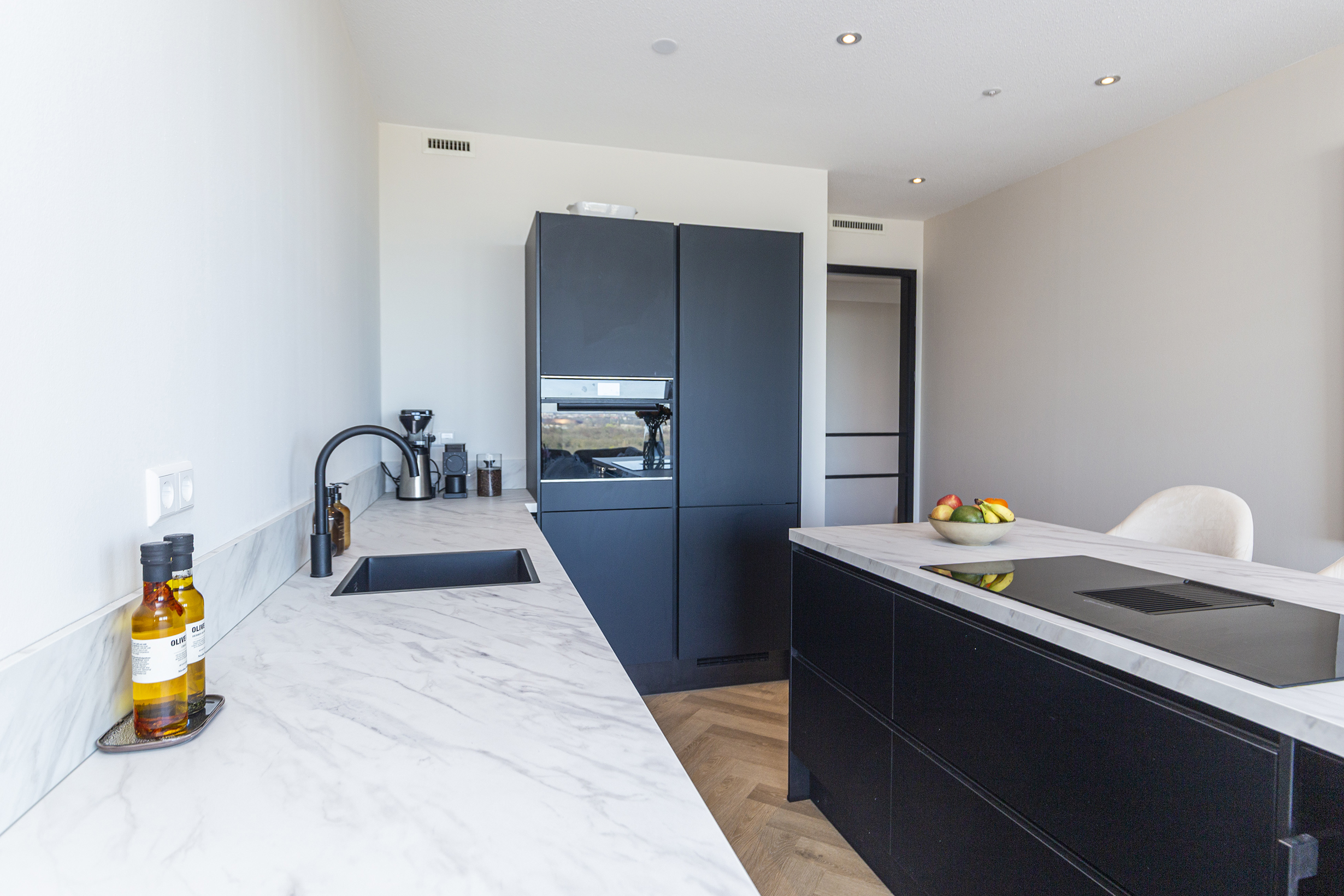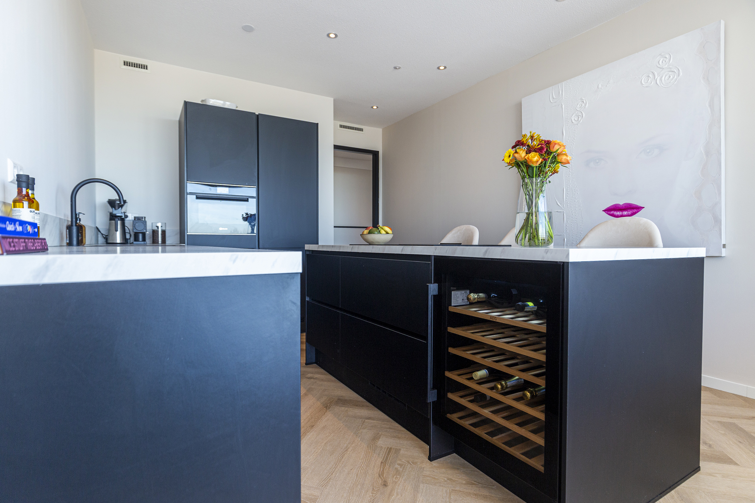 De open en ruime woon-/eetkamer is een heerlijke plek om te verblijven. Dankzij de grote raampartijen die reiken van de vloer tot het plafond geniet je hier van een indrukwekkend uitzicht over de omgeving. De open keuken met groot eiland, diverse inbouw apparatuur (waaronder een ruime wijnklimaatkast) en eetbar bied alle mogelijkheid voor gezellig koken en tafelen. Via de woonkamer stap je zo het ruime balkon/terras op waar je heerlijk kunt ontspannen en genieten van de zon. Door de ligging is zomers lang te genieten van de ondergaande zon.