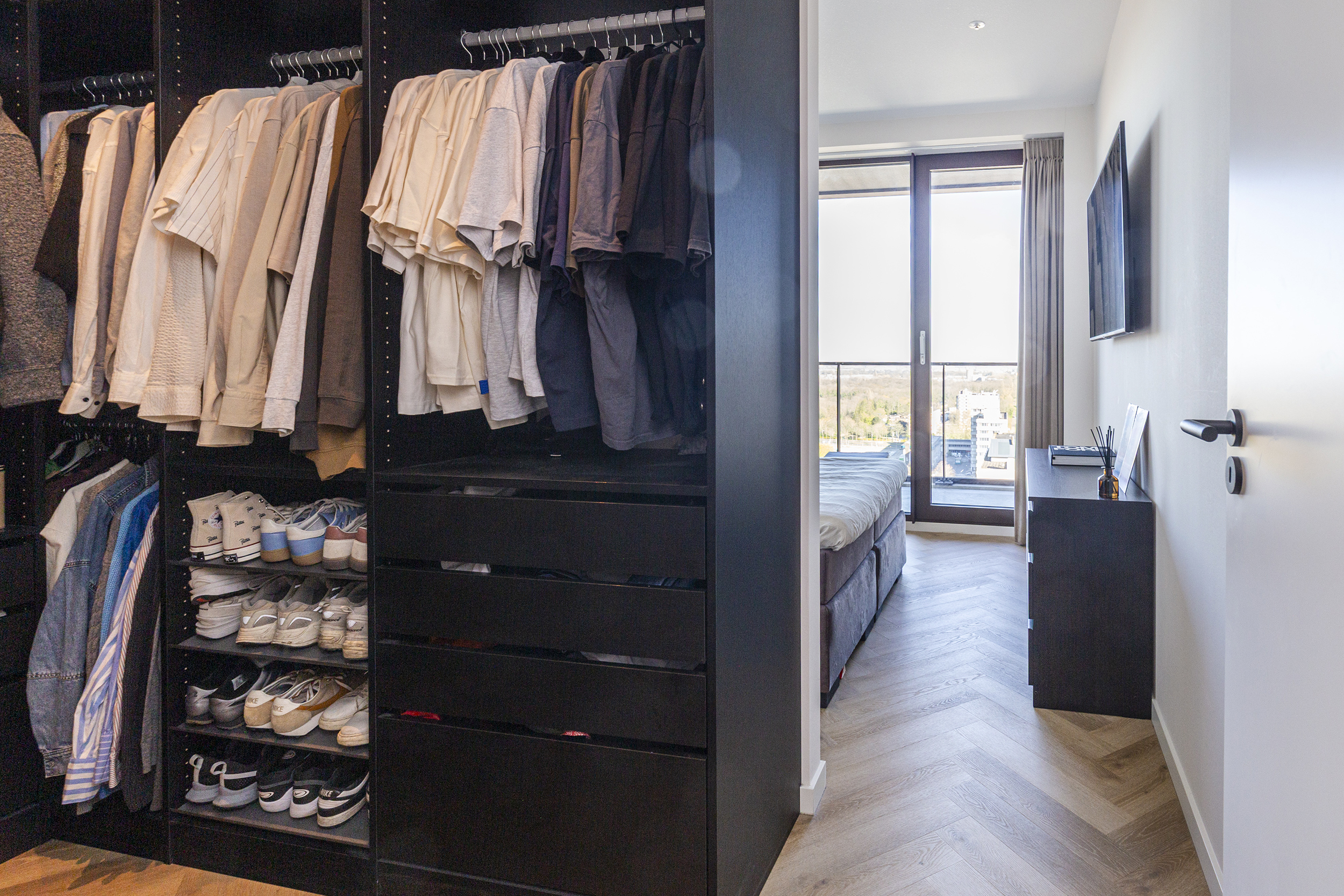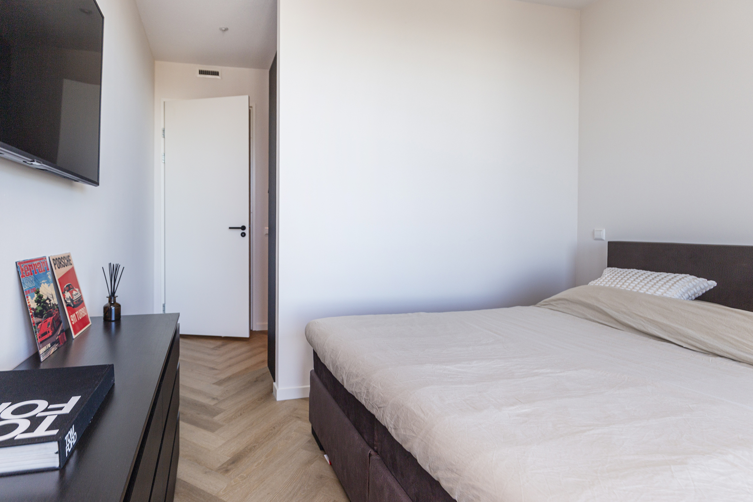 De grote slaapkamer is vanuit de hal toegankelijk en biedt bovendien direct toegang tot het balkon. De master bedroom is ingedeeld met een luxe inloopkast. De badkamer is uitgevoerd in lichte kleur tegels en bied een inloopdouche en een wastafel met meubel.