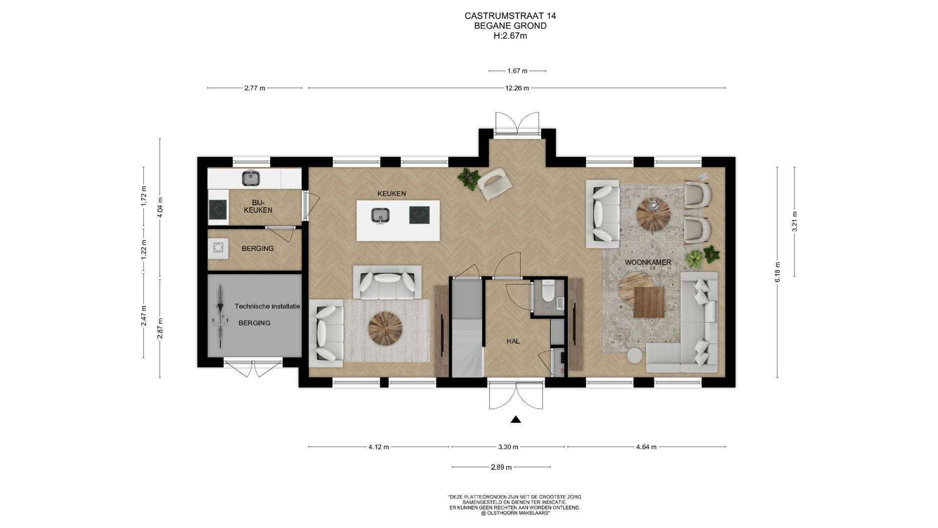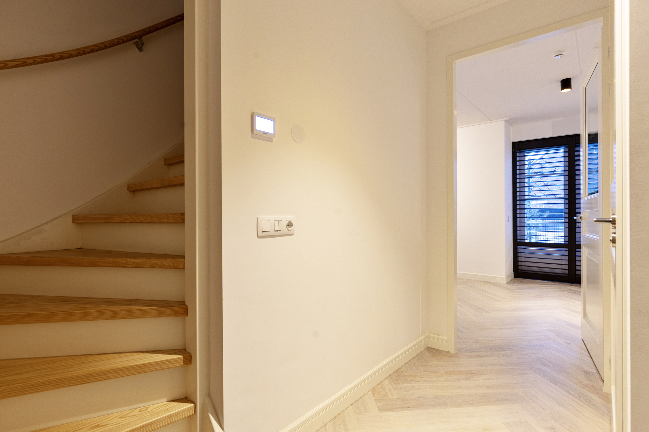 Je komt aan bij de woning via een brede oprit waar met gemak meerdere auto’s op je eigen terrein kunnen parkeren. Via de voordeur stap je binnen in een lichte en ruime hal met toegang tot de meterkast, een modern afgewerkt toilet en de trap naar boven.