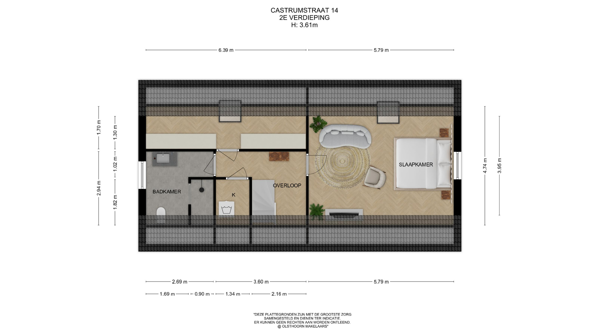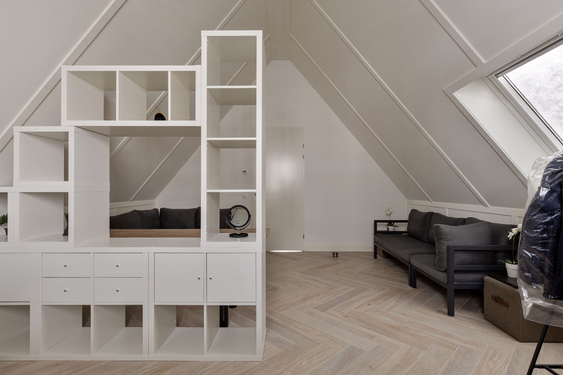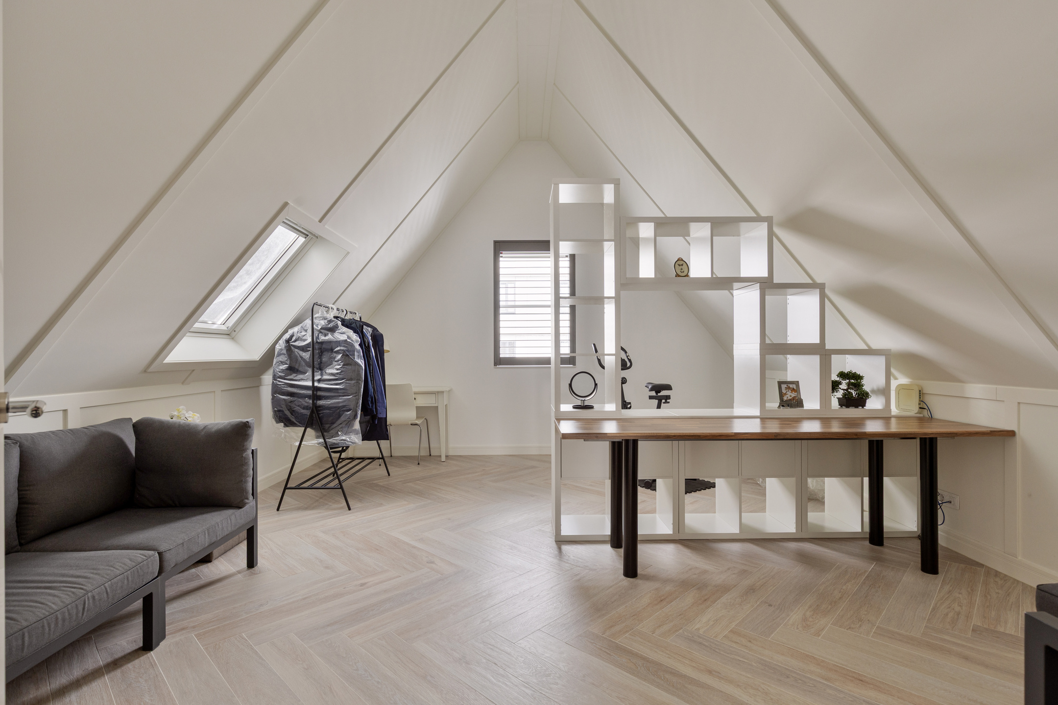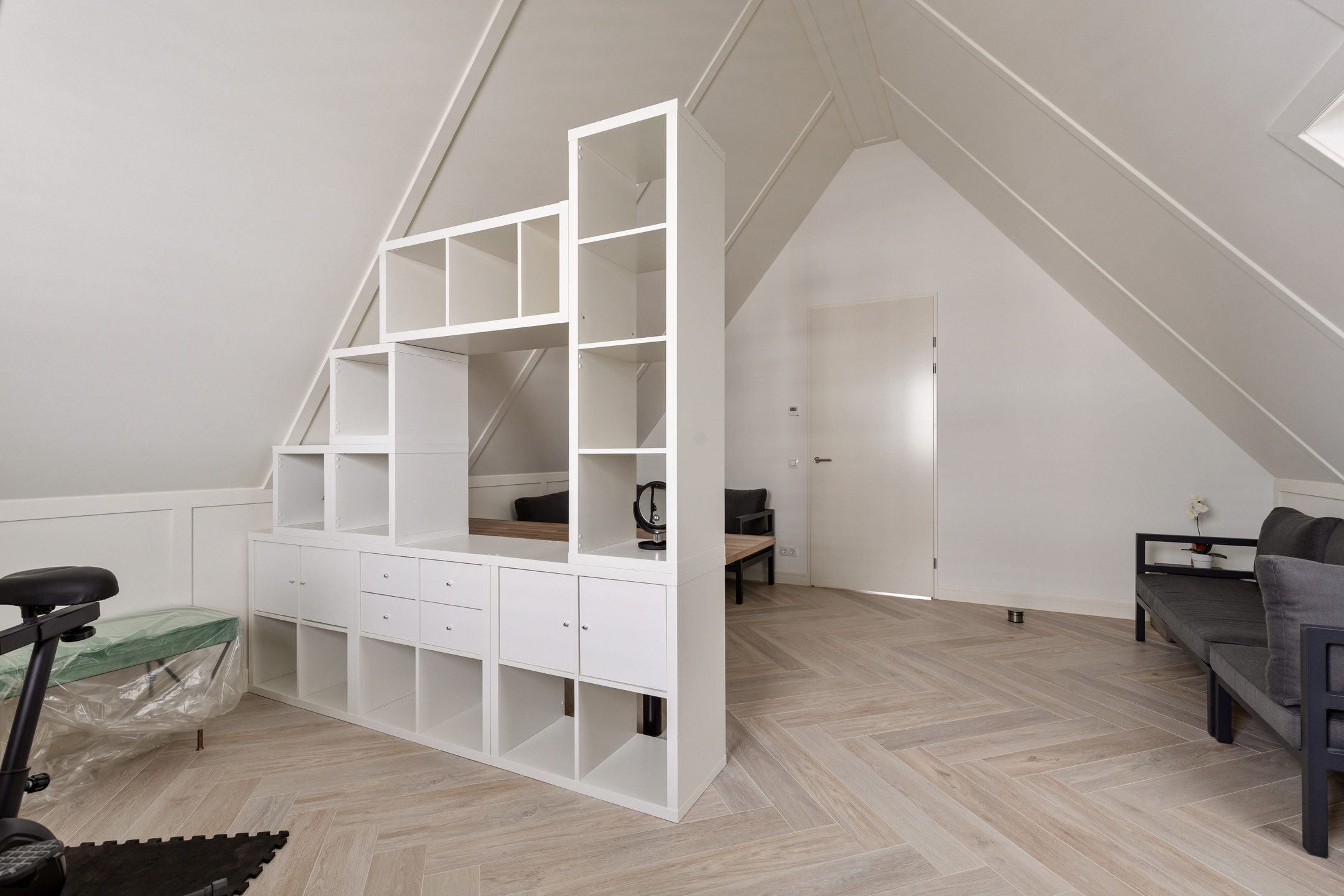 De zolderverdieping is een volwaardige woonlaag en biedt veel extra ruimte. Hier bevindt zich de vierde slaapkamer. De kamer heeft een prettig formaat. Daarnaast is er op deze verdieping een tweede badkamer aanwezig met een inloopdouche, wastafel en toilet – ideaal voor gasten of gezinsleden die deze etage gebruiken. Op de overloop bevindt zich een aparte kast met de aansluitingen voor de wasmachine en droger, netjes weggewerkt uit het zicht. Daarnaast is er veel opbergruimte.