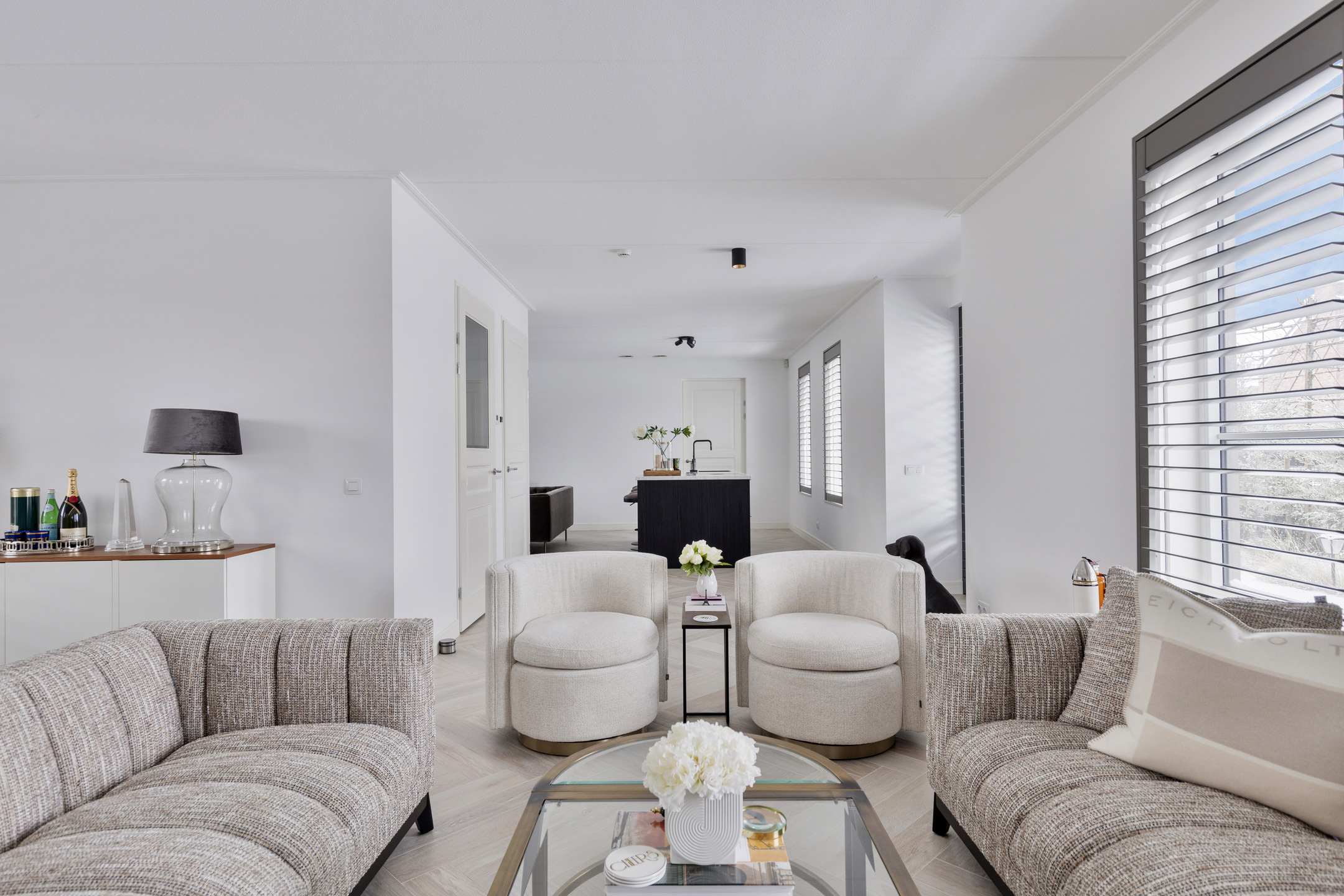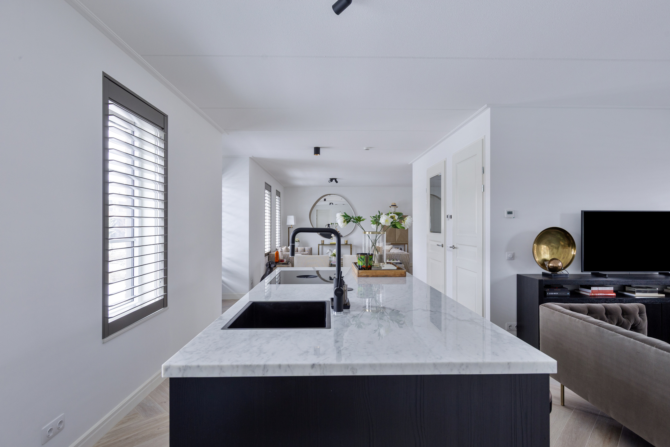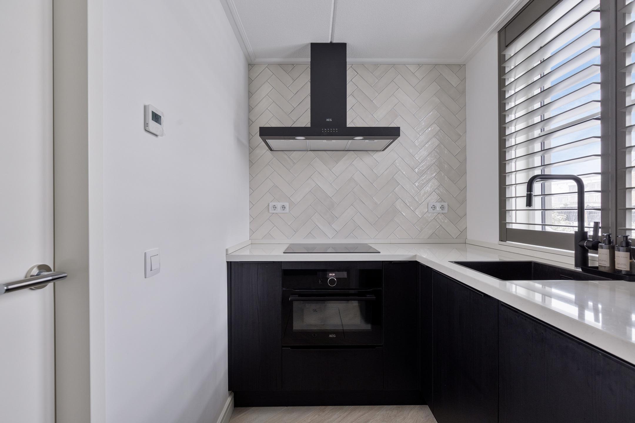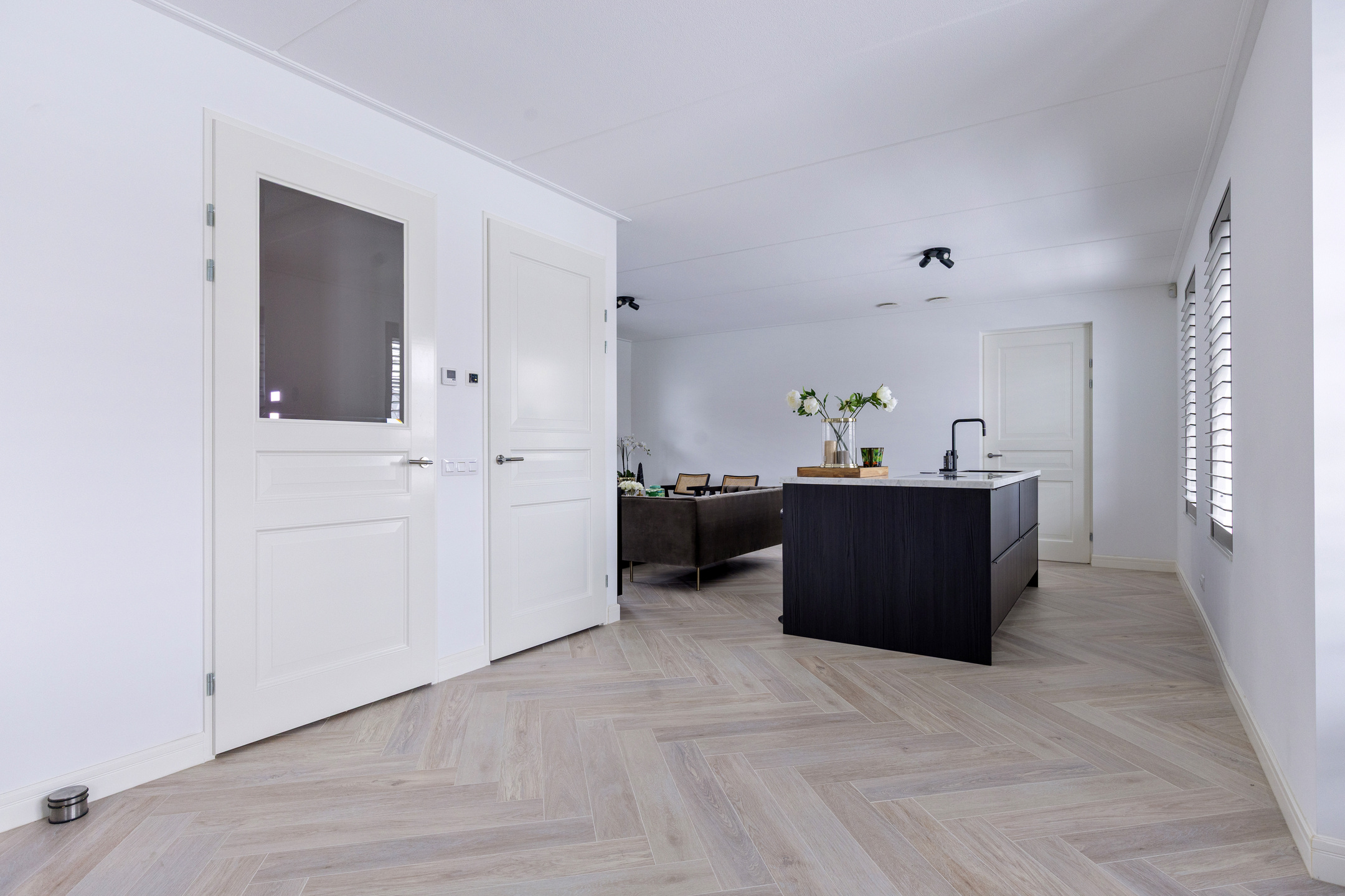 De woonkamer bevindt zich aan de rechterzijde van de woning en is royaal opgezet. De open keuken aan de andere zijde is strak vormgegeven, voorzien van een modern keukenblok met inbouwapparatuur en biedt volop werkruimte. Hier is meer dan genoeg plek voor een grote eettafel of een tweede zithoek – perfect voor gezellige diners of lange avonden met familie en vrienden.
