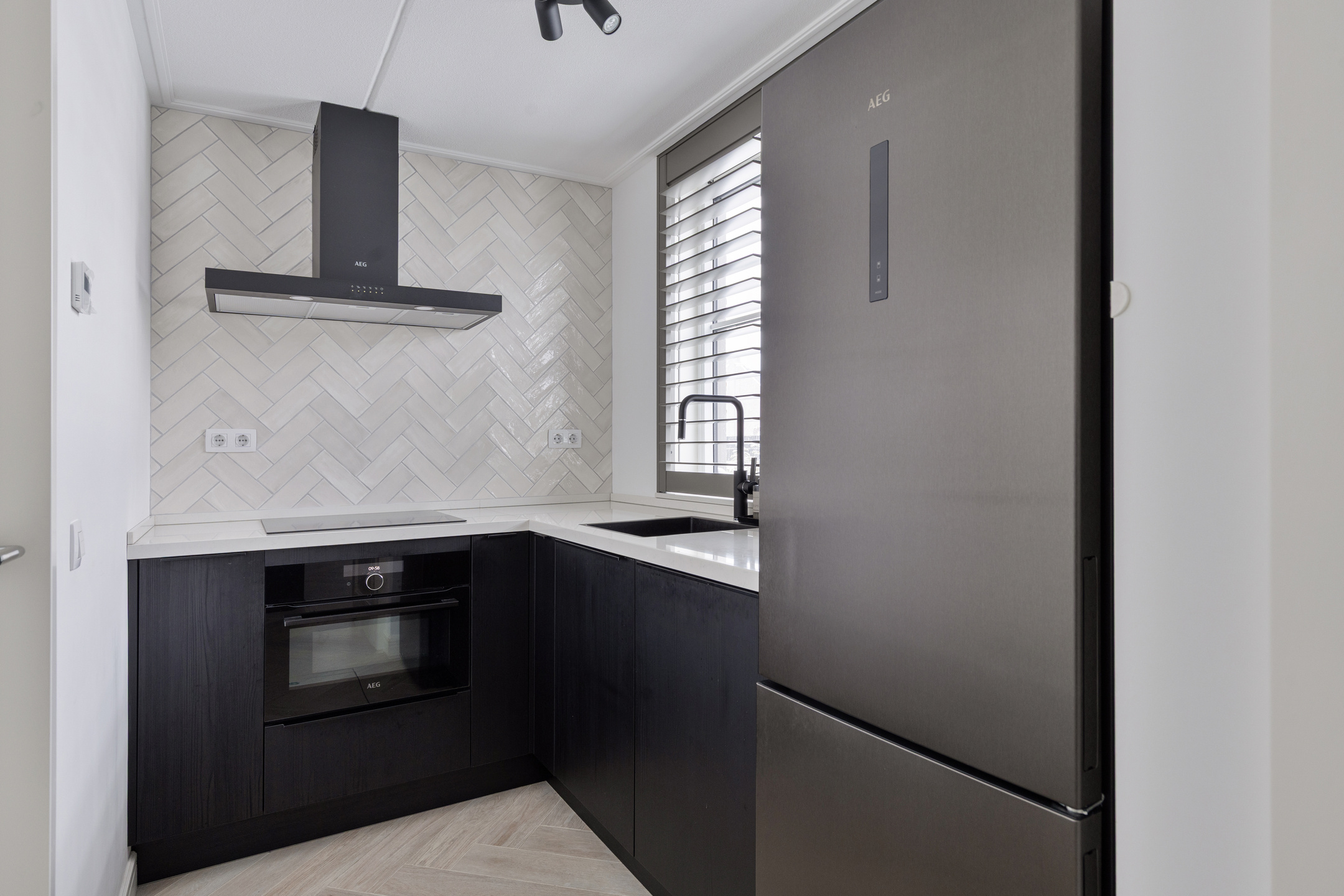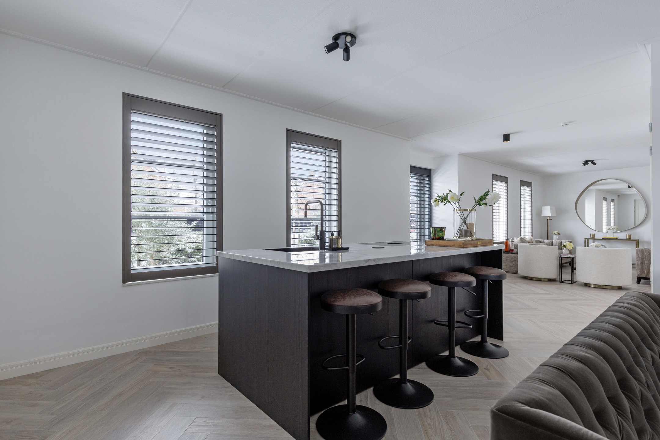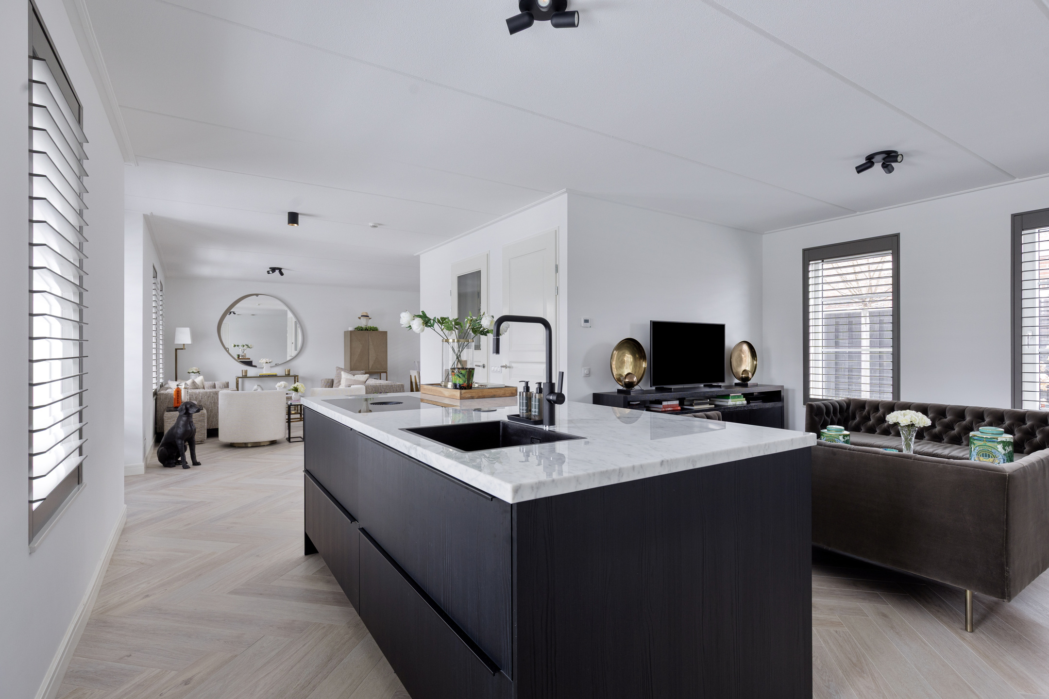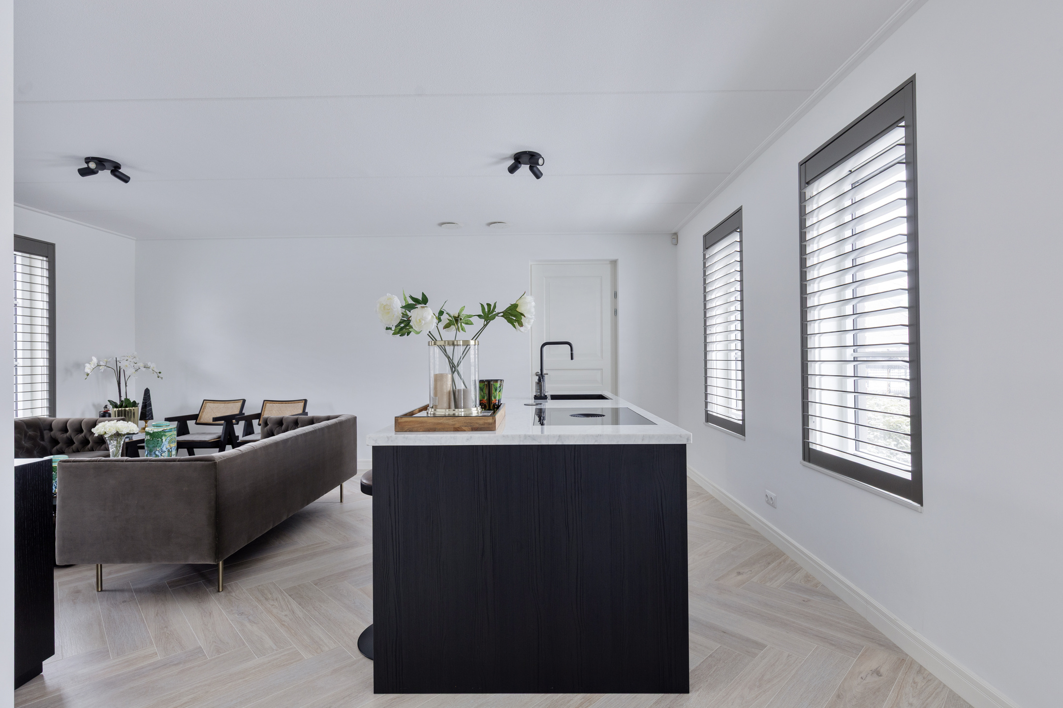 De woonkamer bevindt zich aan de rechterzijde van de woning en is royaal opgezet. De open keuken aan de andere zijde is strak vormgegeven, voorzien van een modern keukenblok met inbouwapparatuur en biedt volop werkruimte. Hier is meer dan genoeg plek voor een grote eettafel of een tweede zithoek – perfect voor gezellige diners of lange avonden met familie en vrienden.