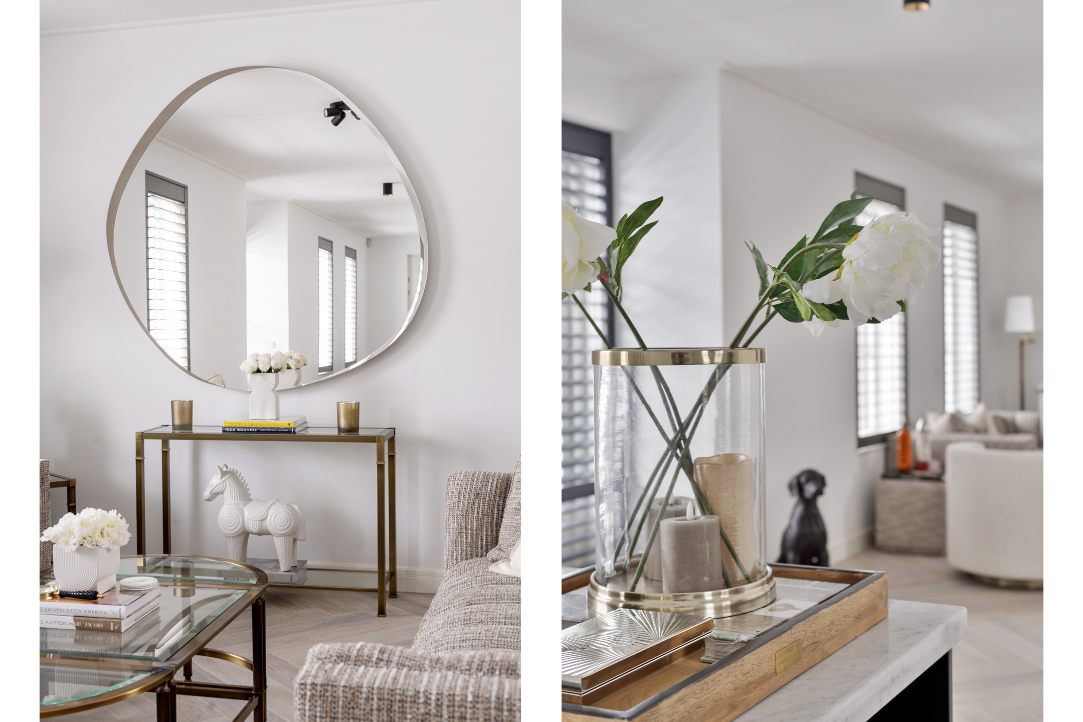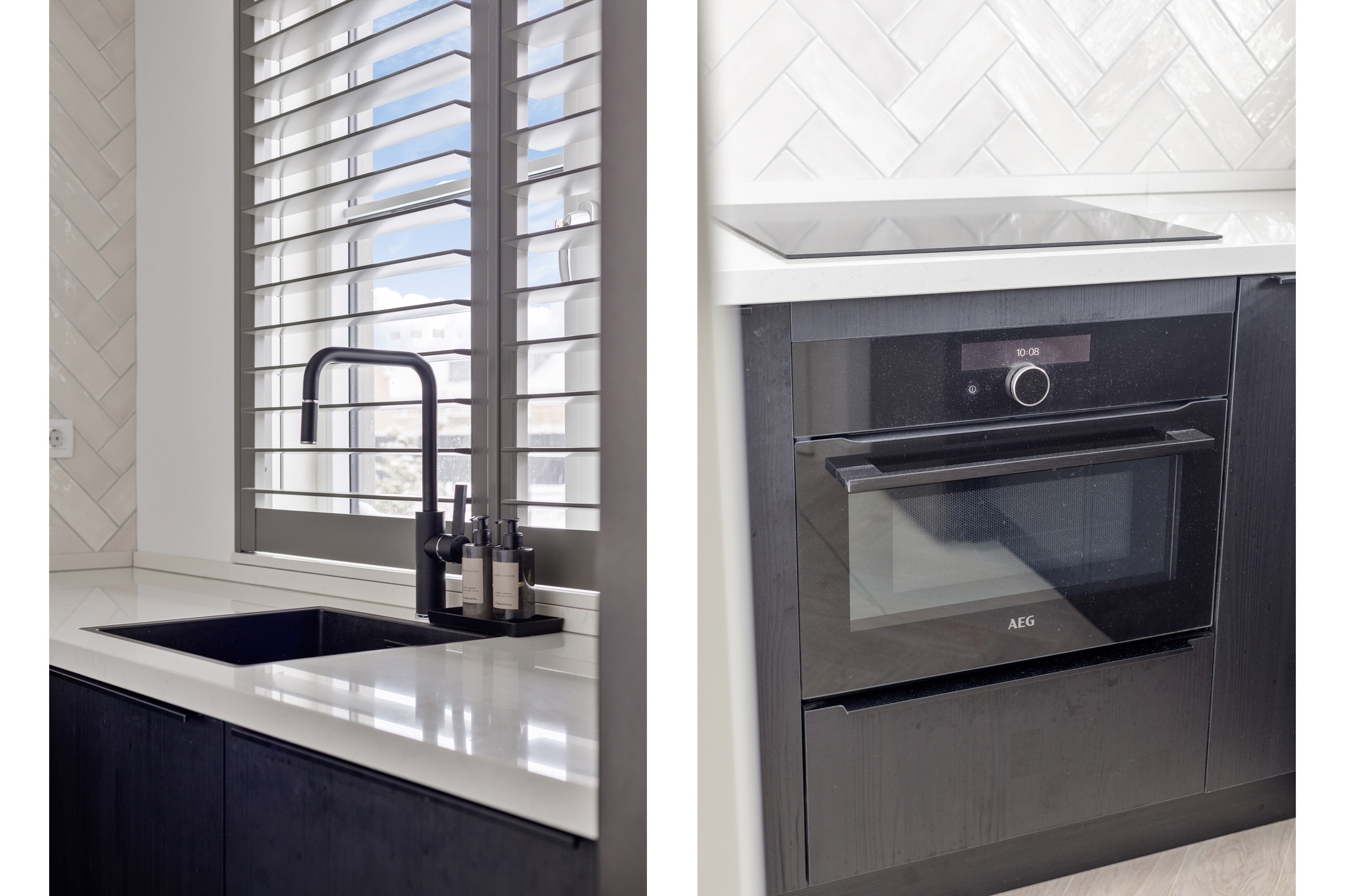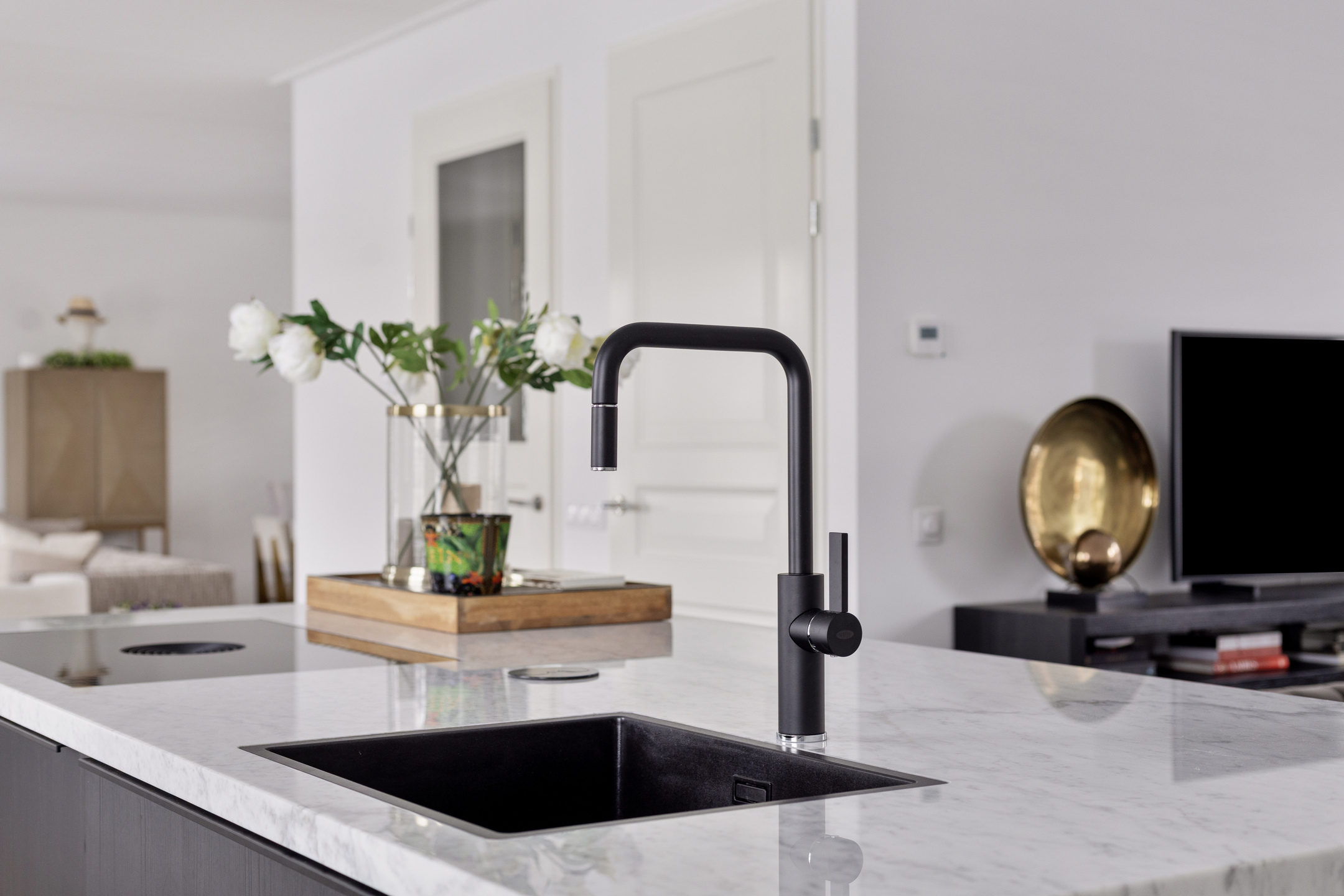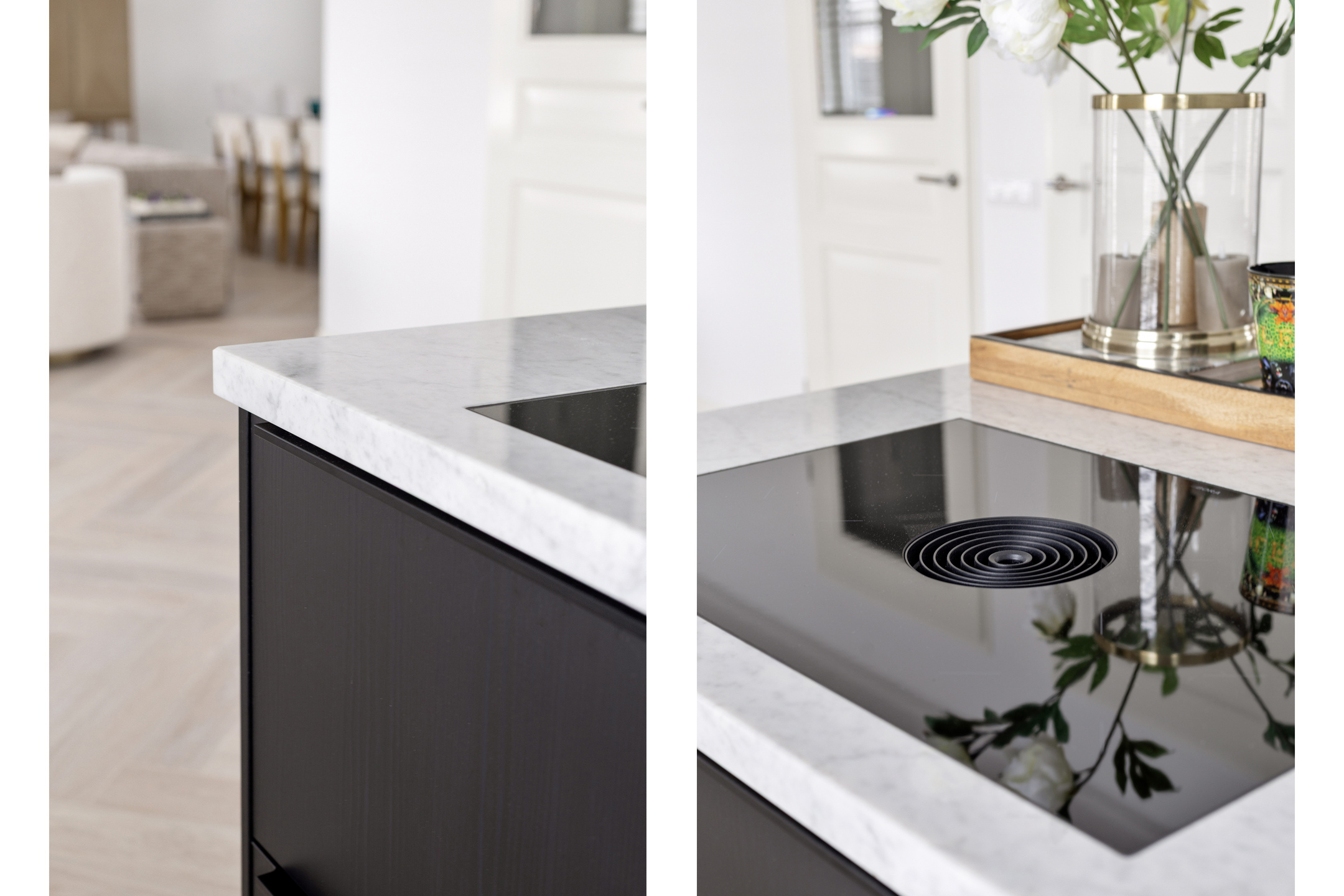 De woonkamer bevindt zich aan de rechterzijde van de woning en is royaal opgezet. De open keuken aan de andere zijde is strak vormgegeven, voorzien van een modern keukenblok met inbouwapparatuur en biedt volop werkruimte. Hier is meer dan genoeg plek voor een grote eettafel of een tweede zithoek – perfect voor gezellige diners of lange avonden met familie en vrienden.
