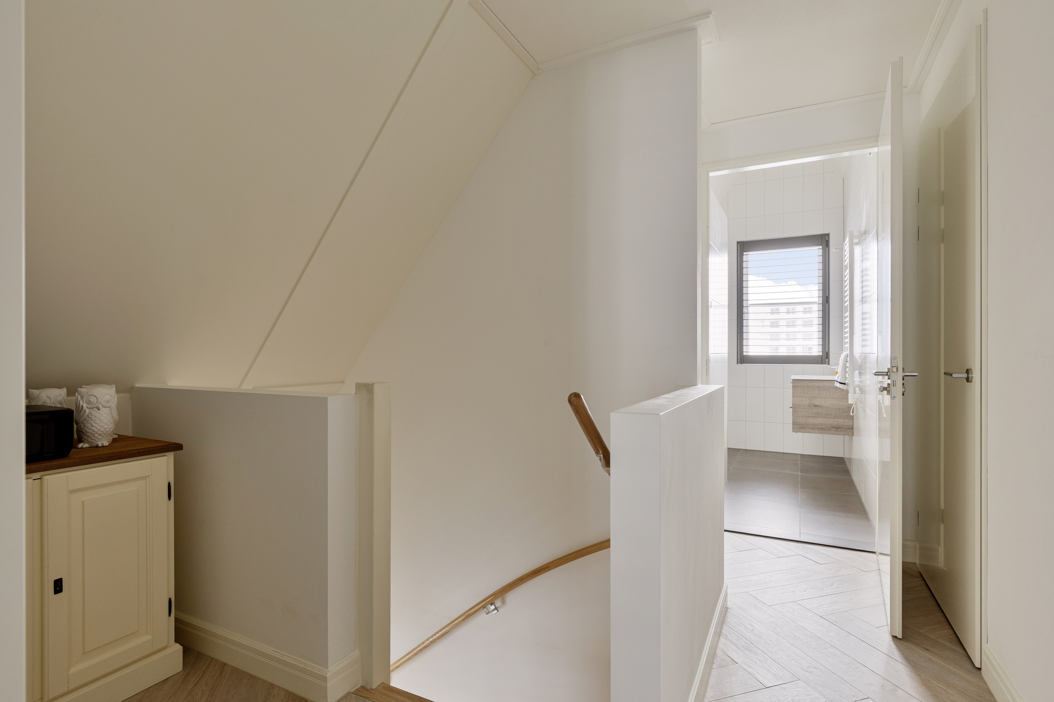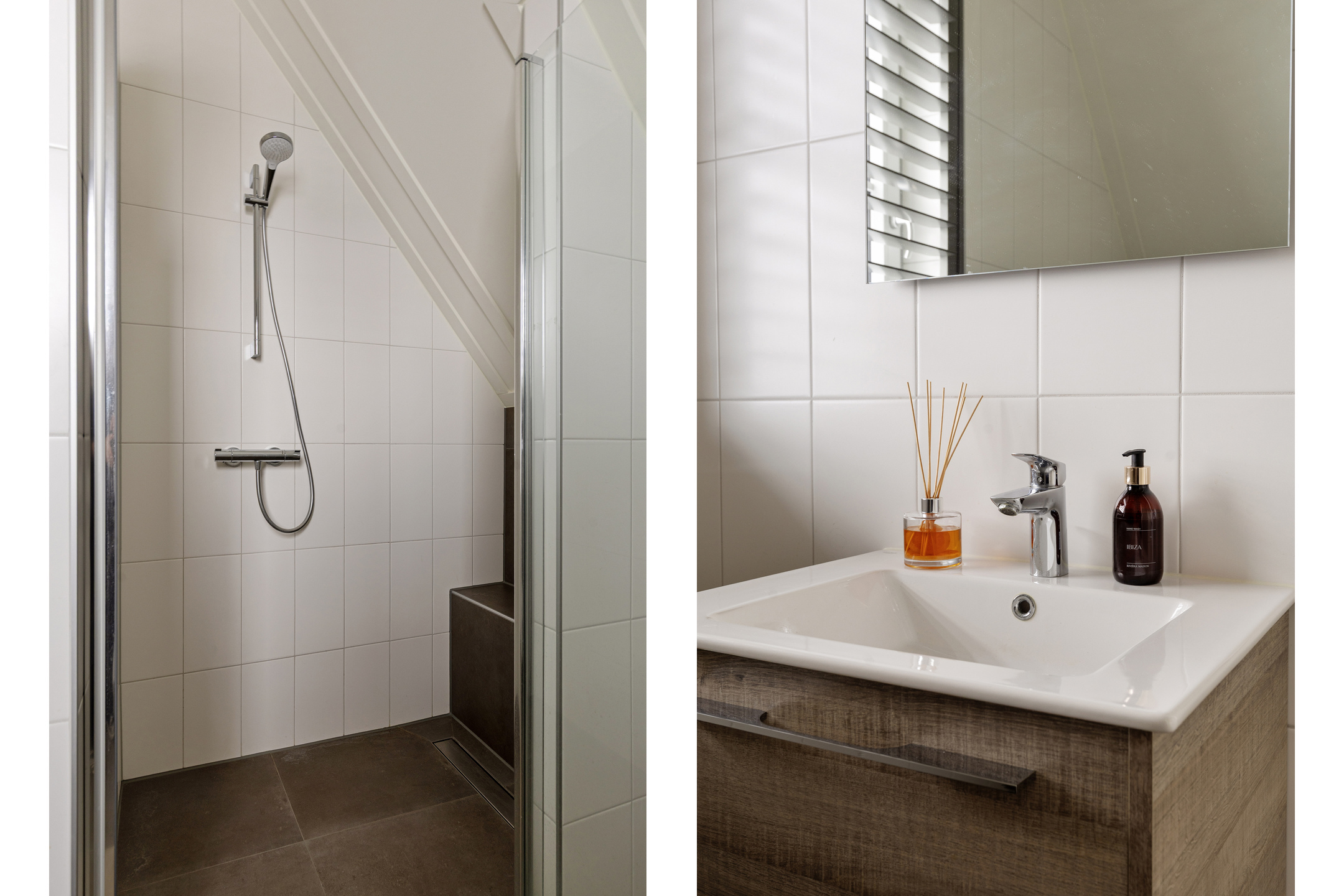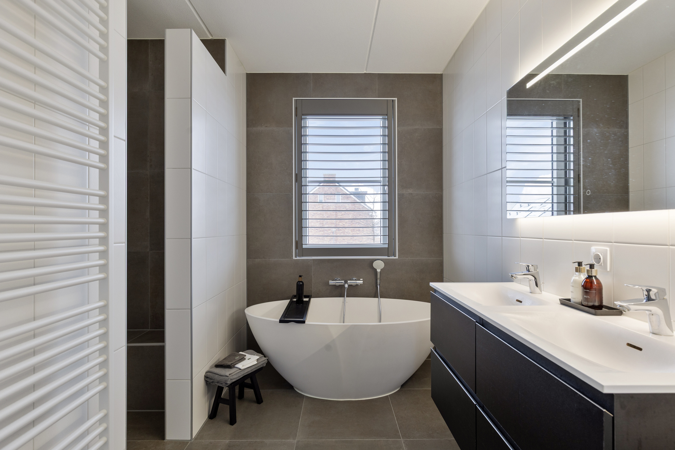 De badkamer is luxe afgewerkt en voorzien van een inloopdouche, een ligbad en een dubbele wastafel met meubel. Het separate toilet bevindt zich op de overloop.