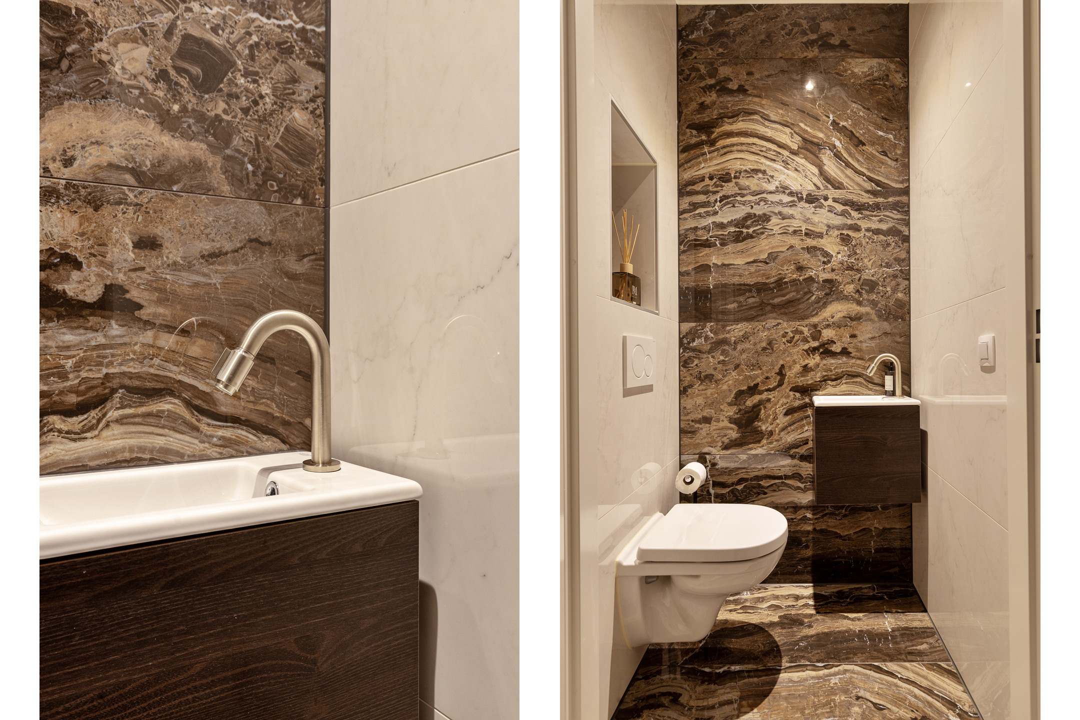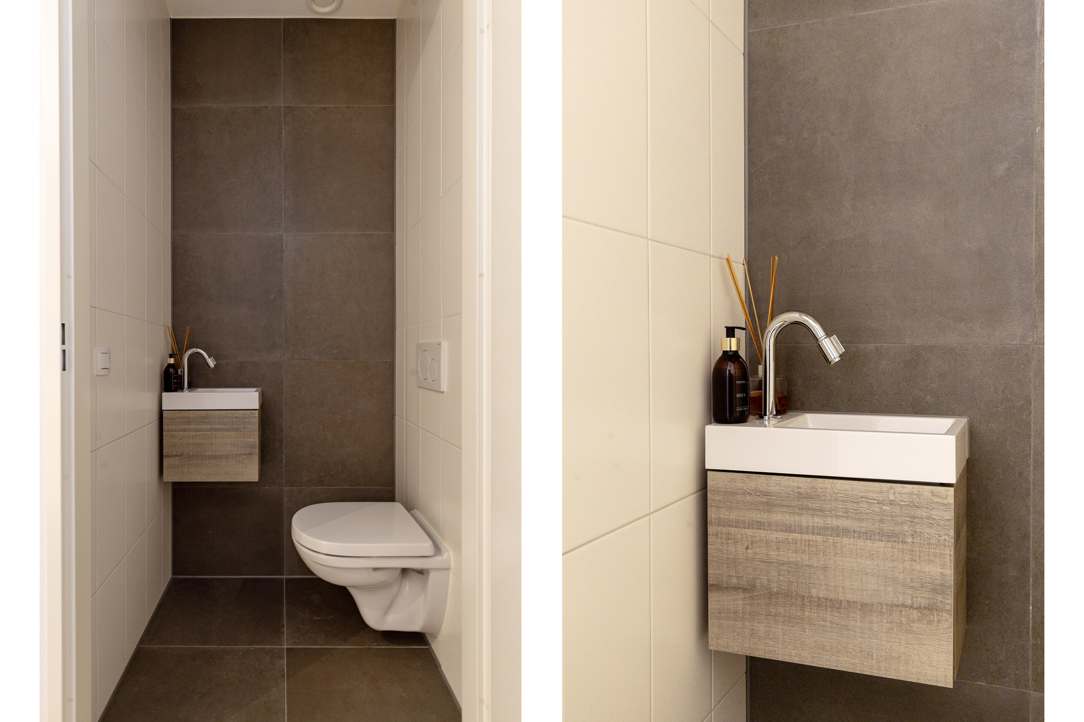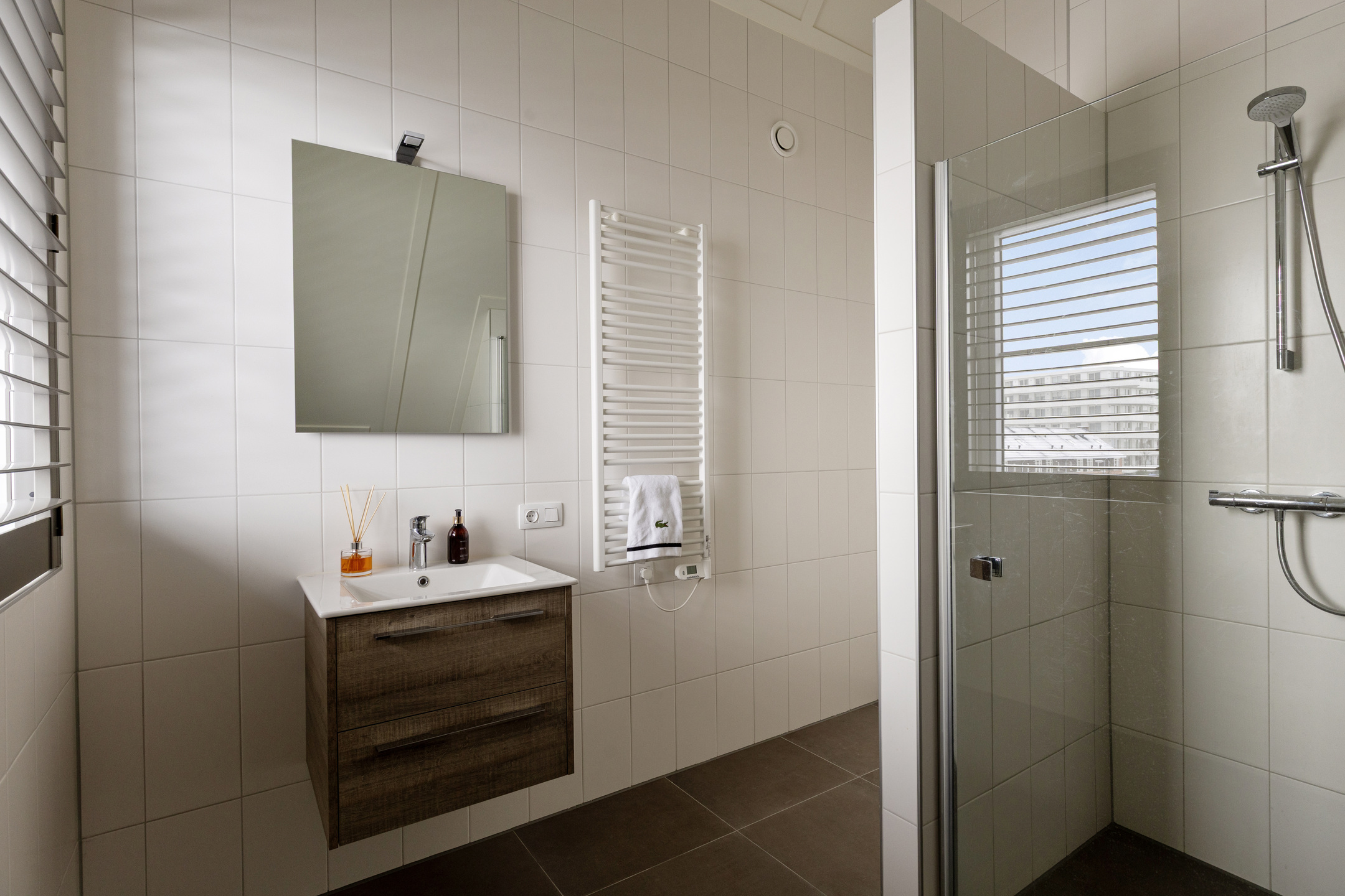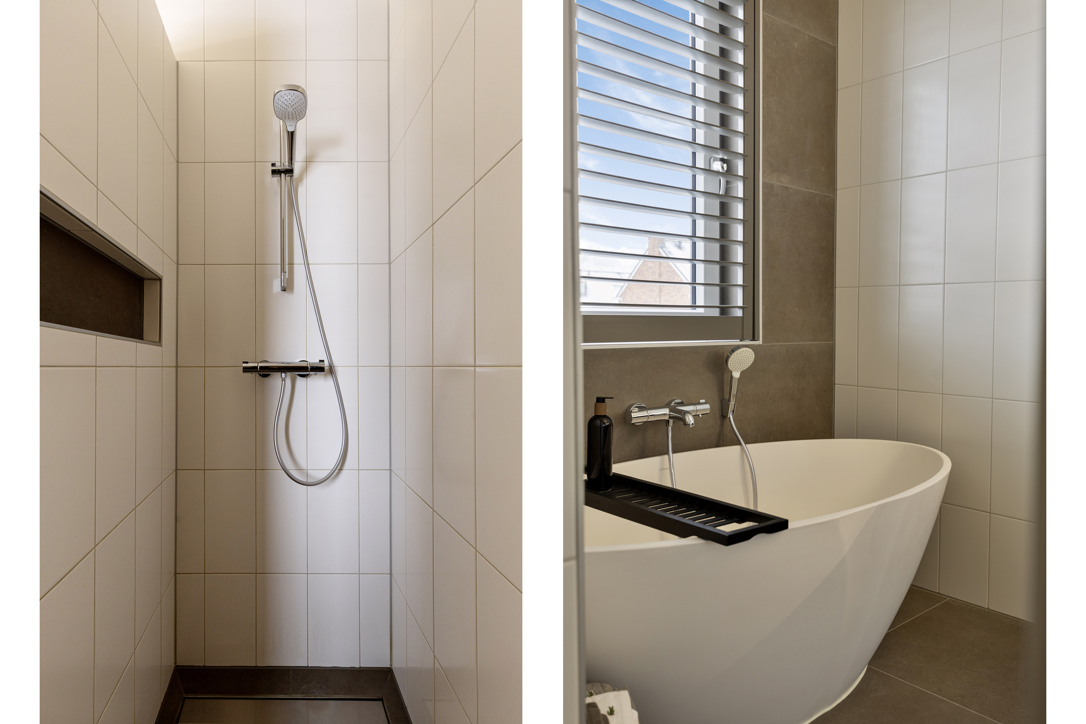 De badkamer is luxe afgewerkt en voorzien van een inloopdouche, een ligbad en een dubbele wastafel met meubel. Het separate toilet bevindt zich op de overloop.