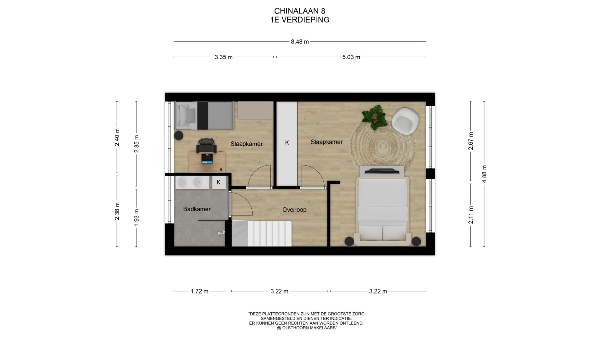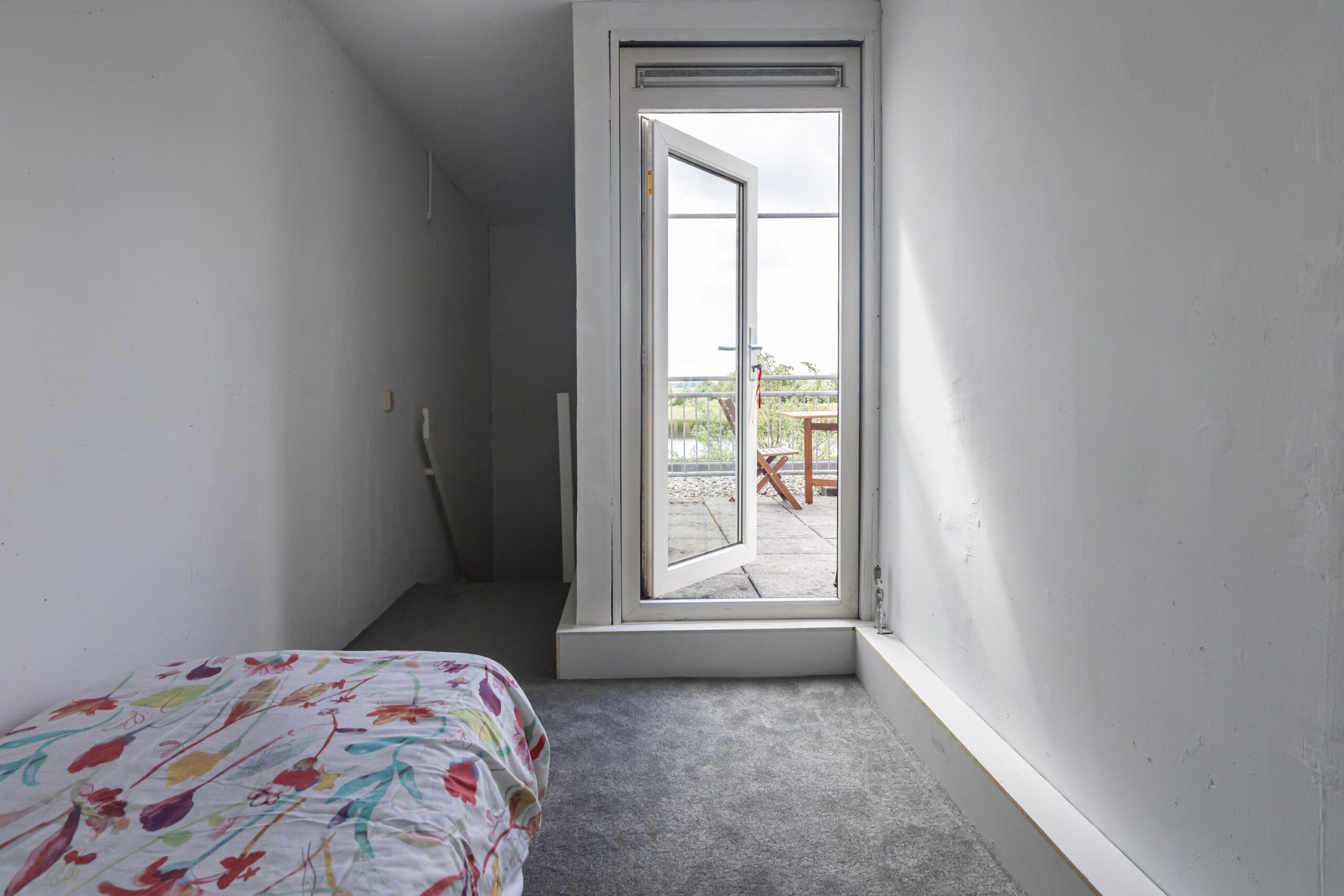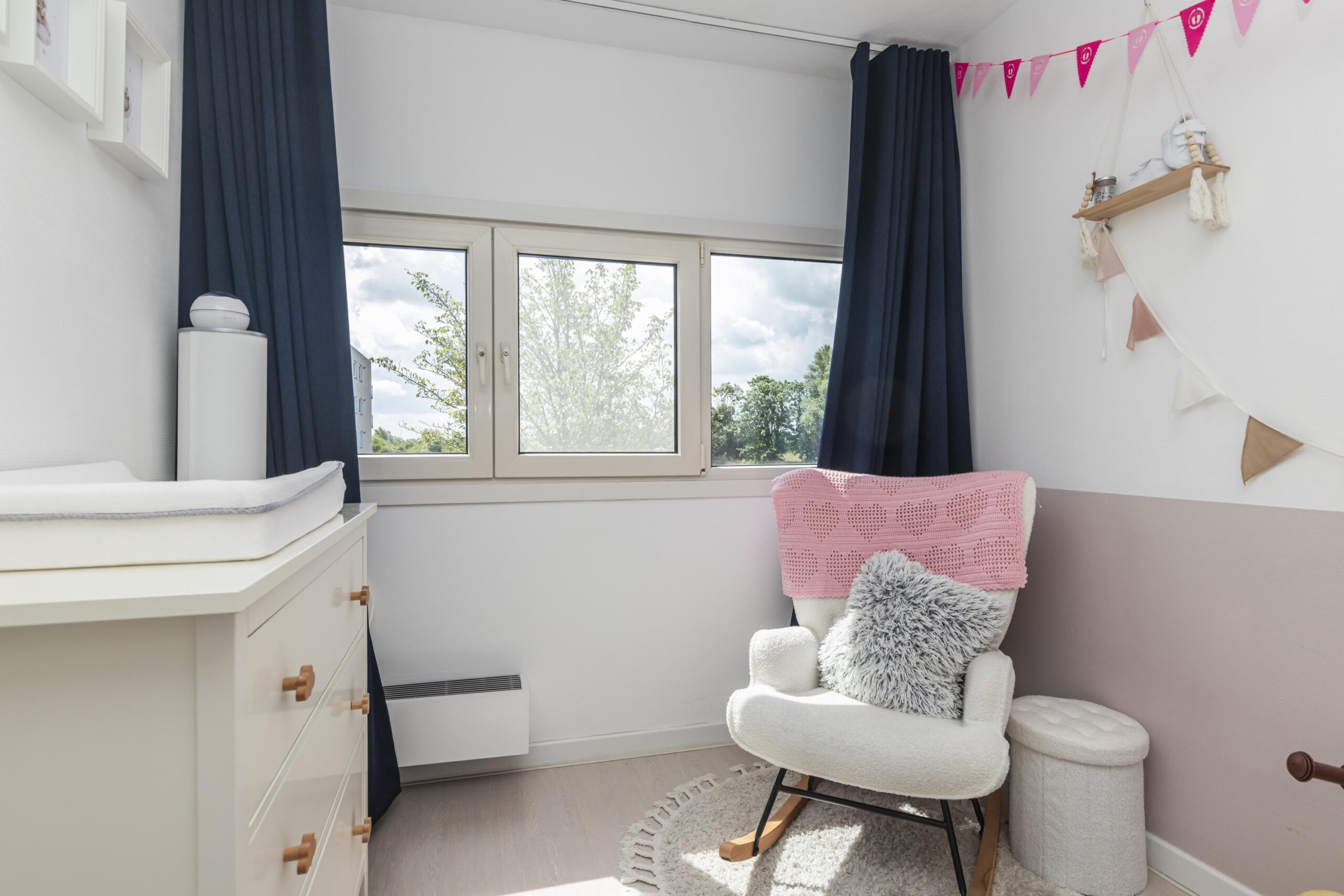 De oorspronkelijke drie slaapkamers zijn verbouwd tot twee ruime slaapkamers. De zeer ruime hoofdslaapkamer bevindt zich aan de achterzijde van de woning en is voorzien van een inbouwkast. De tweede slaapkamer aan de voorzijde is eveneens van goed formaat. De vernieuwde badkamer is met inloopdouche en wastafelmeubel strak en modern ingericht, wat de ruimte een frisse en royale uitstraling geeft.