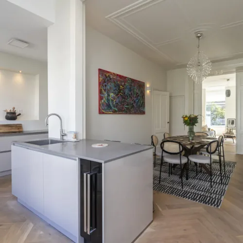 Vanaf de straat leidt de trap naar de eerste verdieping, waar de overloop toegang geeft tot alle vertrekken. Aan de voorzijde bevindt zich een slaapkamer, terwijl de sfeervolle woon- en eetkamer, gescheiden door karakteristieke en-suite deuren, de gehele lengte van de woning bestrijken. Achterin ligt de eetkamer met moderne keuken, uitgerust met diverse inbouwapparatuur zoals een koel-vriescombinatie, oven, magnetron, vaatwasser, wijnkoeling en Quooker, plus volop bergruimte. Vanuit de keuken is het eerste balkon bereikbaar.