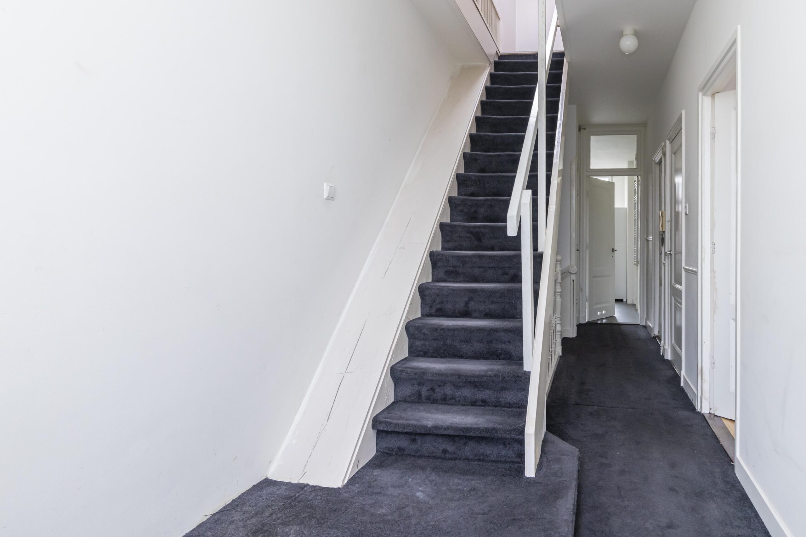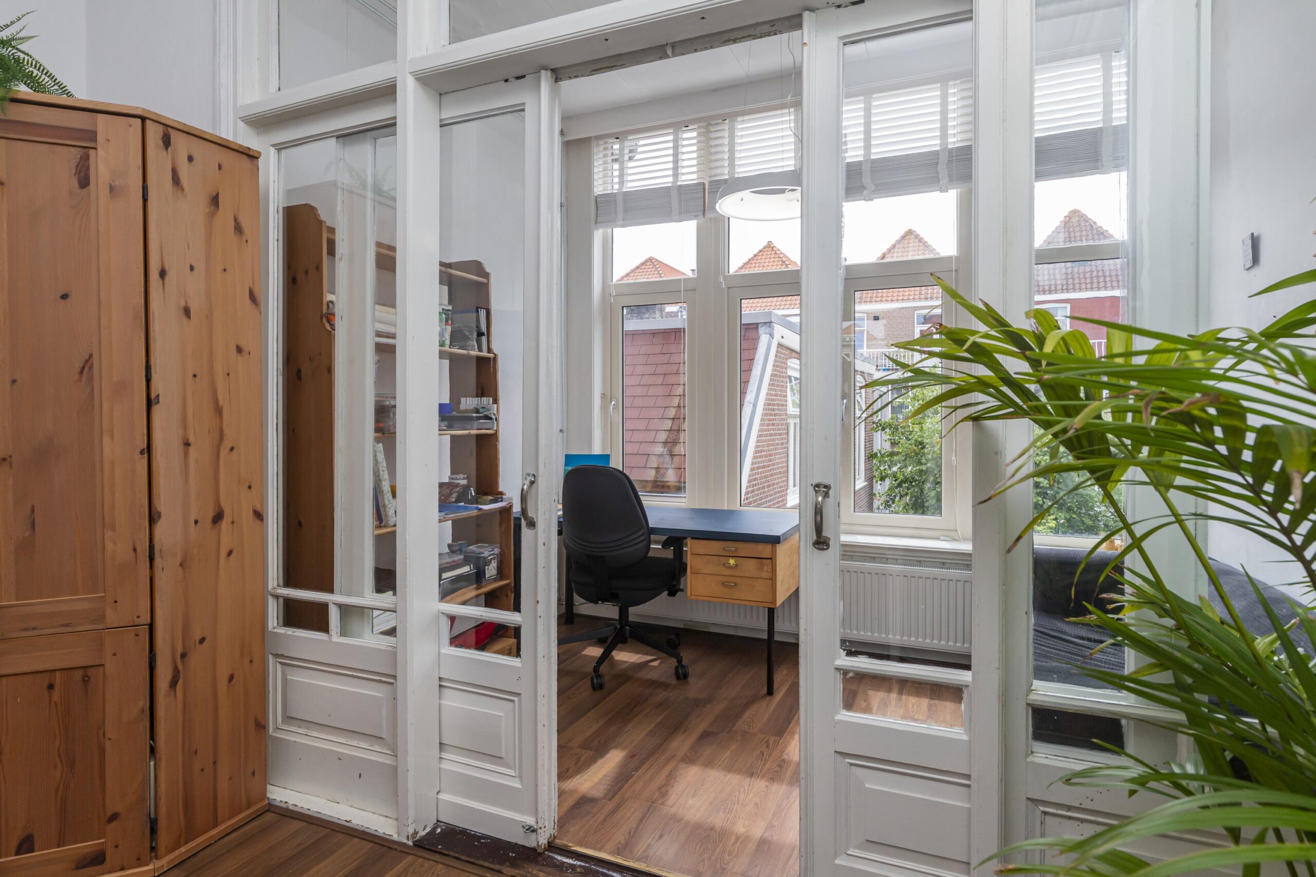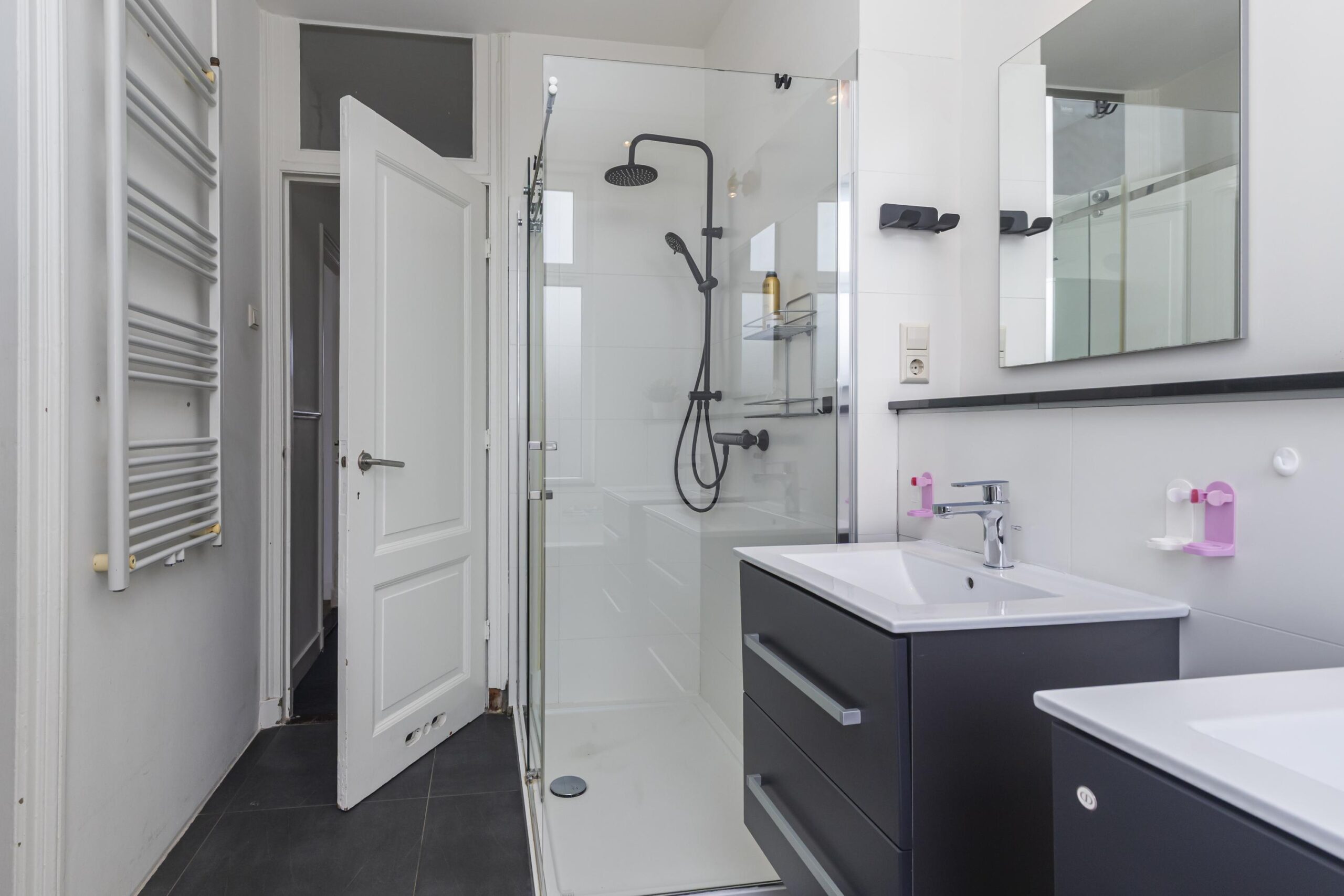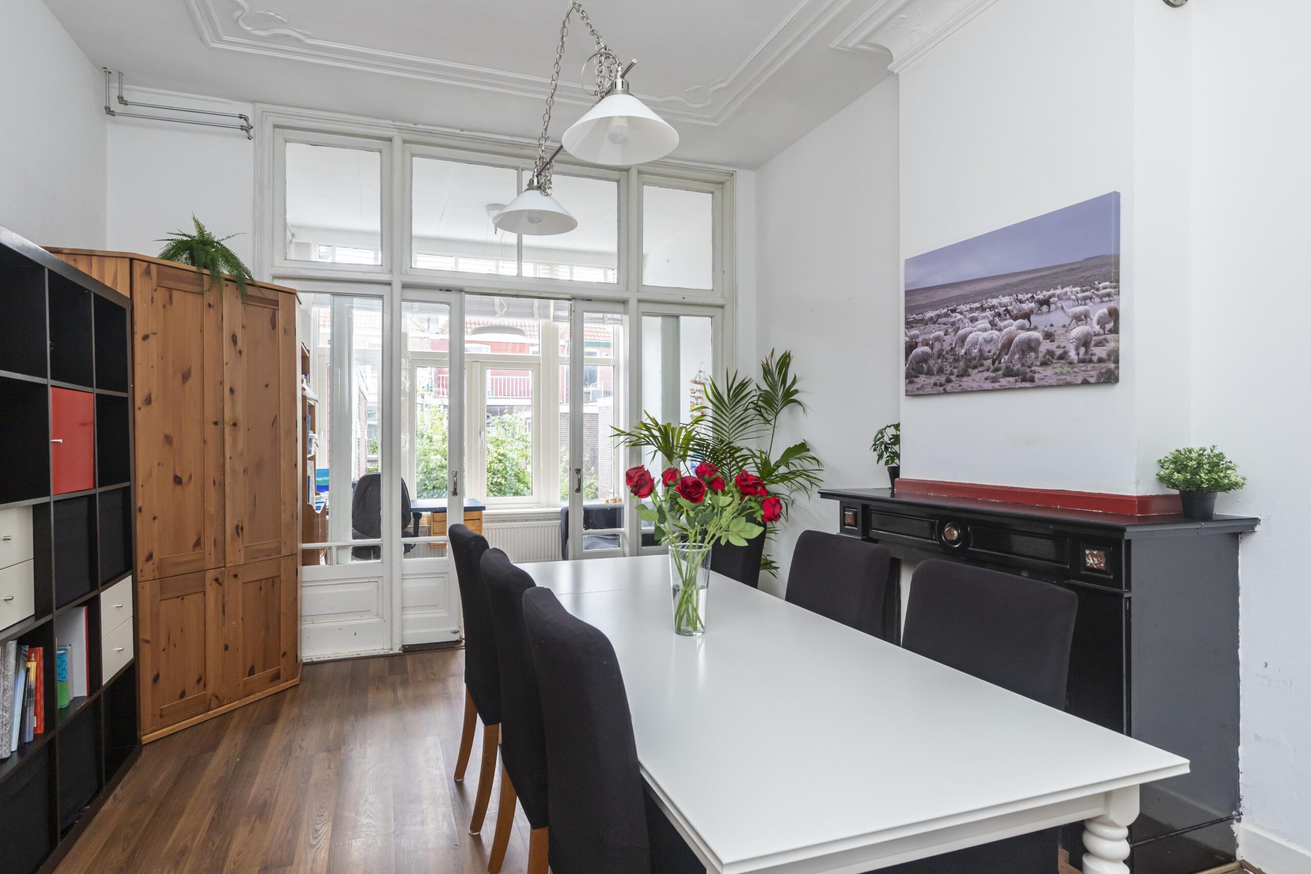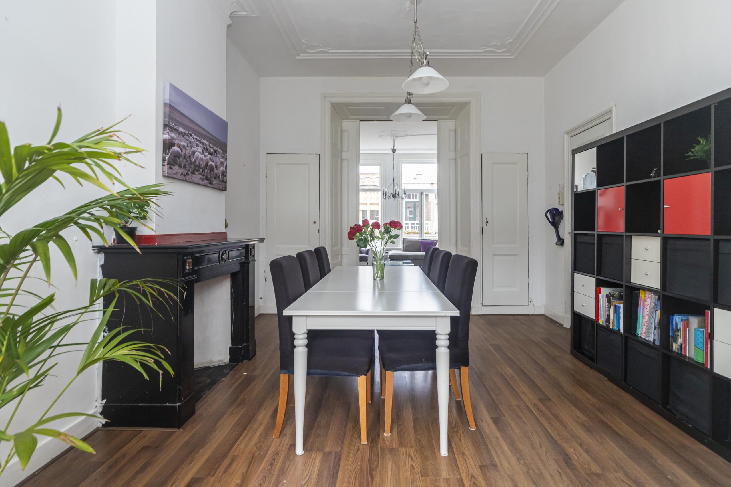 Via de eigen entree op straatniveau bereik je de eerste verdieping. Hier kom je binnen op een ruime overloop met toegang tot de royale woon- en eetkamer ensuite, gescheiden door de originele schuifdeuren – een schitterend detail uit het bouwjaar 1905. Dankzij hoge plafonds en grote ramen is het hier heerlijk licht en ruim. Aan de voorzijde bevindt zich een fijne werkkamer, aan de achterzijde een complete keuken in hoekopstelling, voorzien van o.a. een vaatwasser, 5-pits gaskookplaat, RVS afzuigkap en een koel-/vriescombinatie. Verder zijn er op deze verdieping een gastentoilet en een handige bergkast.