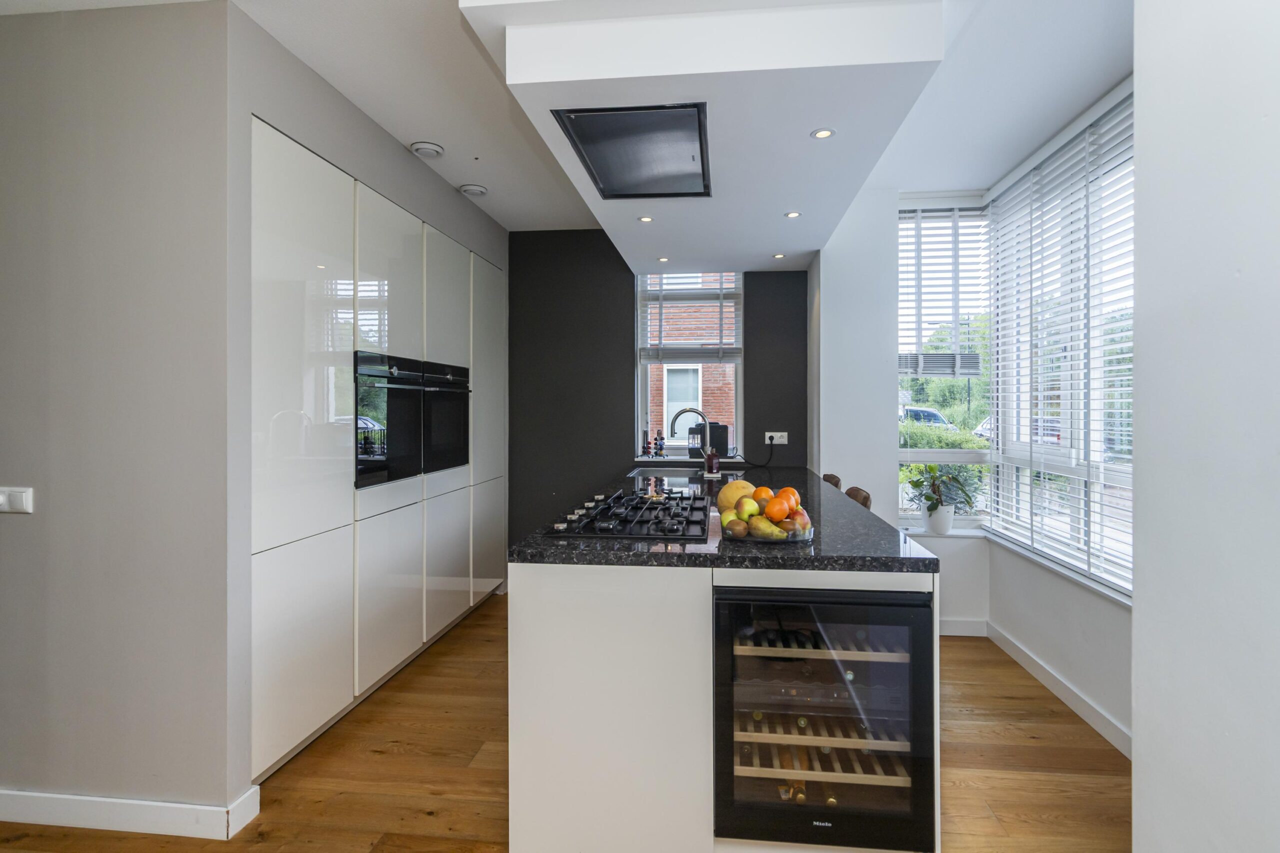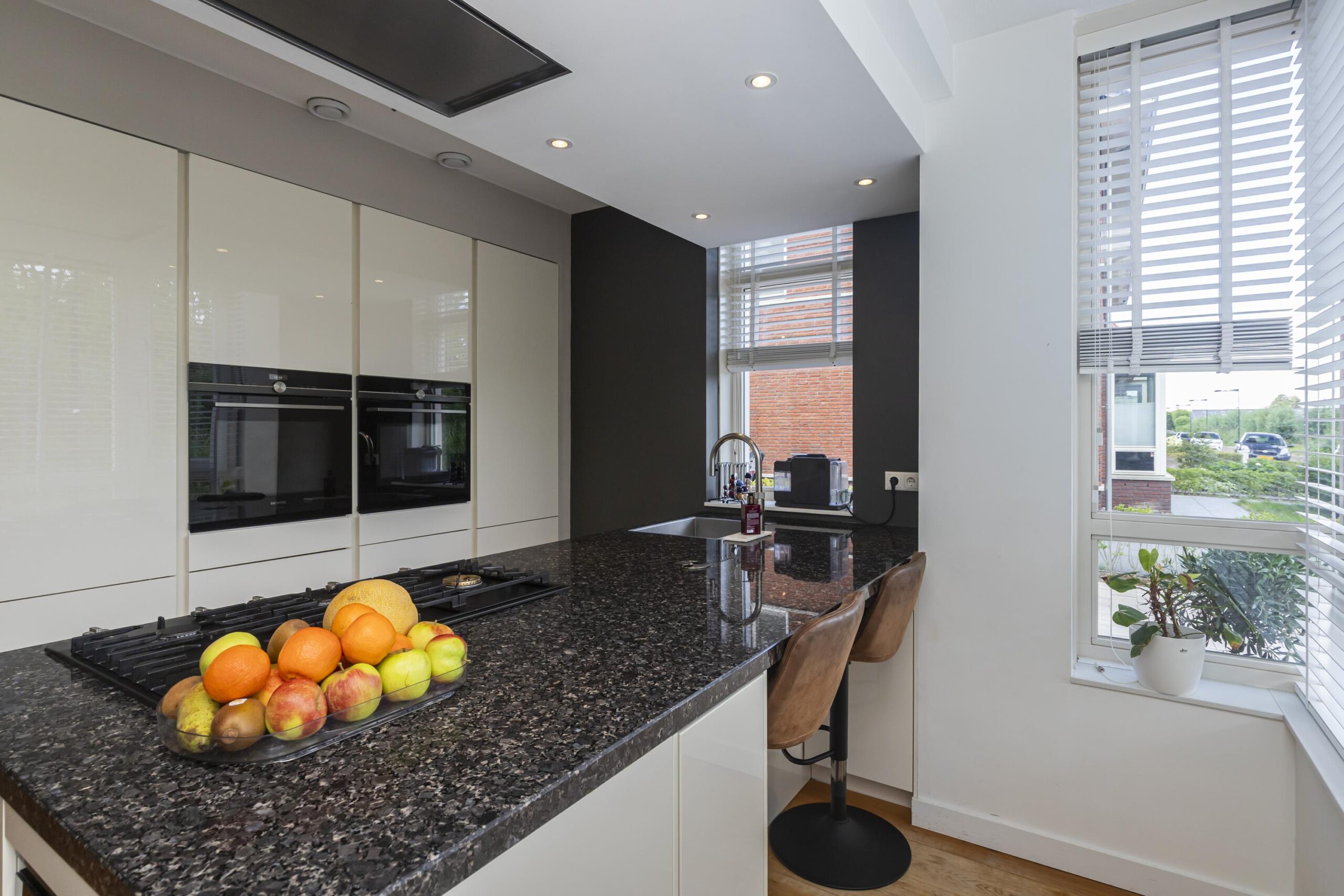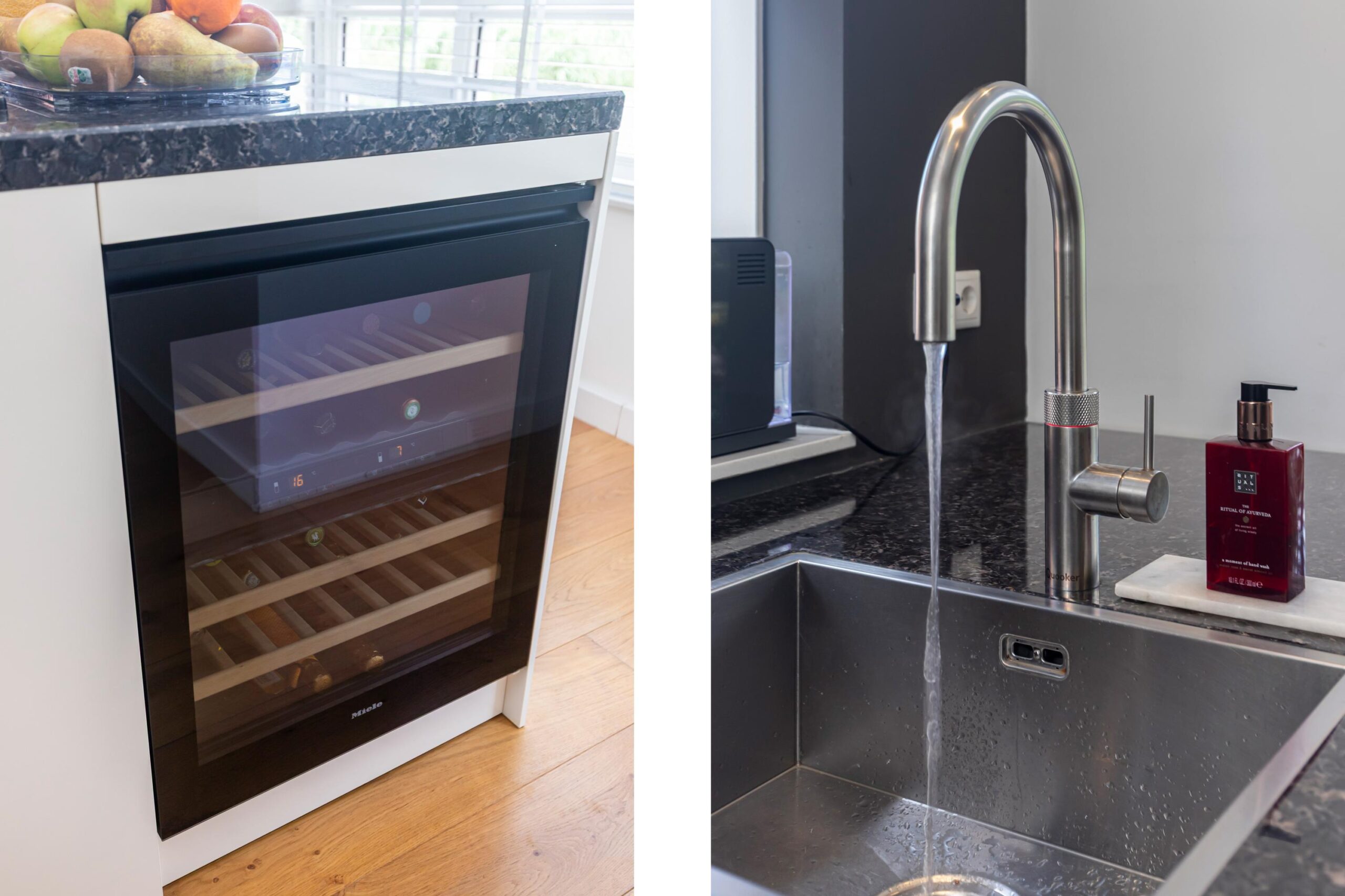 De open keuken aan de voorzijde is een Siematic-keuken met hoogwaardige inbouwapparatuur, waaronder een gaskookplaat, oven, combi-oven, quooker, wijnkoeler, koelkast, vriezer en vaatwasser. Het granieten werkblad maakt het geheel stijlvol af.