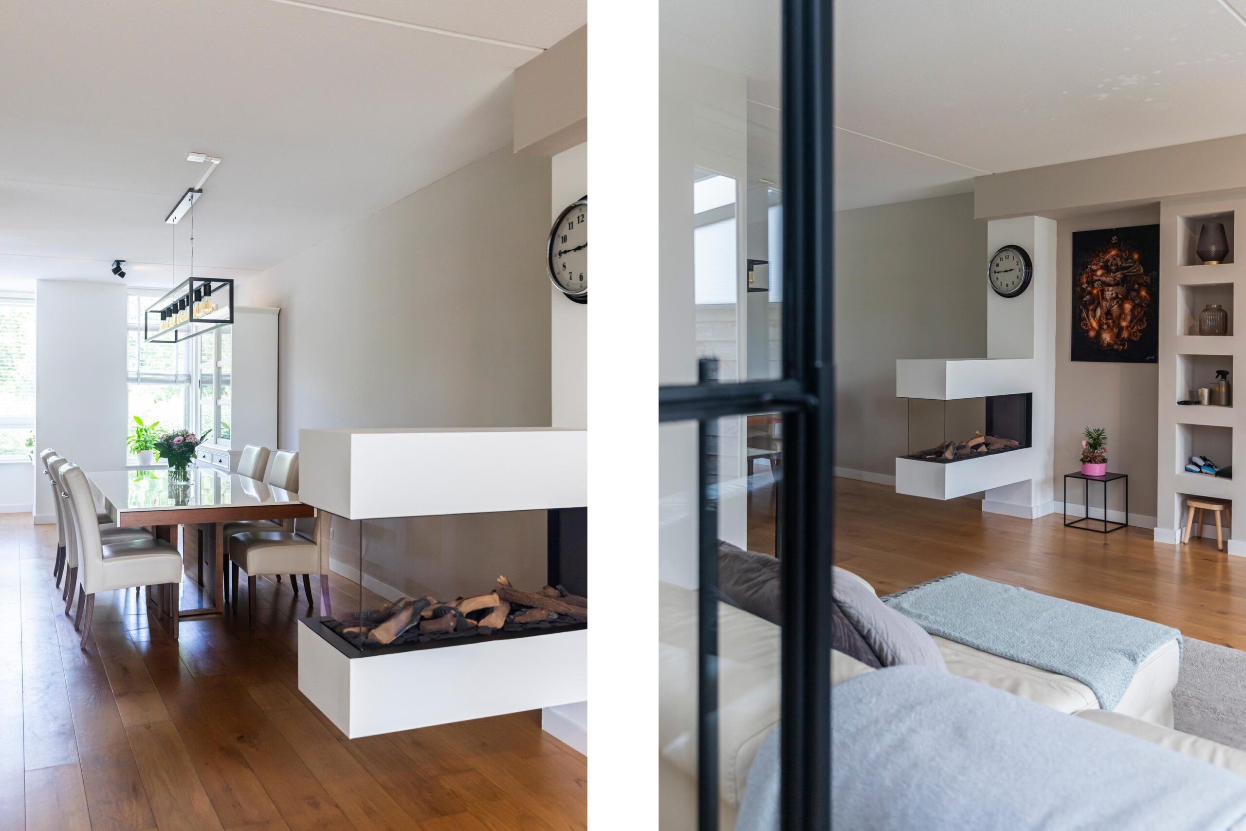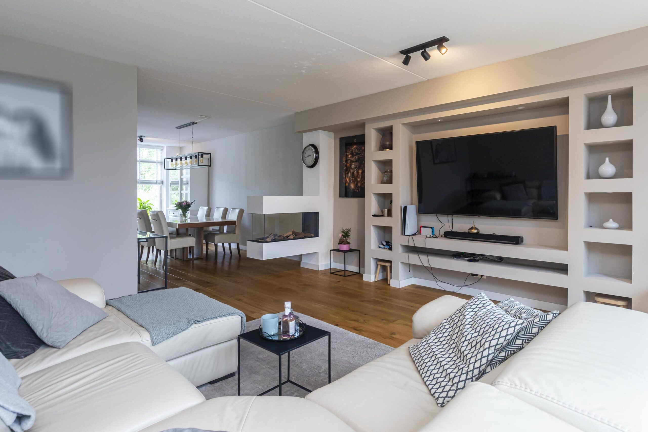 Via de voortuin met oprit en (fietsen)berging komt u binnen in de hal welke toegang biedt aan meterkast, trapkast en modern wandcloset met fonteintje. De woonkamer is ruim en licht, voorzien van een houten vloer met vloerverwarming, gestuukte wanden en een sfeervolle gashaard (3-zijdig). Dankzij de dubbele openslaande deuren én de serre aan de achterzijde loopt binnen naadloos over in buiten.