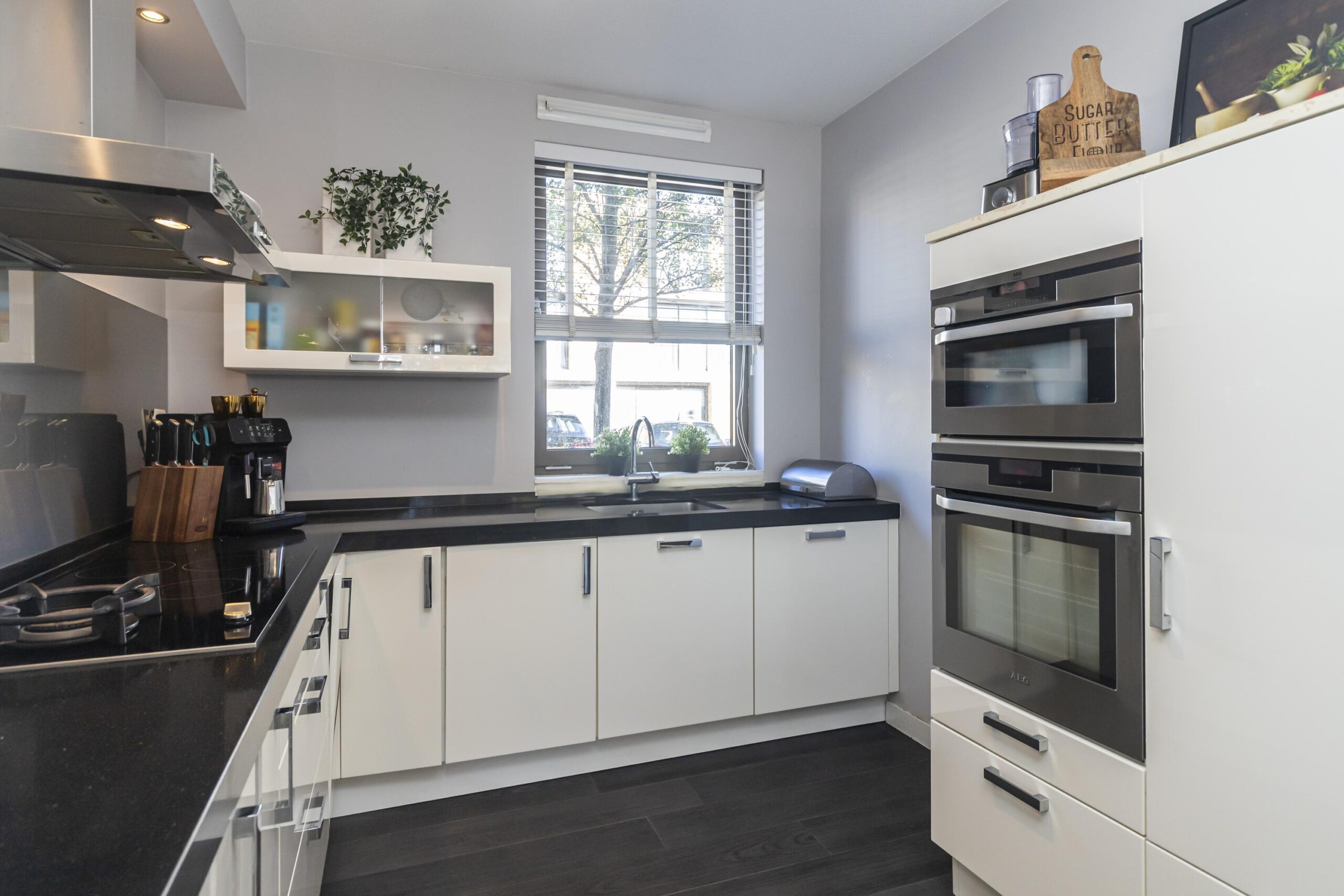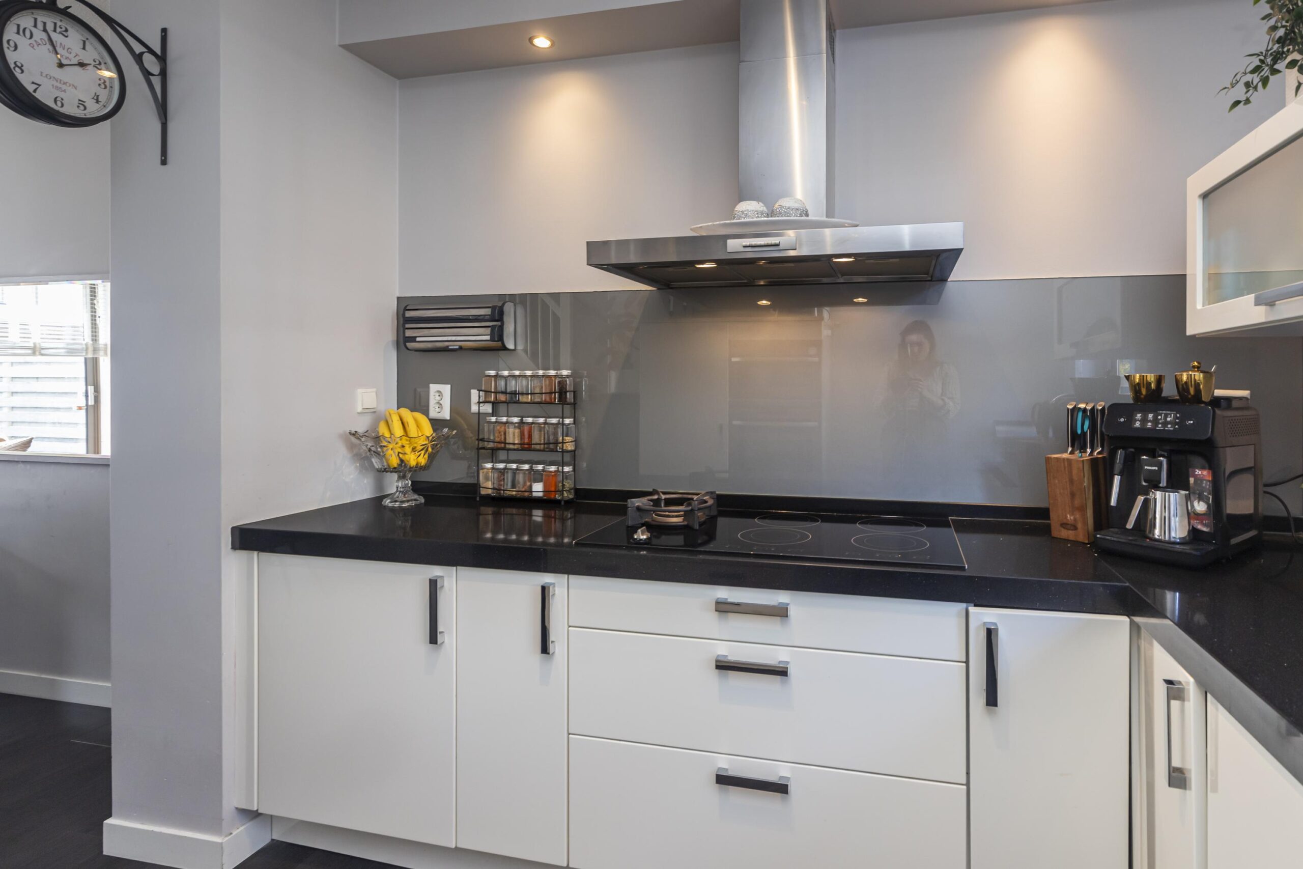 De moderne open keuken is in L-opstelling met extra kasten, uitgevoerd in creme-kleur kastjes en een zwart composiet werkblad. De inbouwapparatuur bestaat uit een 4-pits-inductiekookplaat, afzuigkap (met afvoer naar buiten), vaatwasser, koelkast/vriezer, oven en een magnetron. Door de extra kasten is er ook erg veel bergruimte in de keuken.