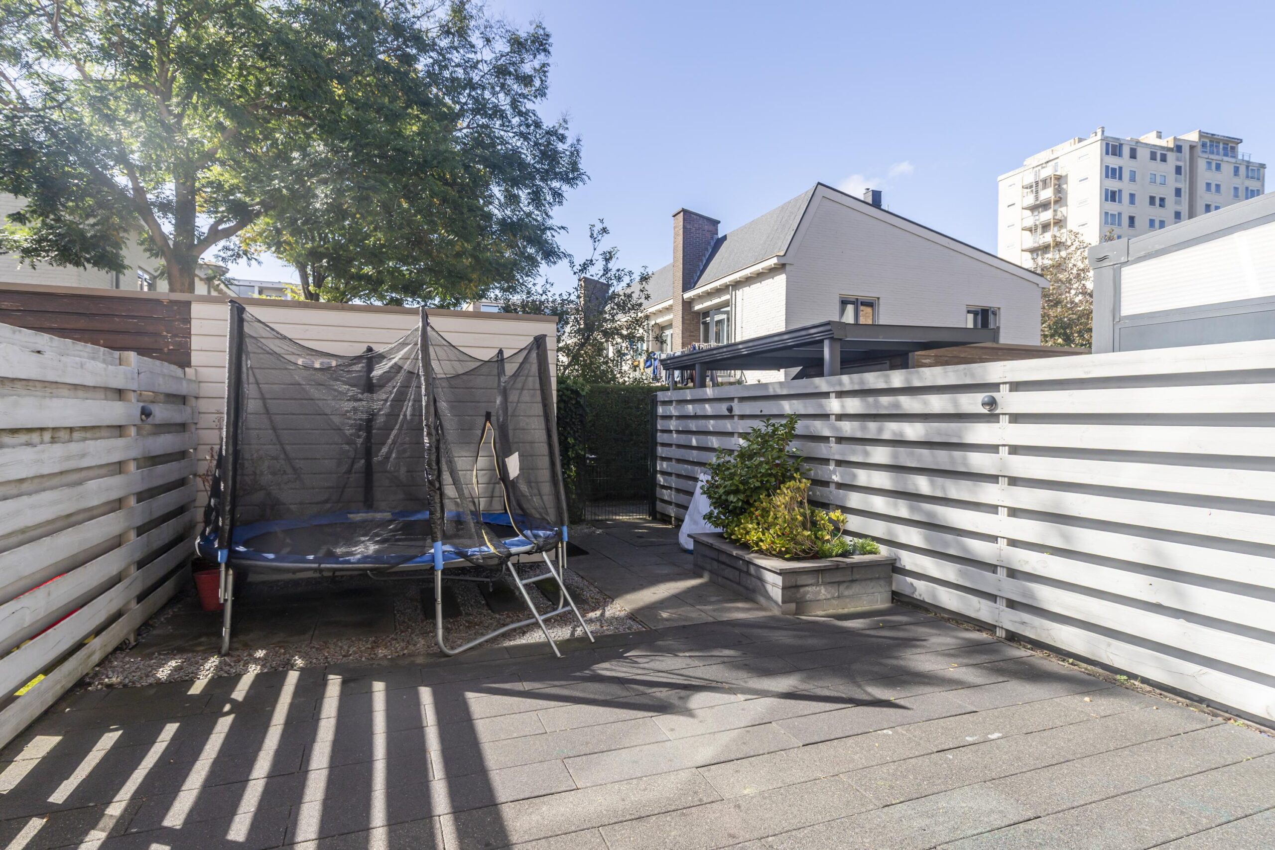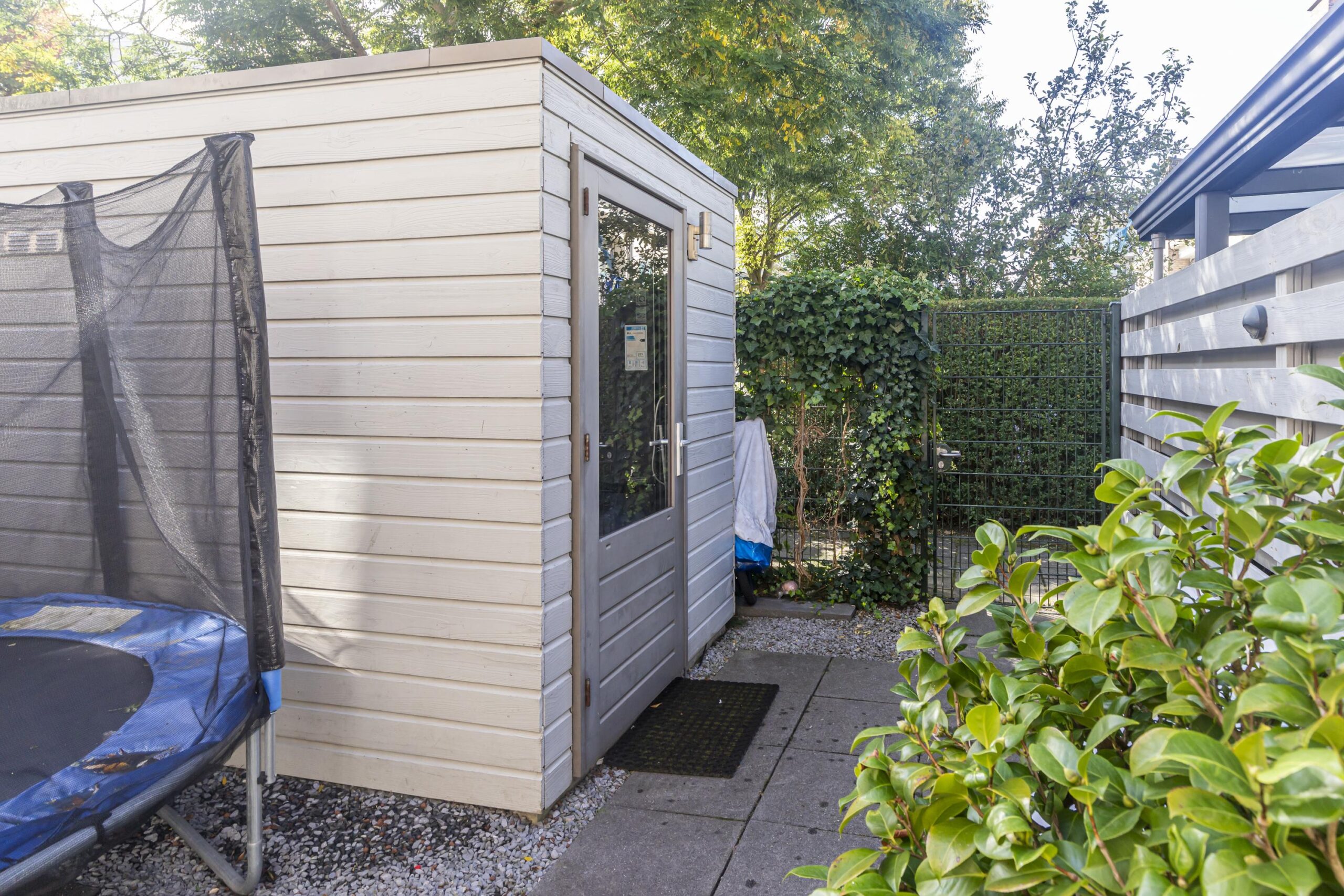 De achtertuin is door de ligging op het zuid-westen erg zonnig en daarom ook het zonnescherm aan de woning. Maar ook doordat er geen woningen direct achter gelegen zijn meer privacy. Er is een achteringang in de tuin waarmee de fietsen zo de berging in kunnen.