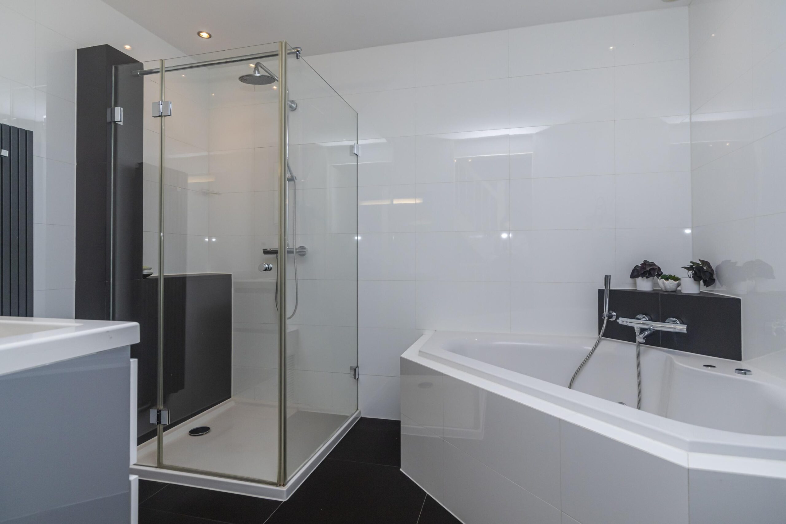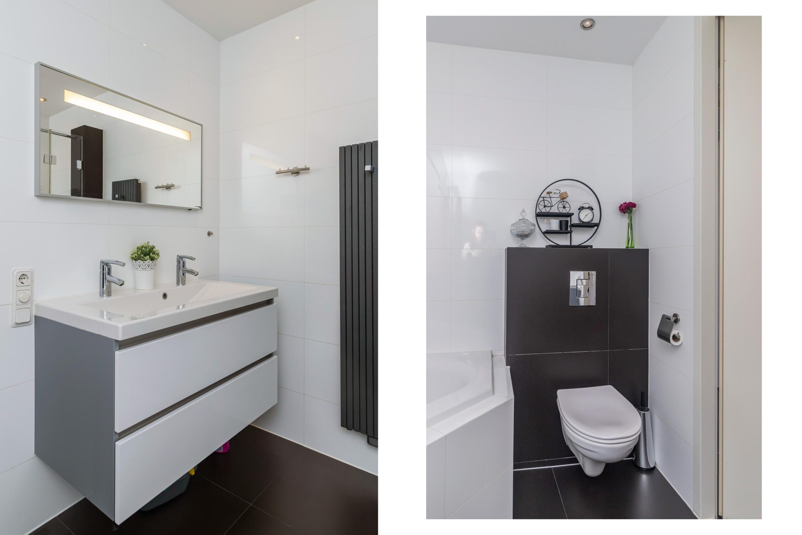 - Badkamervoorzieningen Ligbad, toilet, douche, dubbele wastafel