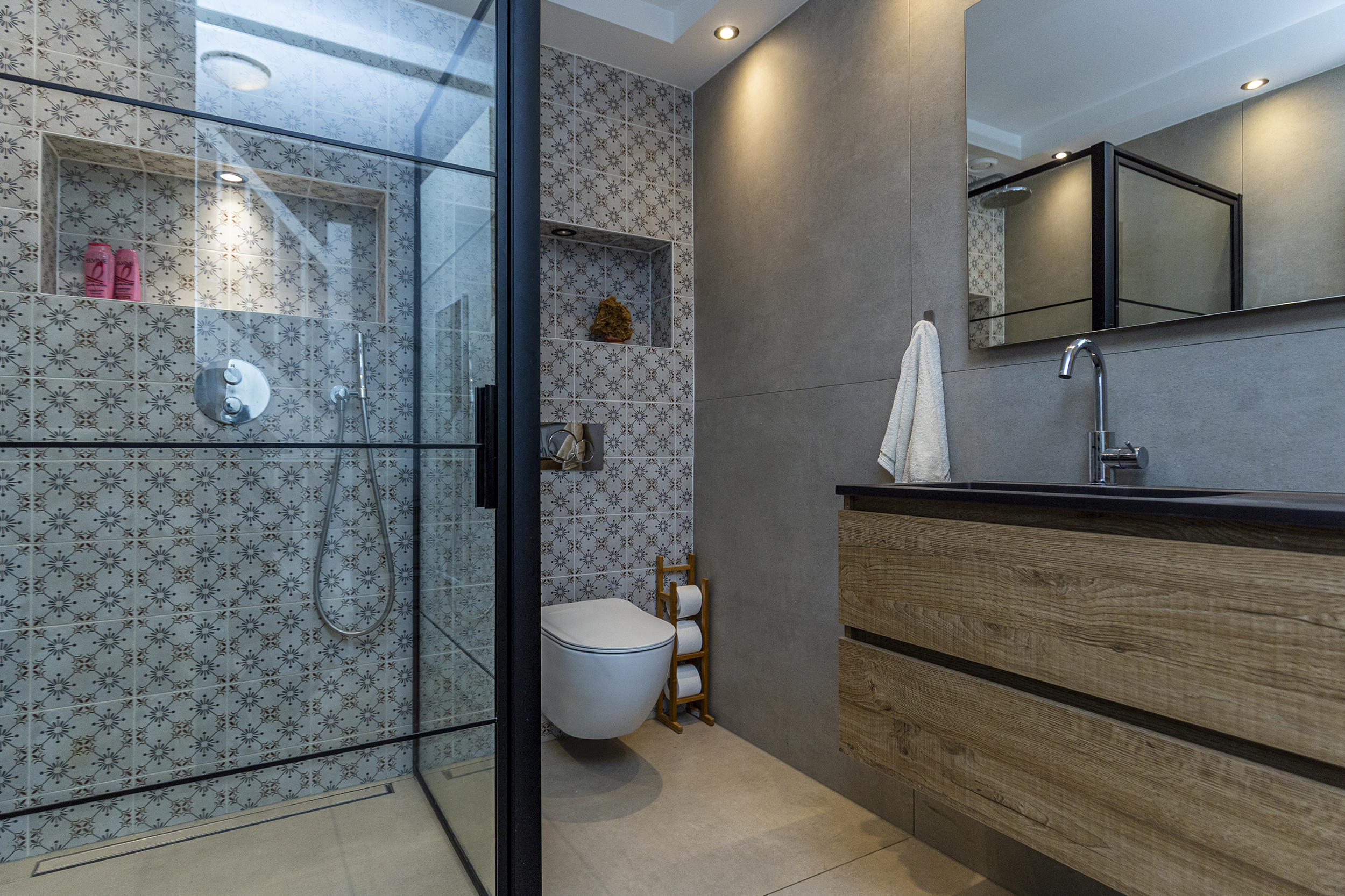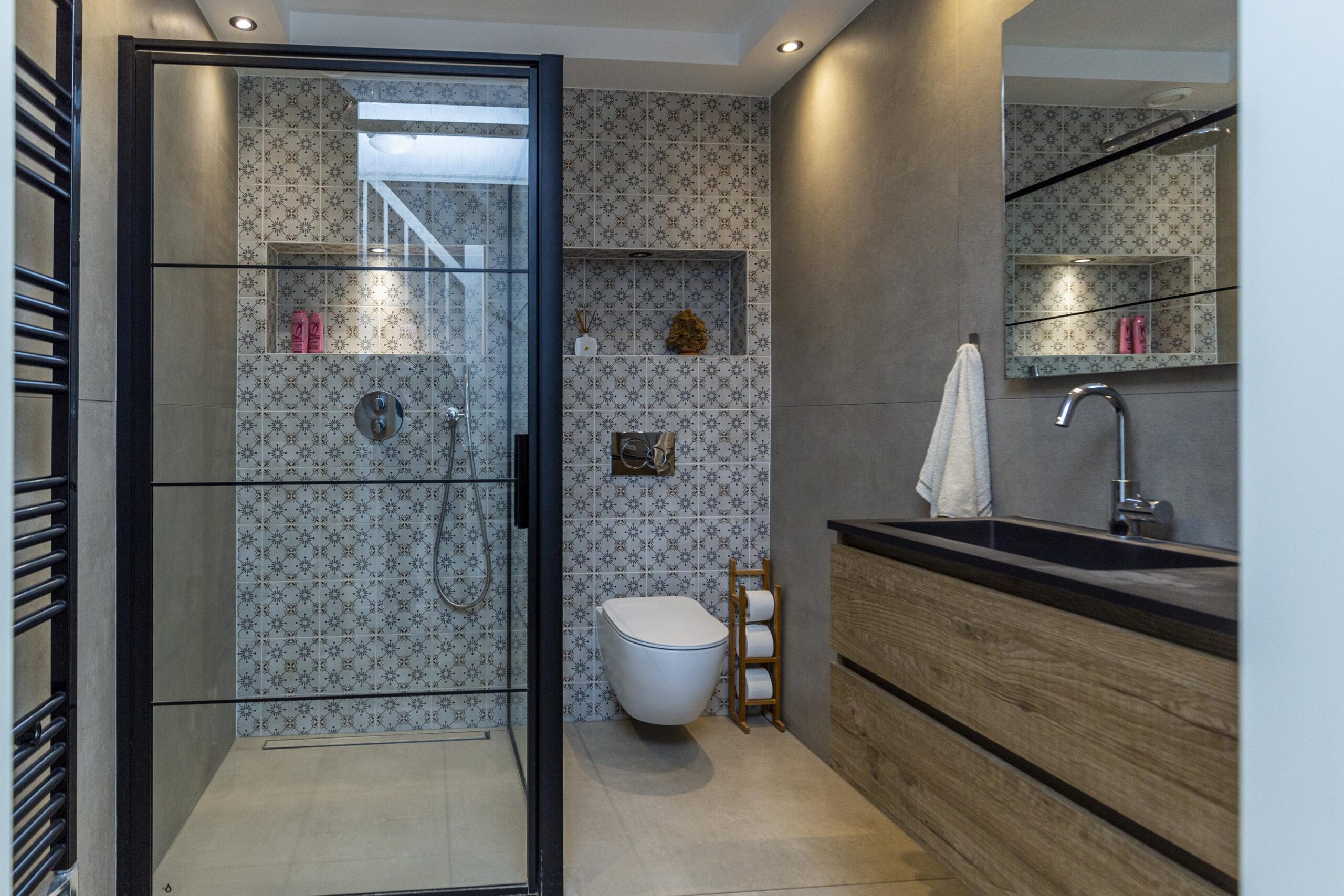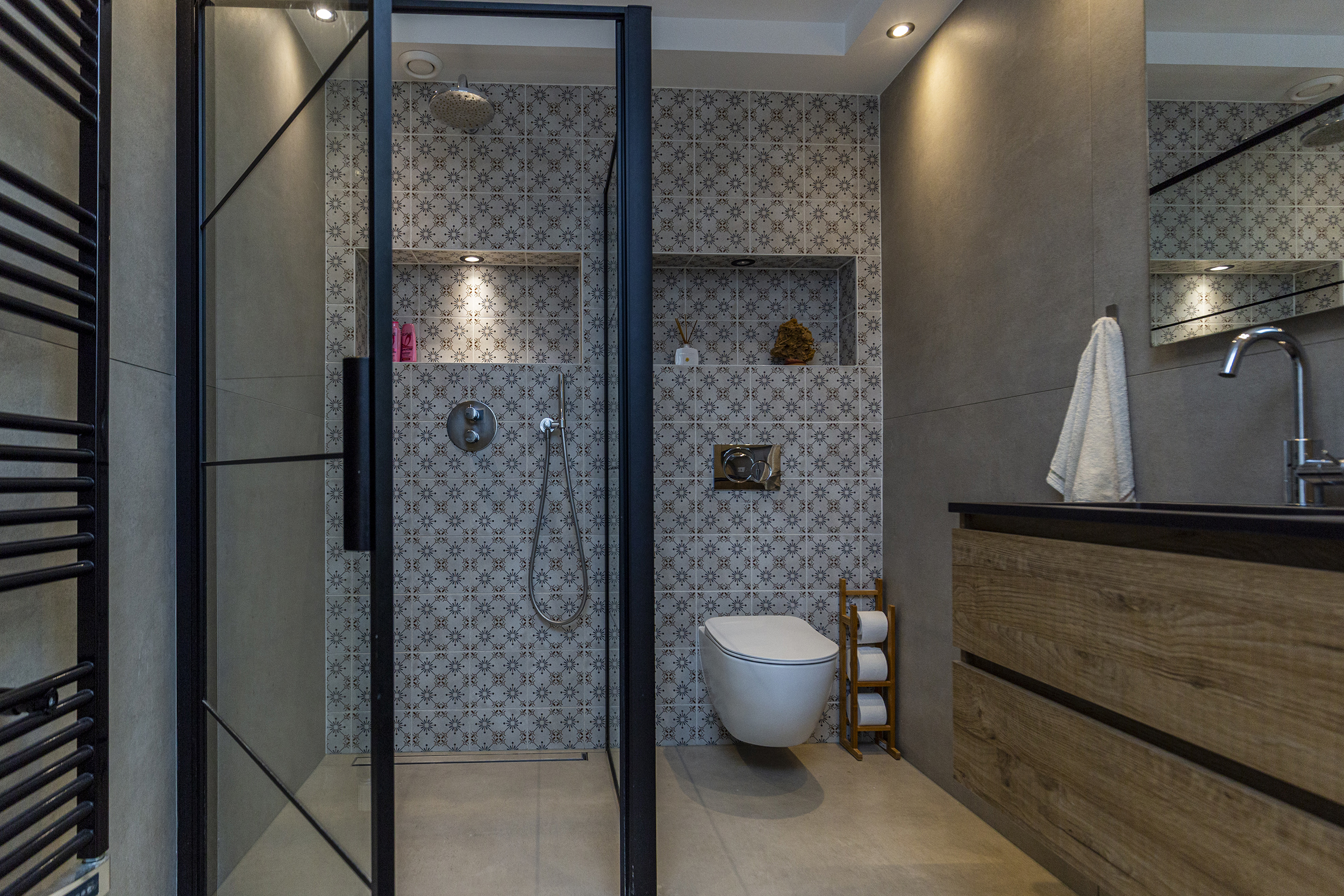 - Badkamervoorzieningen Toilet, douche, wastafelmeubel, vloerverwarming