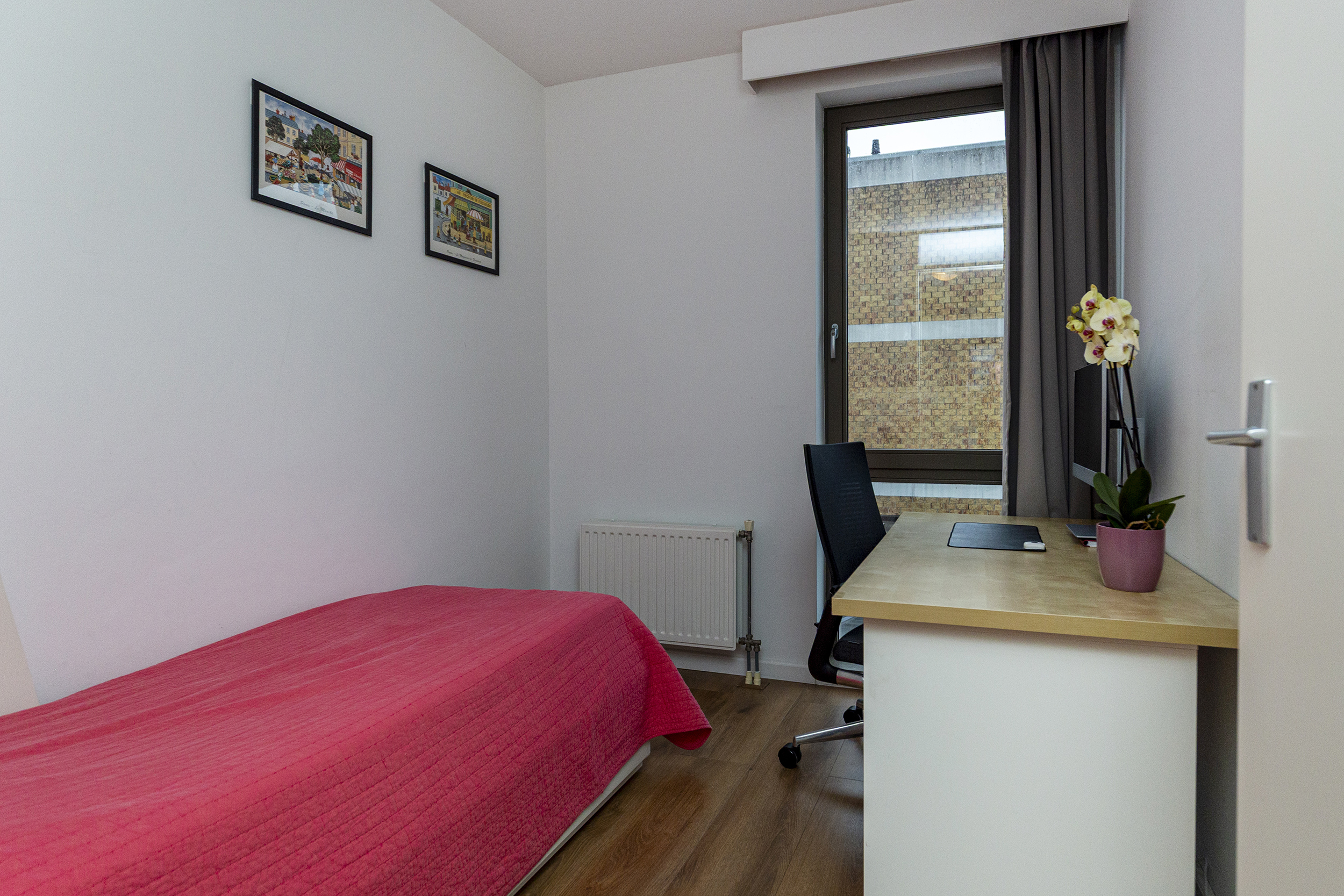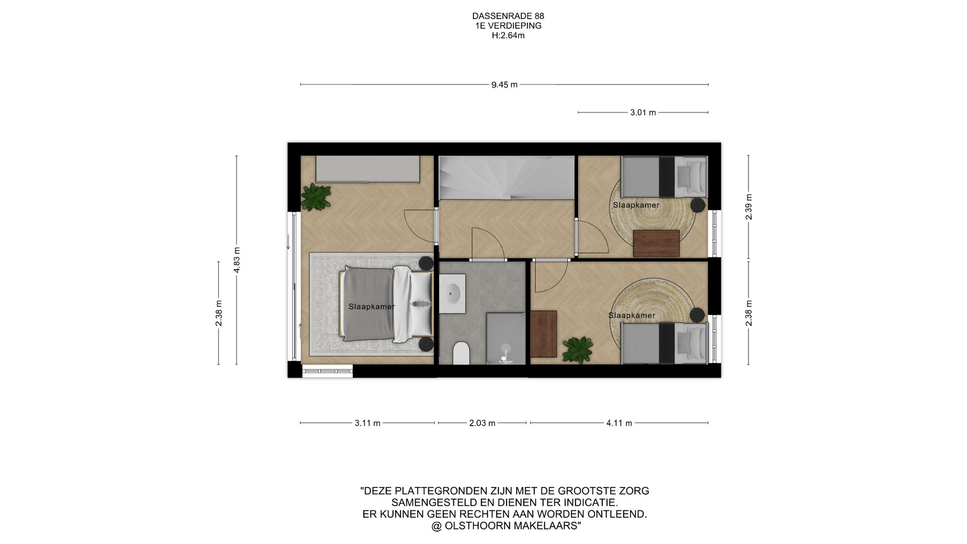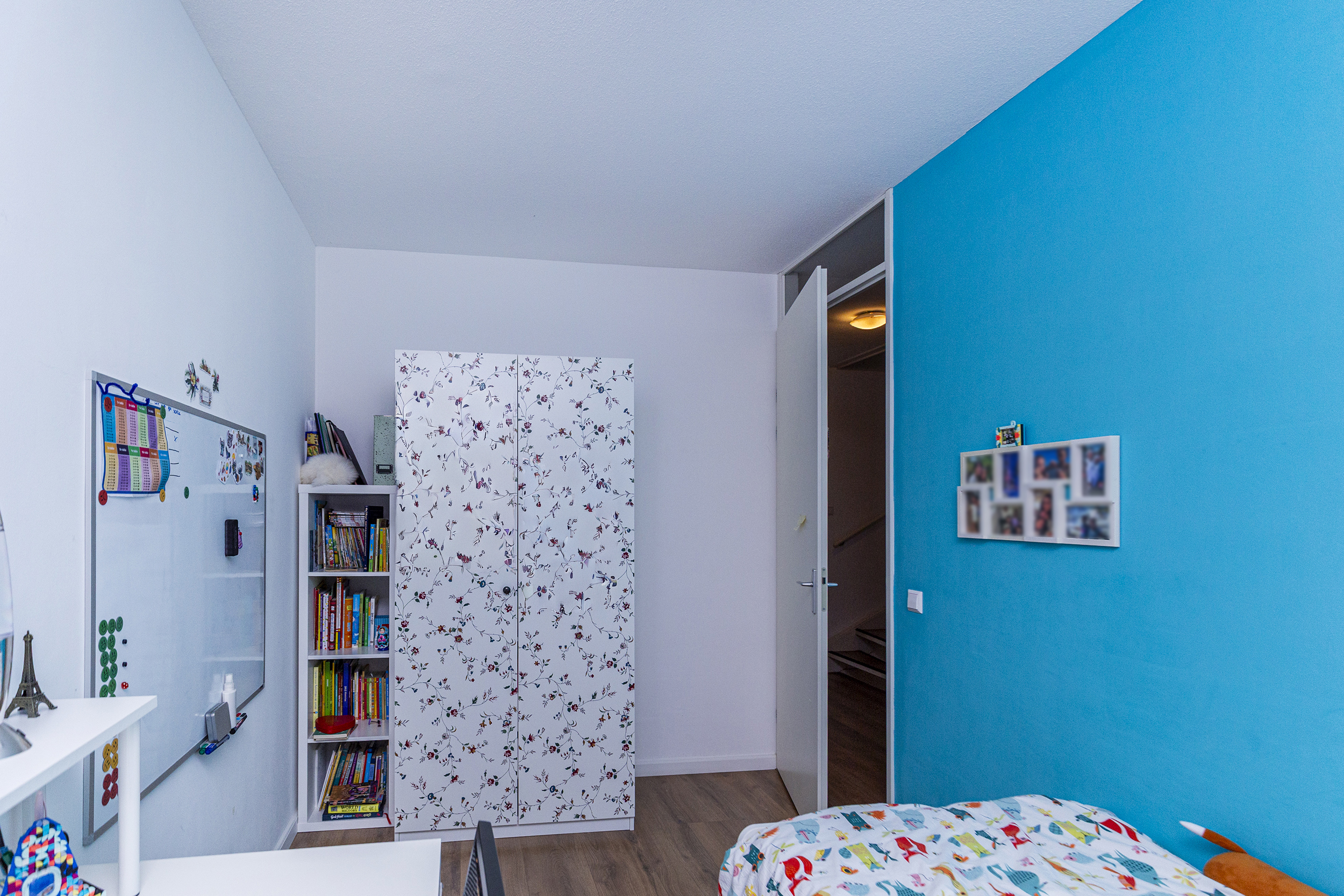 Op de eerste verdieping geeft de overloop toegang tot de verschillende vertrekken. Hier bevinden zich drie slaapkamers, geschikt als slaap-, werk- of hobbyruimte. De badkamer is centraal gelegen en compleet uitgevoerd met een ligbad, douche en wastafel. De vloerverwarming zorgt hier voor extra comfort en een aangename start van de dag.