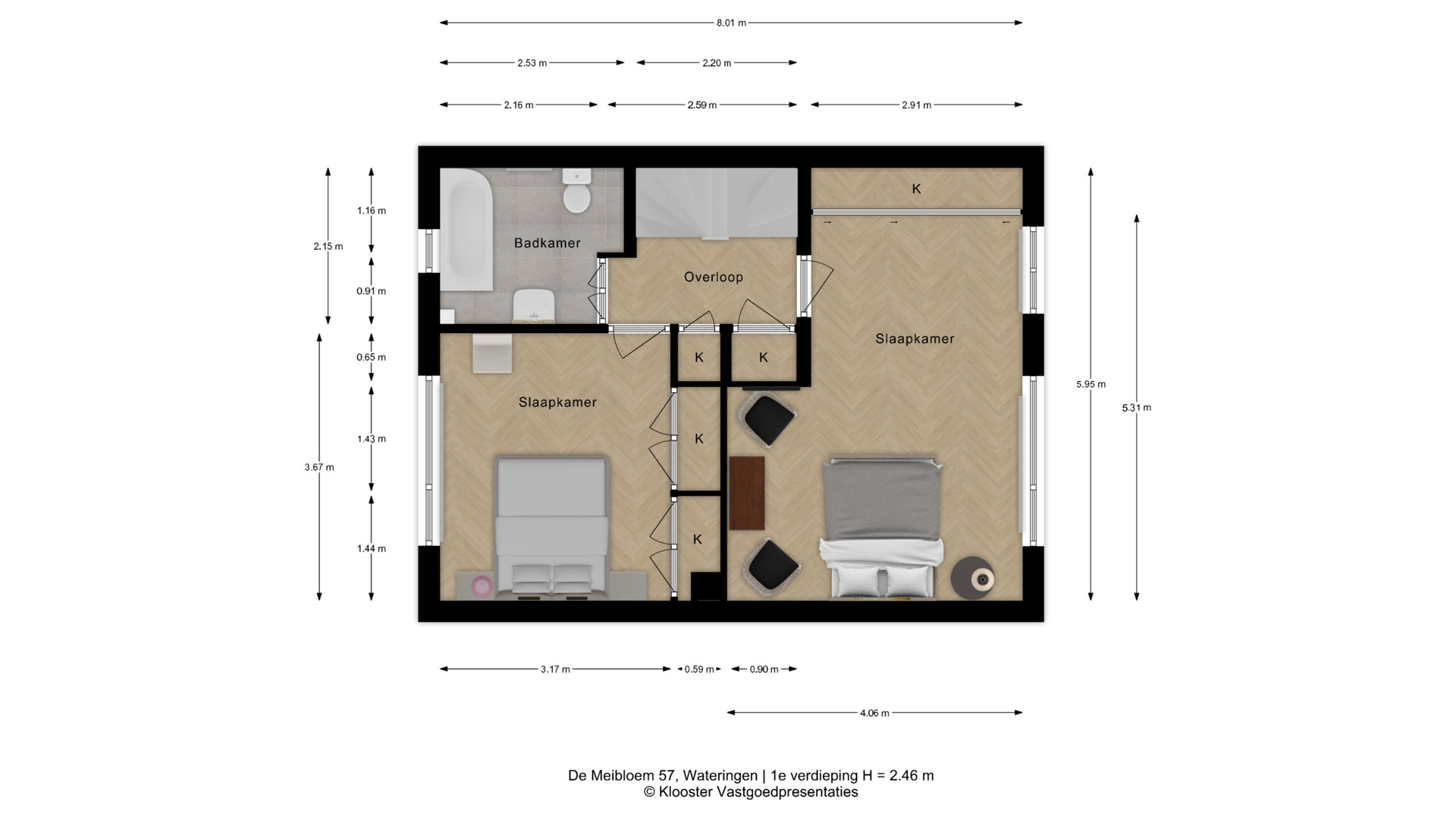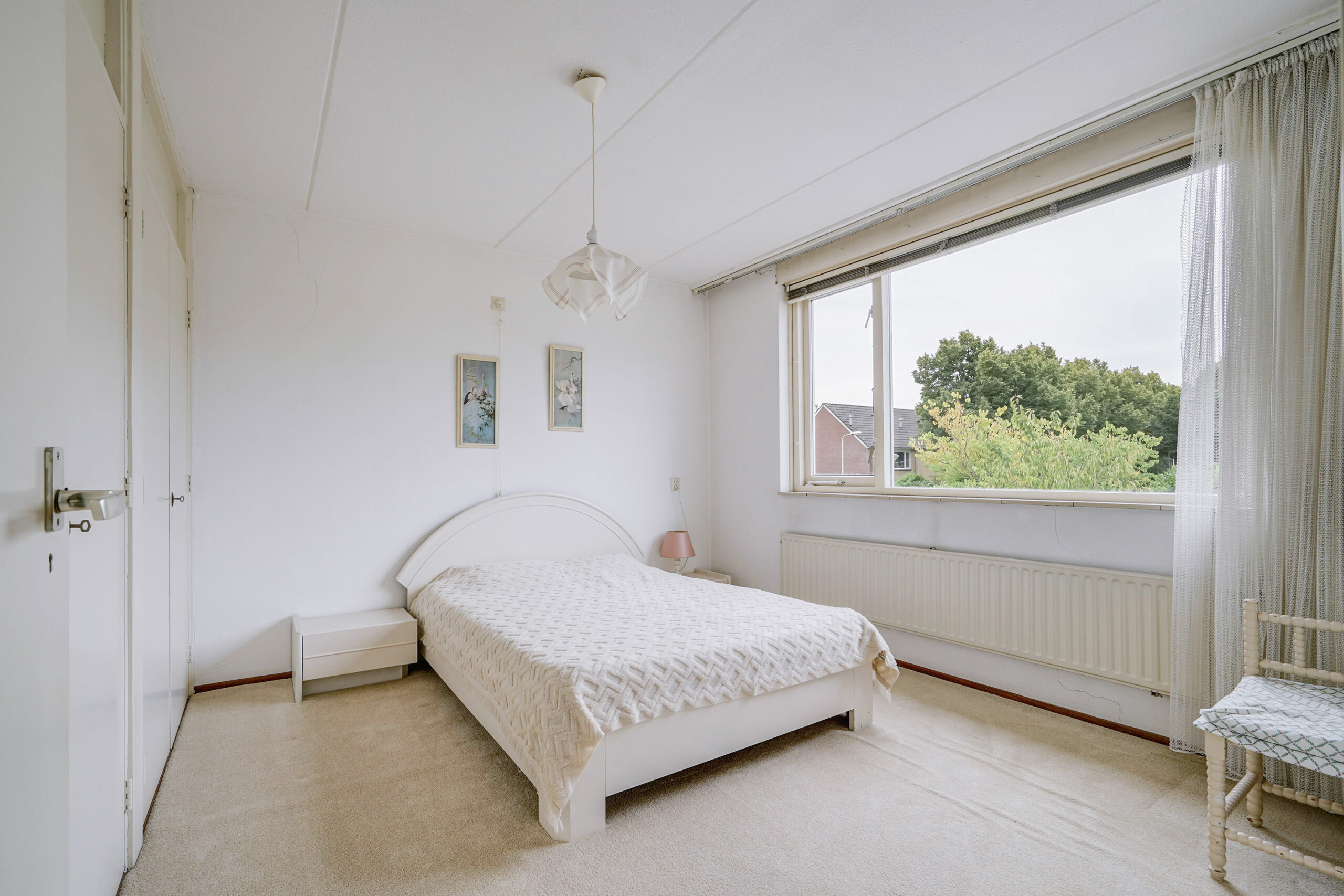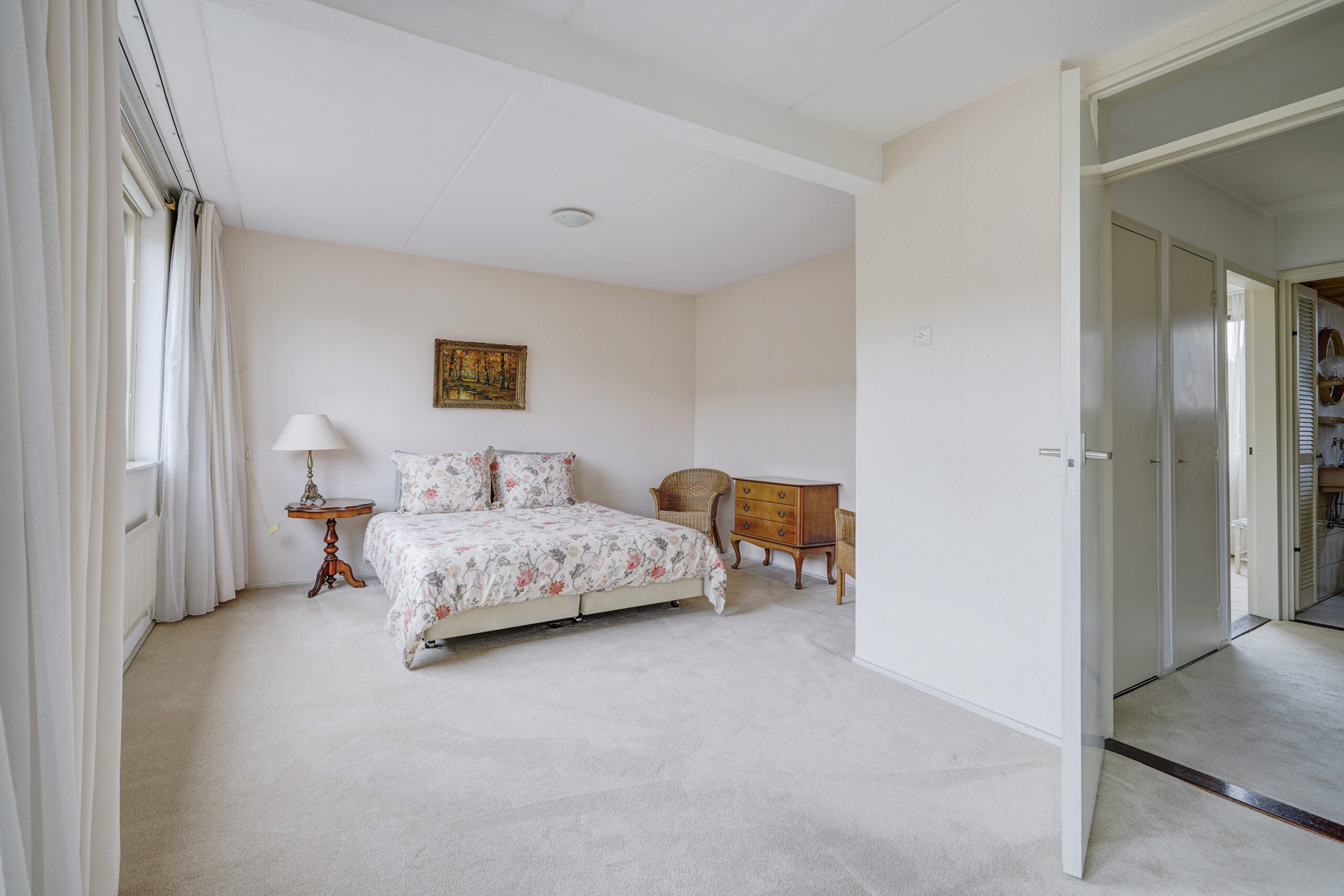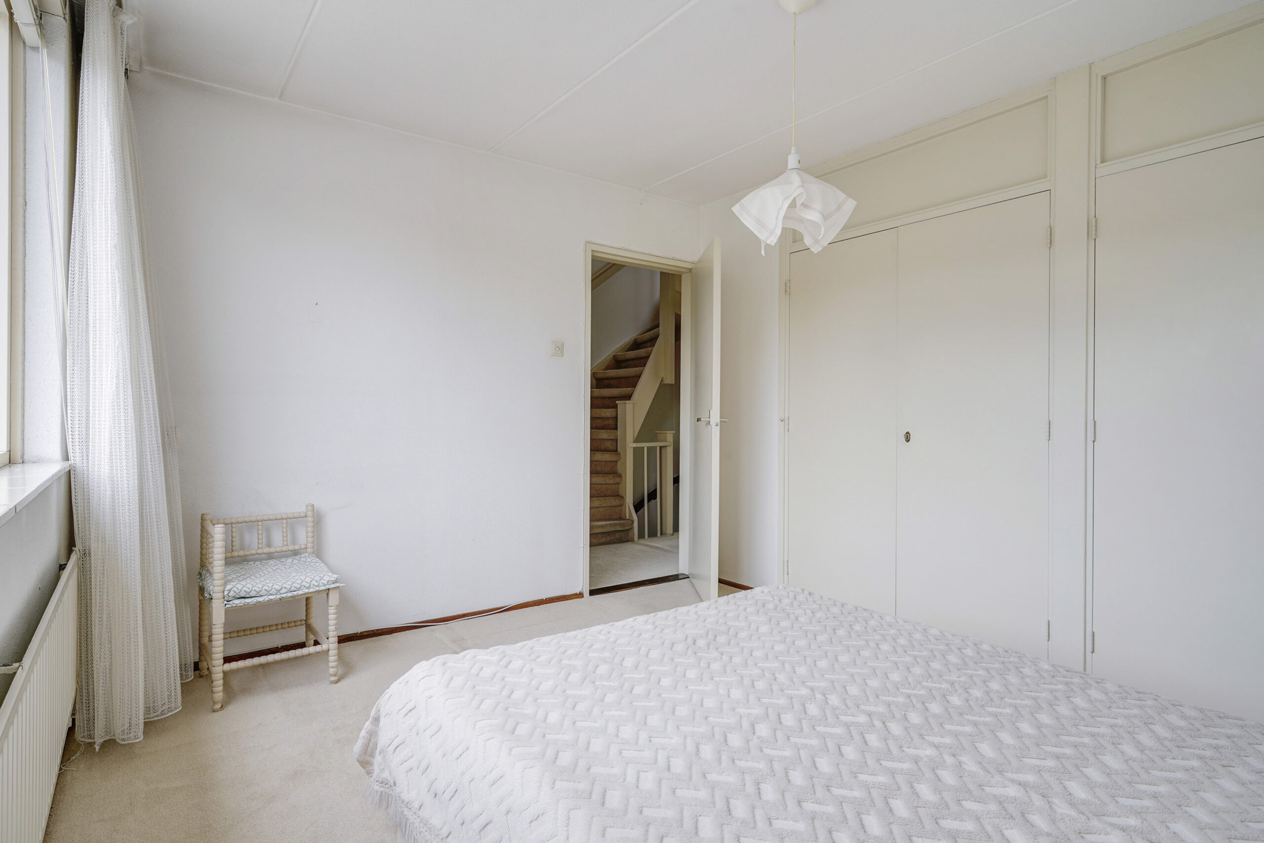 De overloop geeft toegang tot twee ruime slaapkamers. Aan de voorzijde bevindt zich een slaapkamer met vaste kasten, ideaal als werkkamer of logeerkamer. Aan de achterzijde ligt de woningbrede hoofdslaapkamer, eveneens voorzien van handige inbouwkasten. De badkamer aan de voorzijde beschikt over een ligbad, toilet en wastafel.