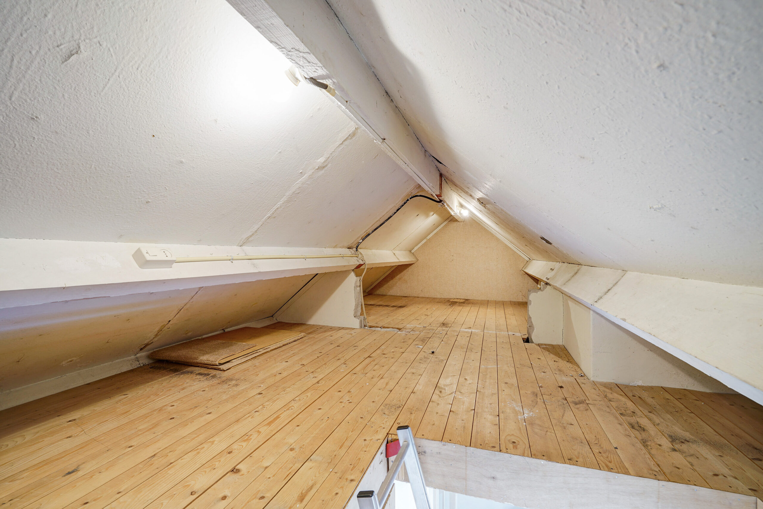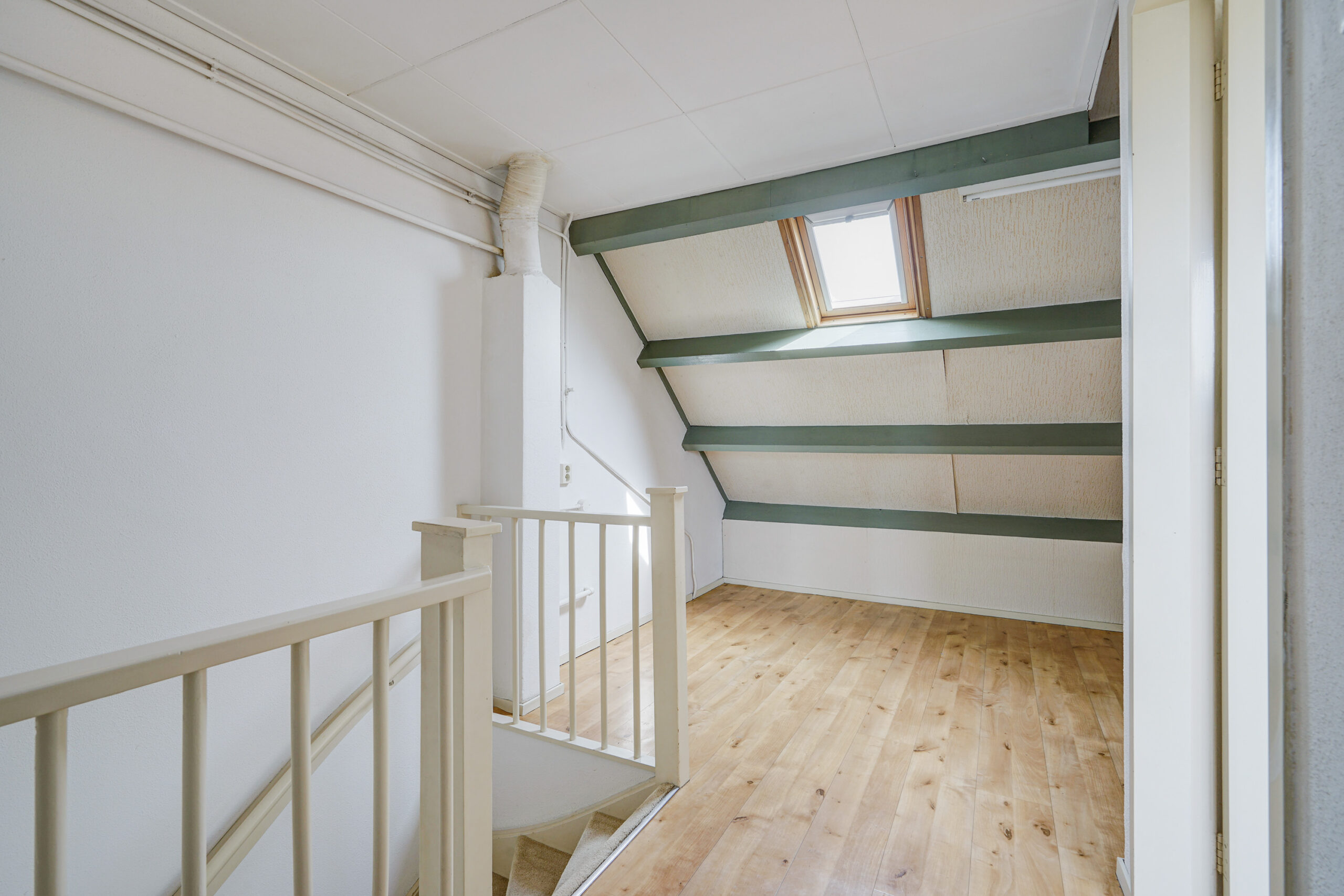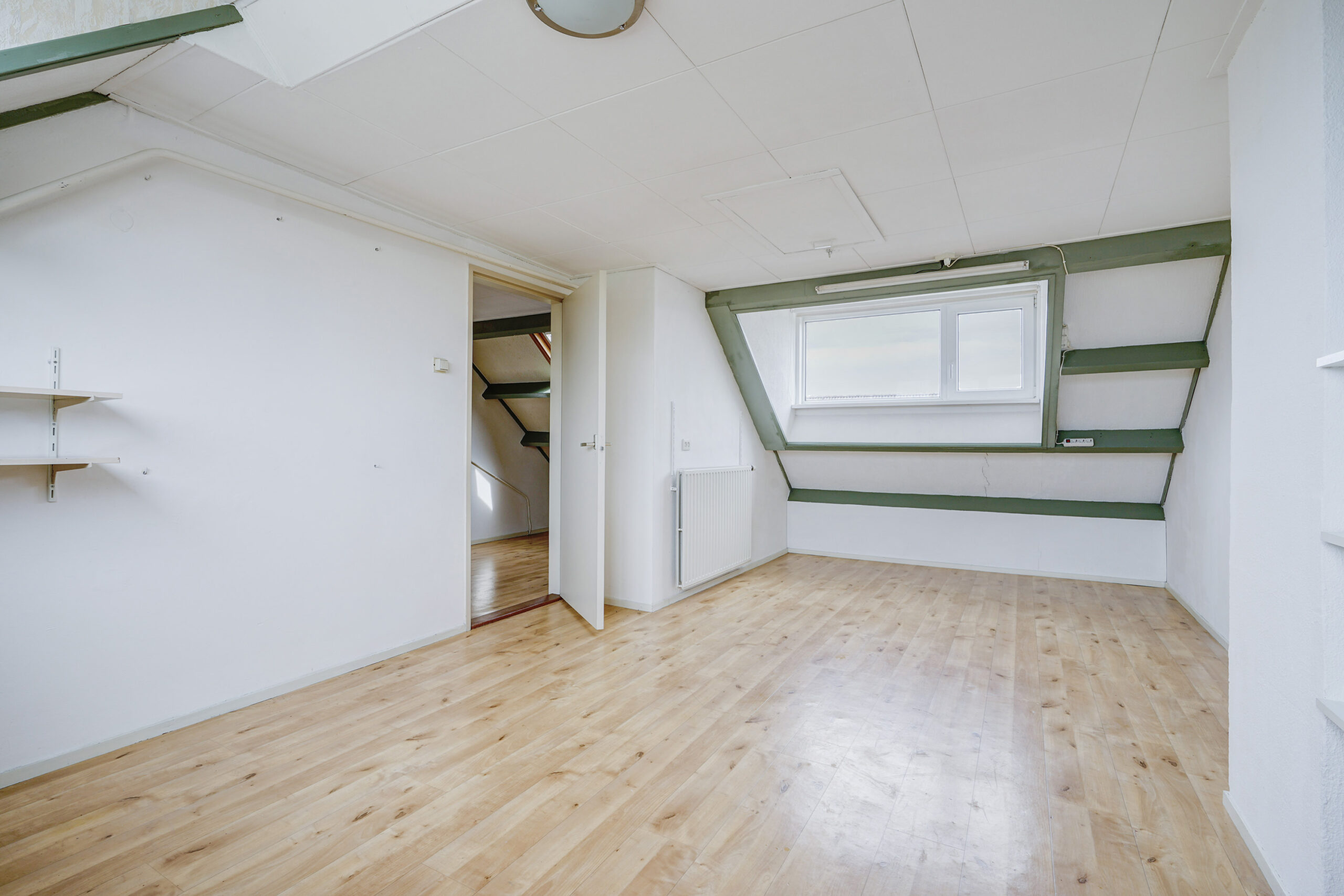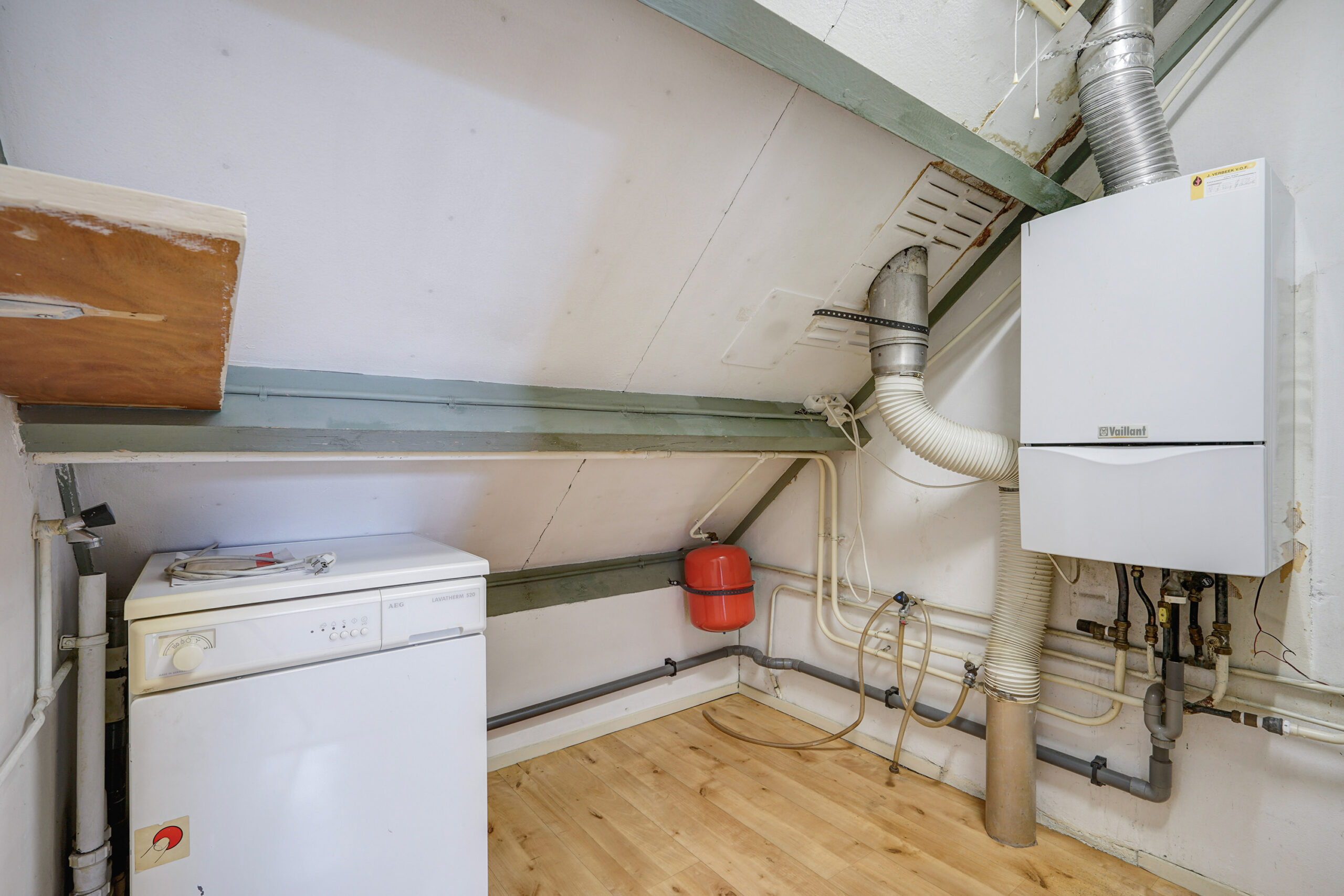 Op de tweede verdieping bevindt zich een ruime derde slaapkamer met voldoende daglicht en toegang tot de bergvliering. De overloop, voorzien van een dakraam, bevat de technische ruimte met de opstelplaats van de cv-combiketel en aansluitingen voor de wasmachine en droger.