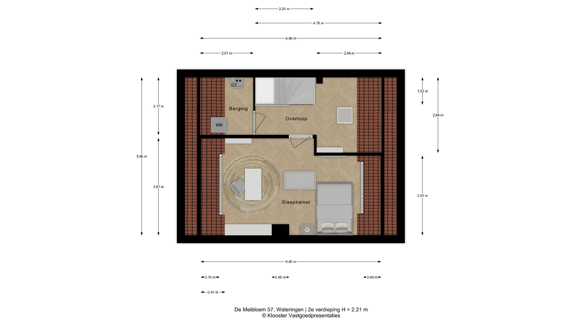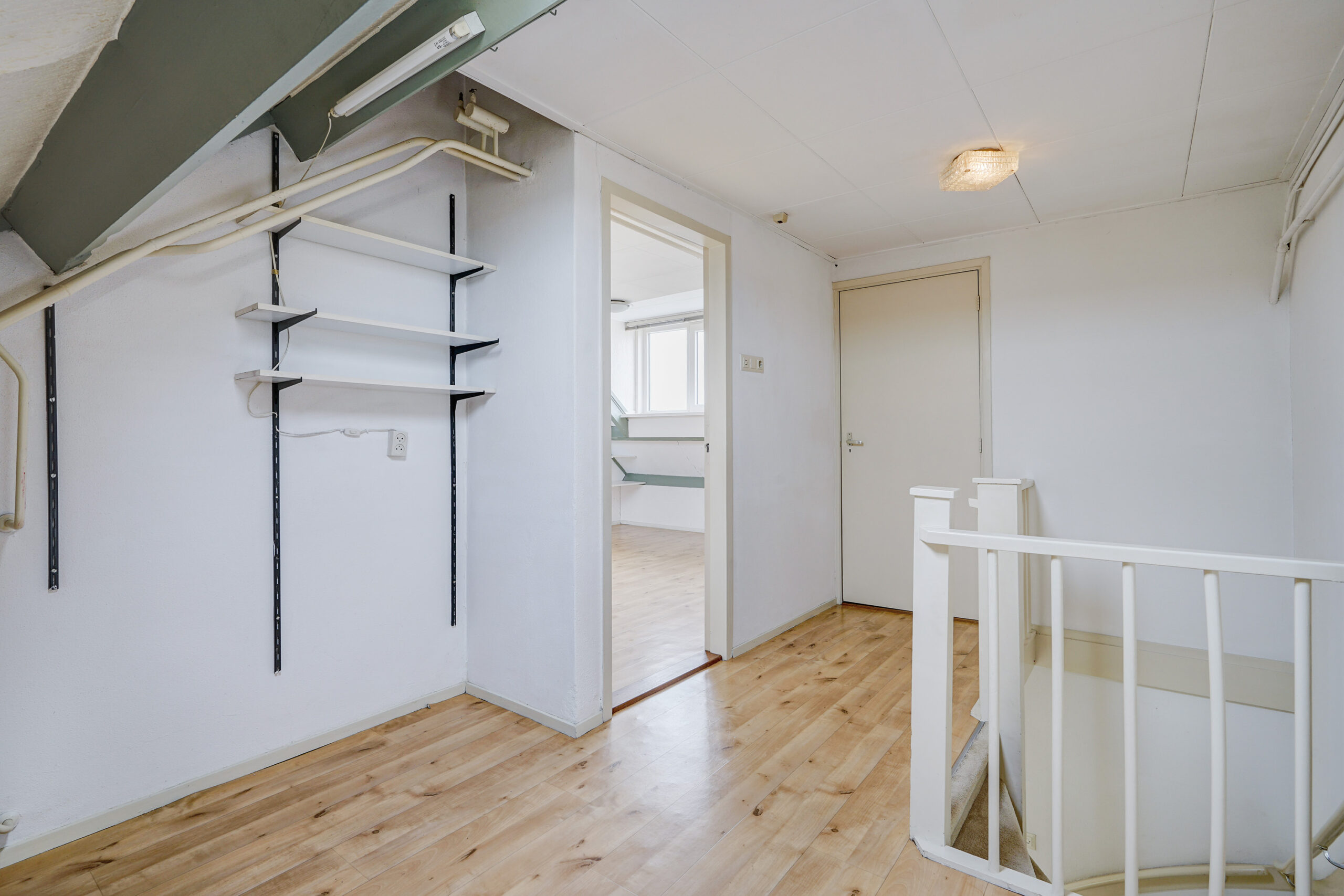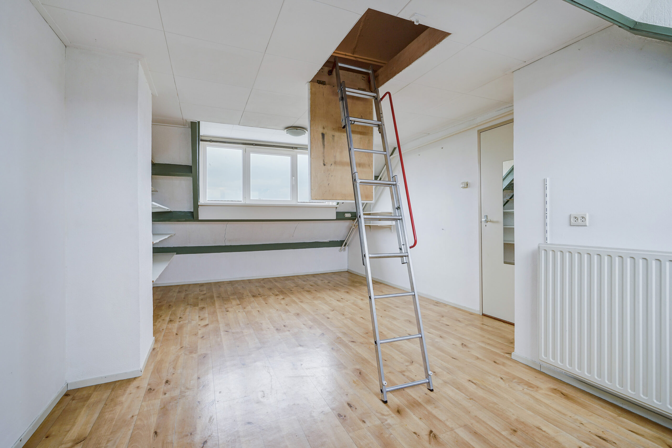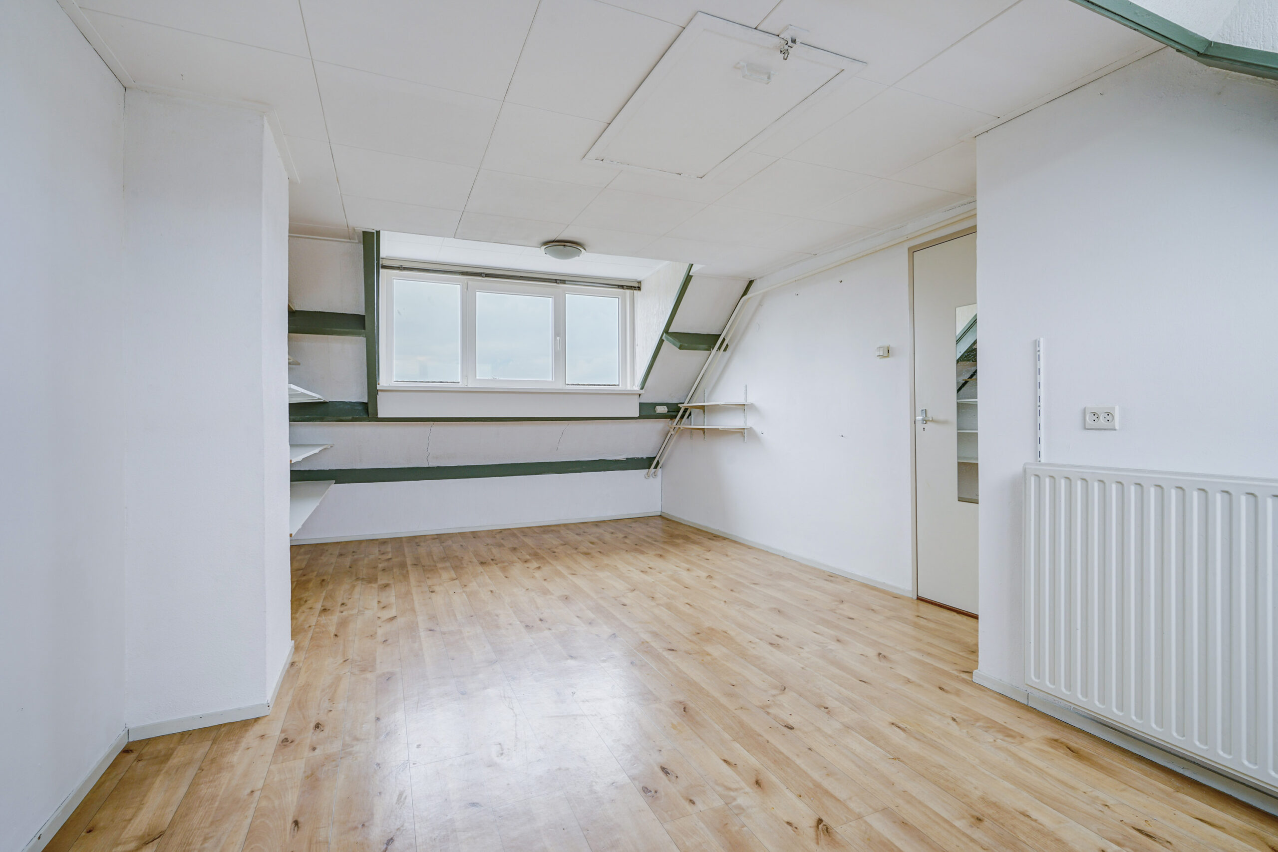Op de tweede verdieping bevindt zich een ruime derde slaapkamer met voldoende daglicht en toegang tot de bergvliering. De overloop, voorzien van een dakraam, bevat de technische ruimte met de opstelplaats van de cv-combiketel en aansluitingen voor de wasmachine en droger.