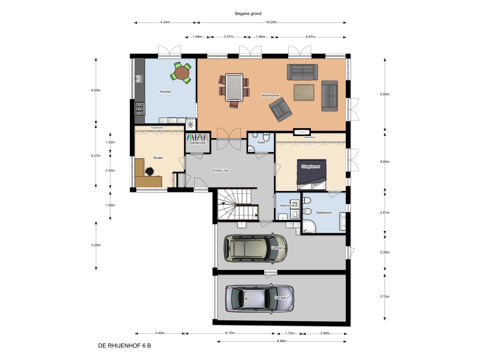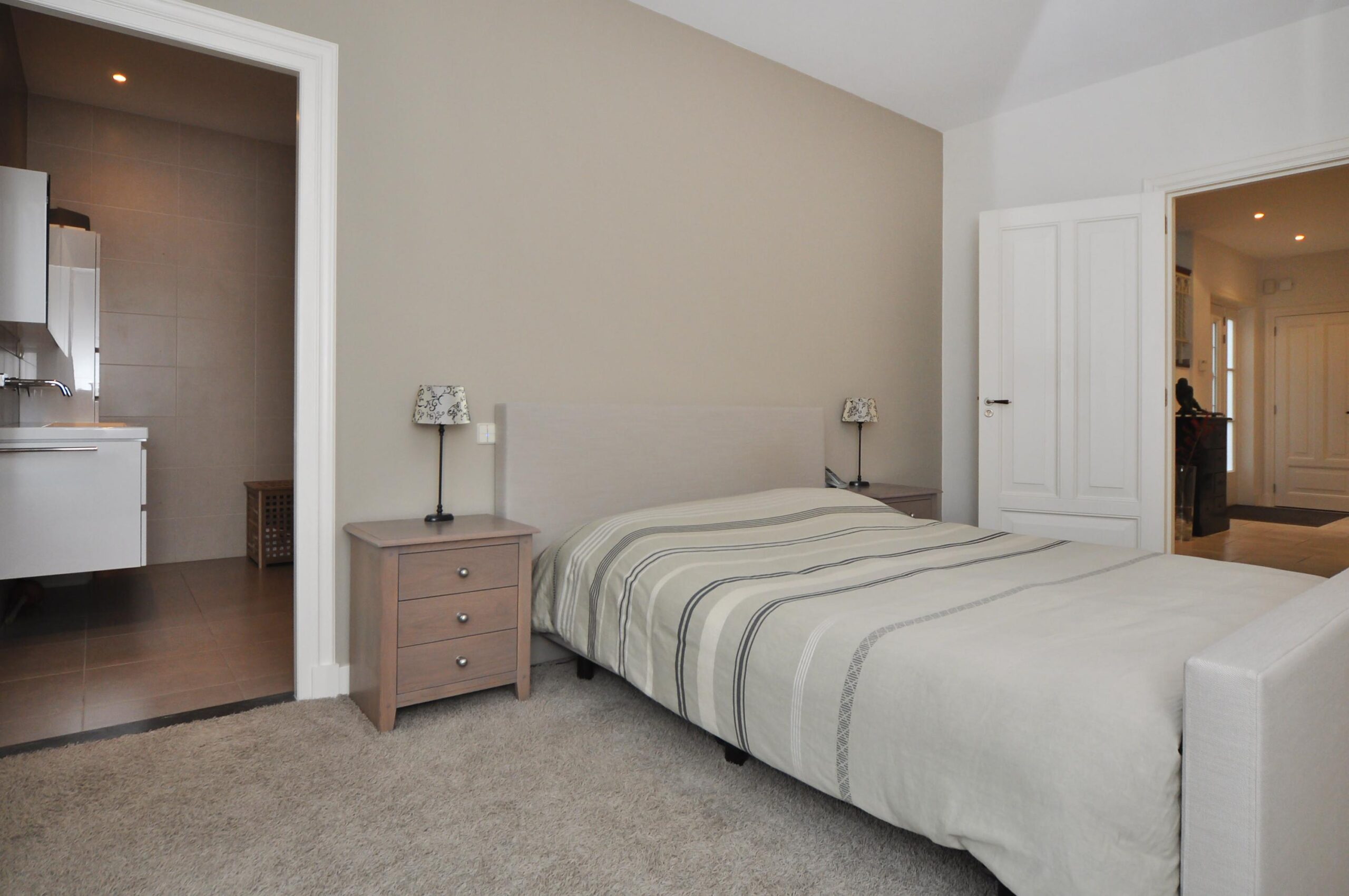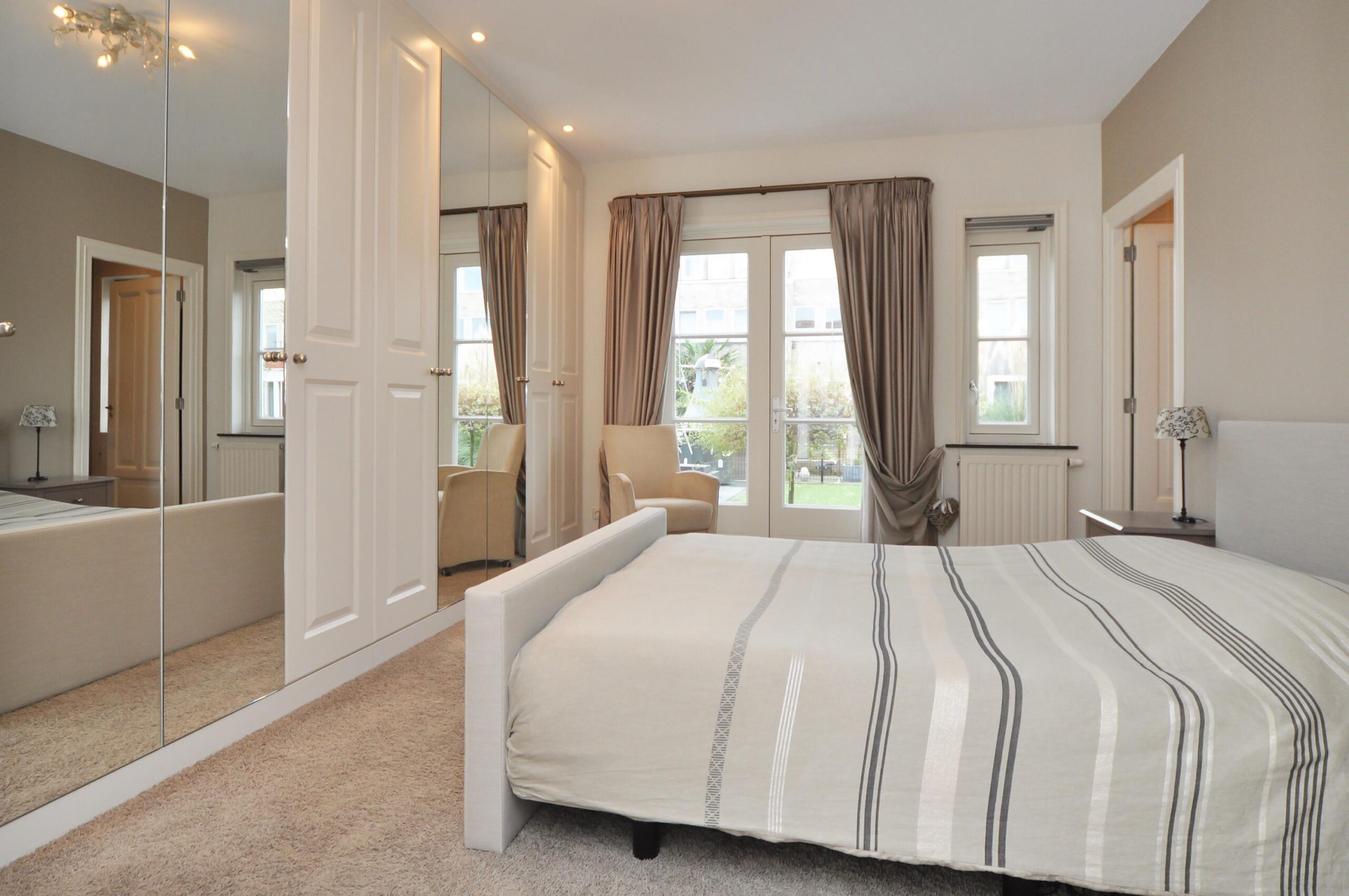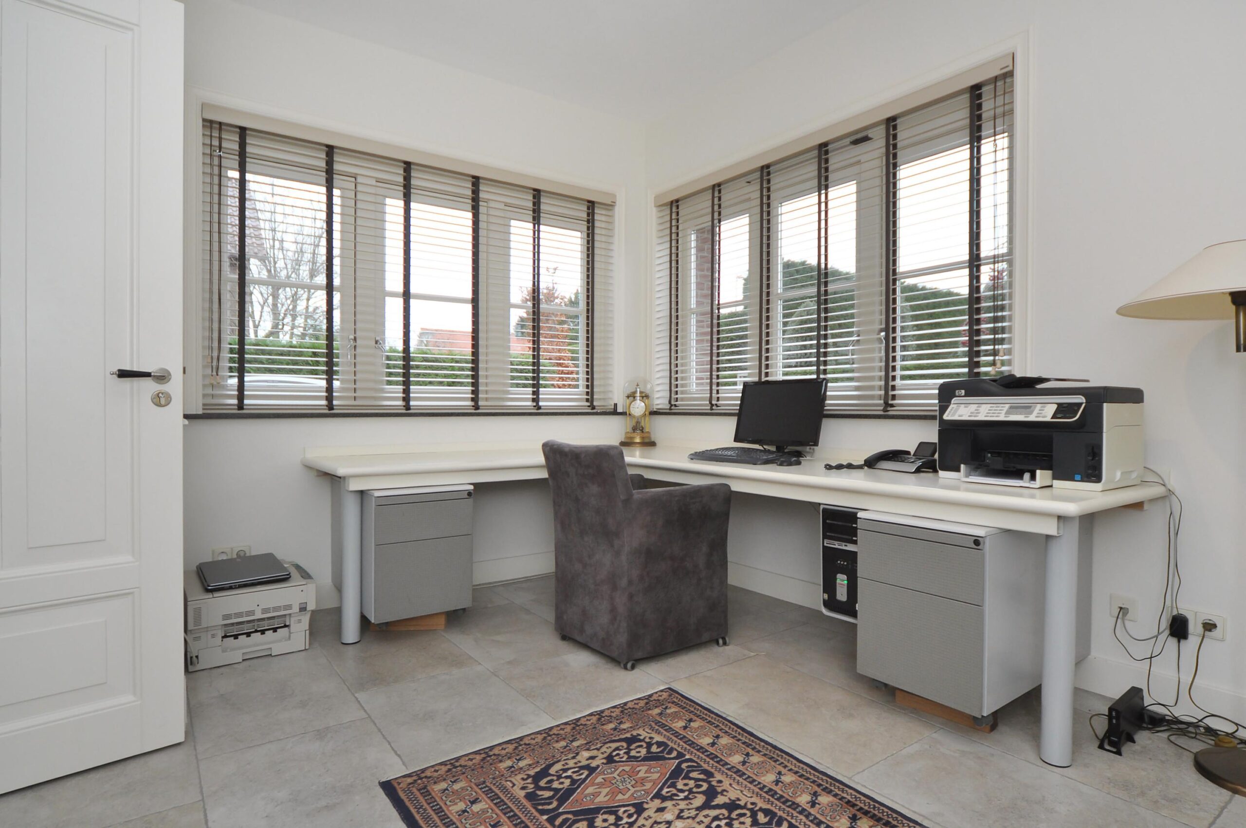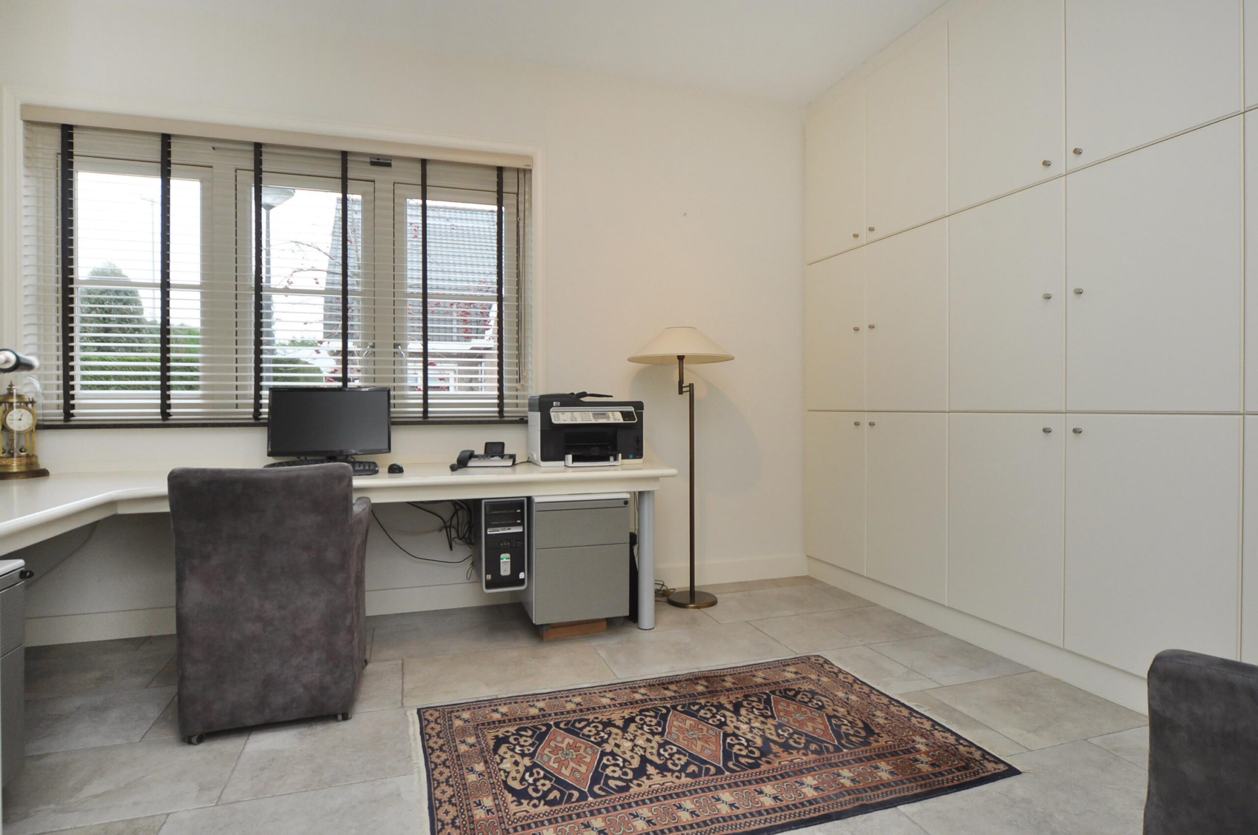 Op de begane grond vinden we verder een stijlvolle studeerkamer met een ingebouwde kastenwand en een royale slaapkamer met en-suite badkamer, voorzien van dubbele wastafel, toilet, bidet en een luxe stoomdouche. Een praktische wasruimte en directe toegang tot de dubbele garage completeren deze verdieping. De gehele woning is voorzien van vloerverwarming, voor extra comfort.