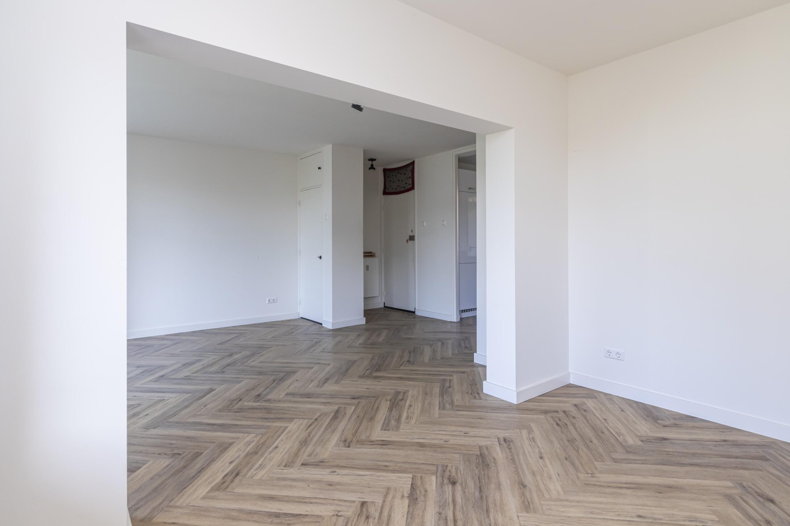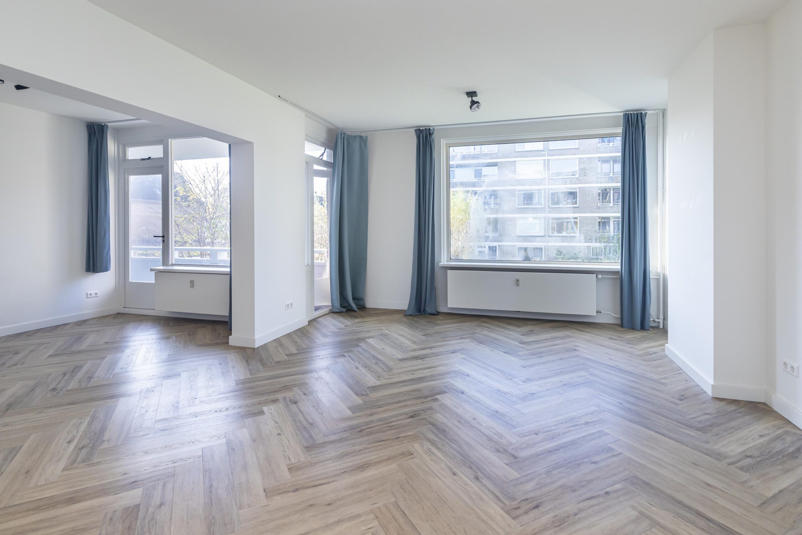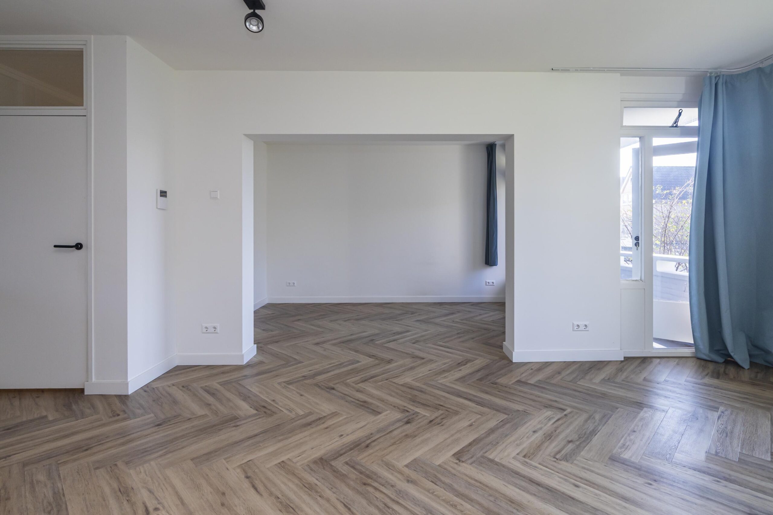 De woon-/eetkamer is ruim en licht dankzij de hoekligging en grote raampartijen. Hier is een praktische inpandige kast en heb je toegang tot het balkon aan de westzijde.