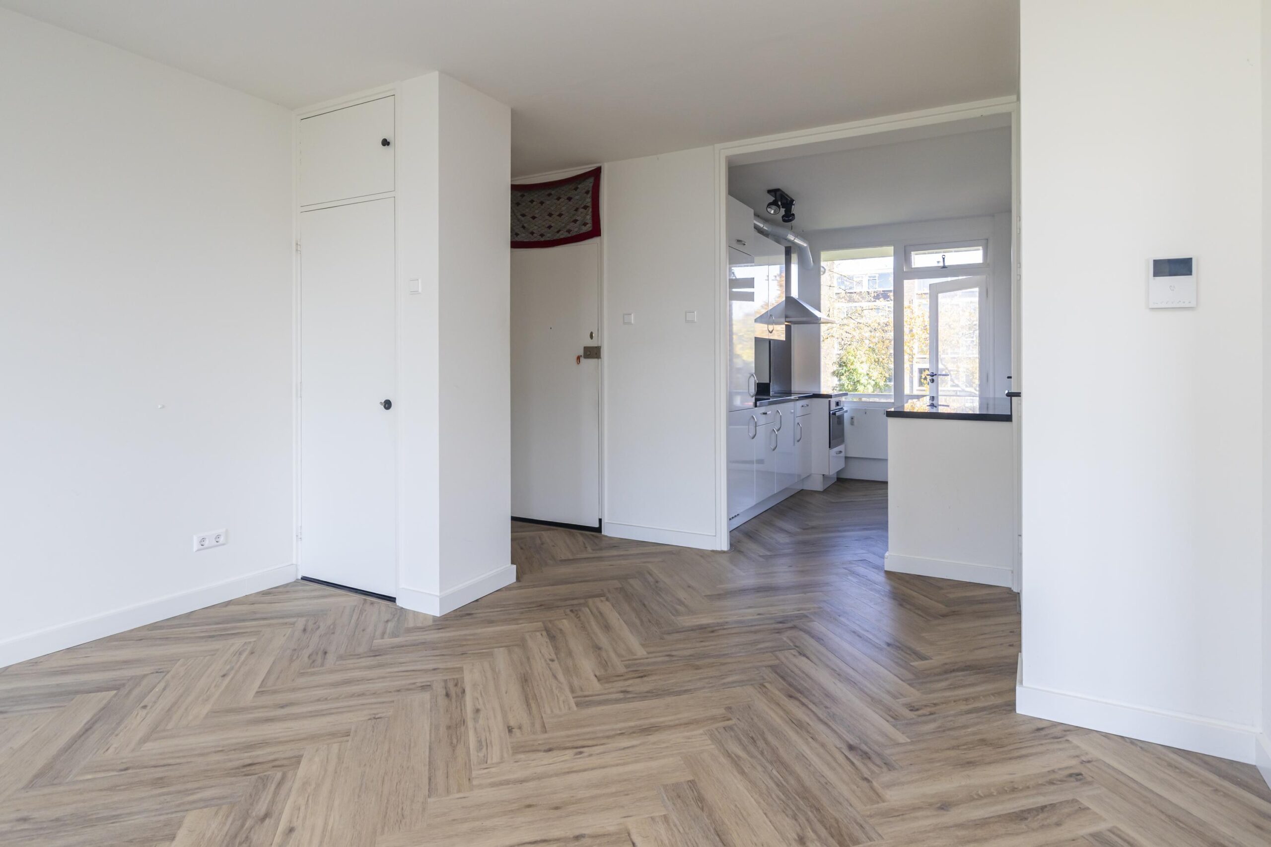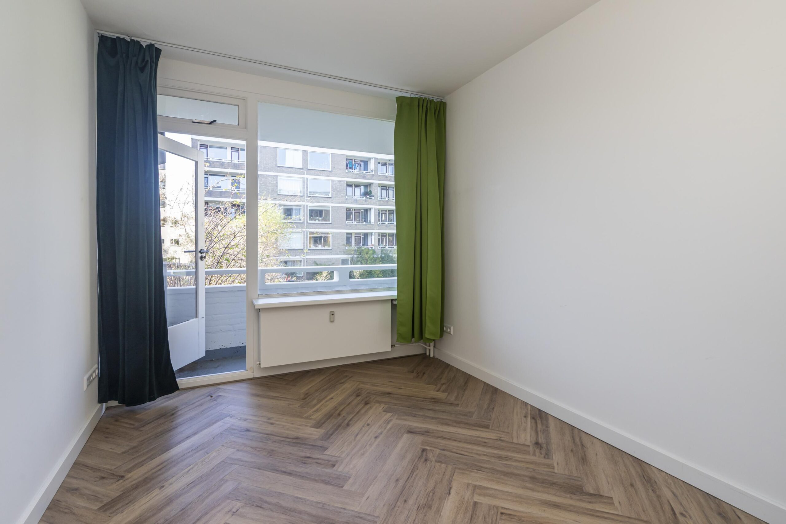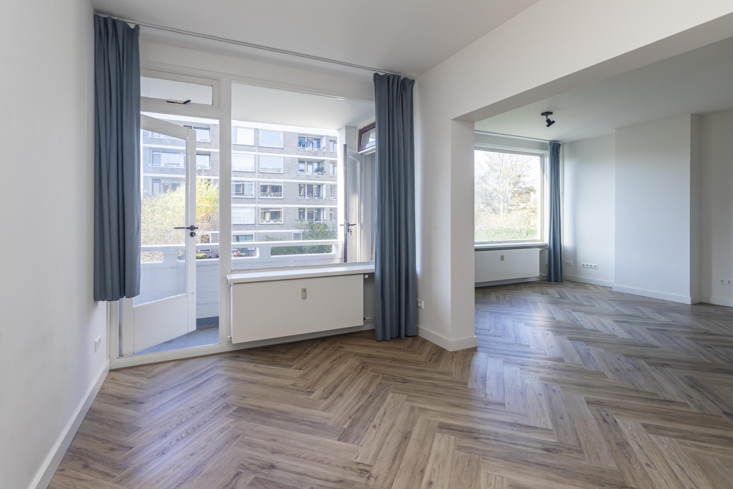 De woon-/eetkamer is ruim en licht dankzij de hoekligging en grote raampartijen. Hier is een praktische inpandige kast en heb je toegang tot het balkon aan de westzijde.