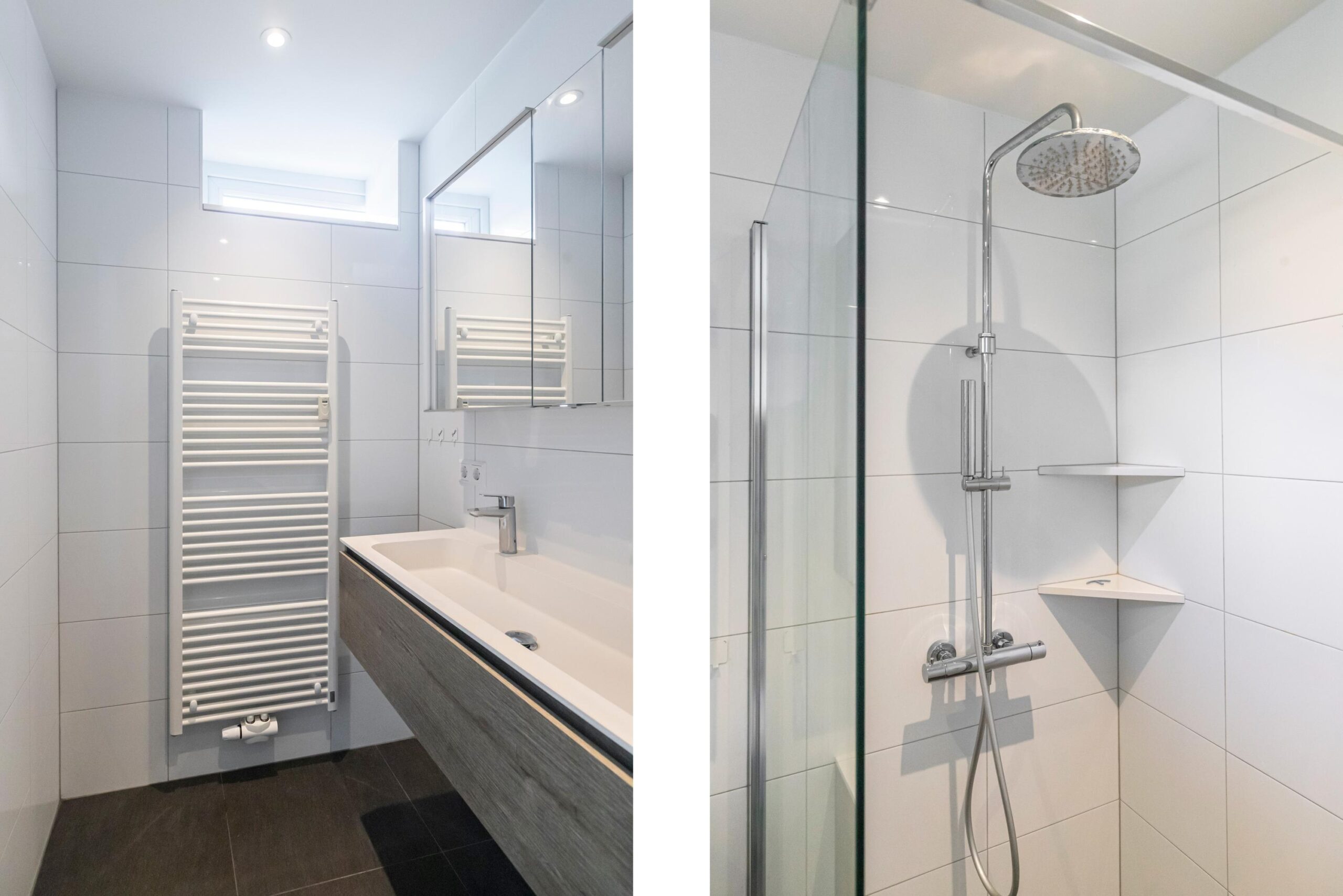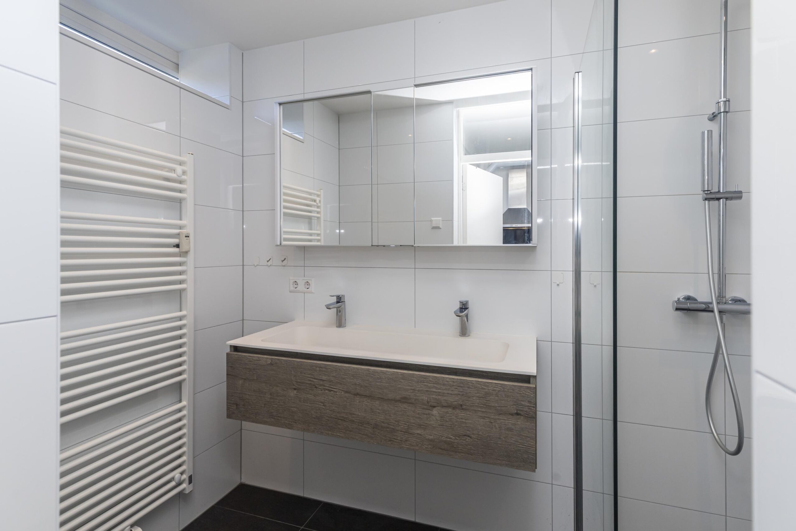 De badkamer is direct via de keuken toegankelijk en volledig betegeld. De ruimte is verzorgd en uitgerust met een inloopdouche, wastafelmeubel, luxe spiegelkast met verlichting, radiator en mechanische ventilatie.