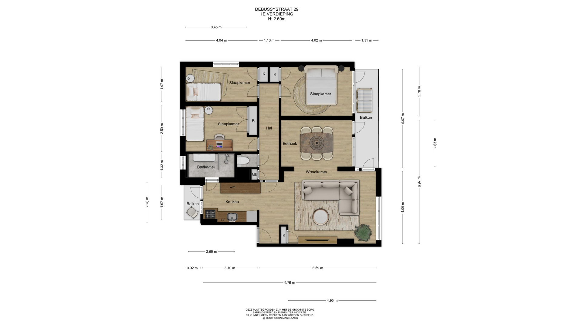 Aan de voorzijde van de woning bevinden zich twee slaapkamers. De derde slaapkamer ligt aan de achterzijde en heeft eveneens toegang tot het balkon. Alle kamers beschikken over vaste kasten. De PVC-vloer loopt door in de hele woning en de strakke afwerking maakt het geheel compleet.