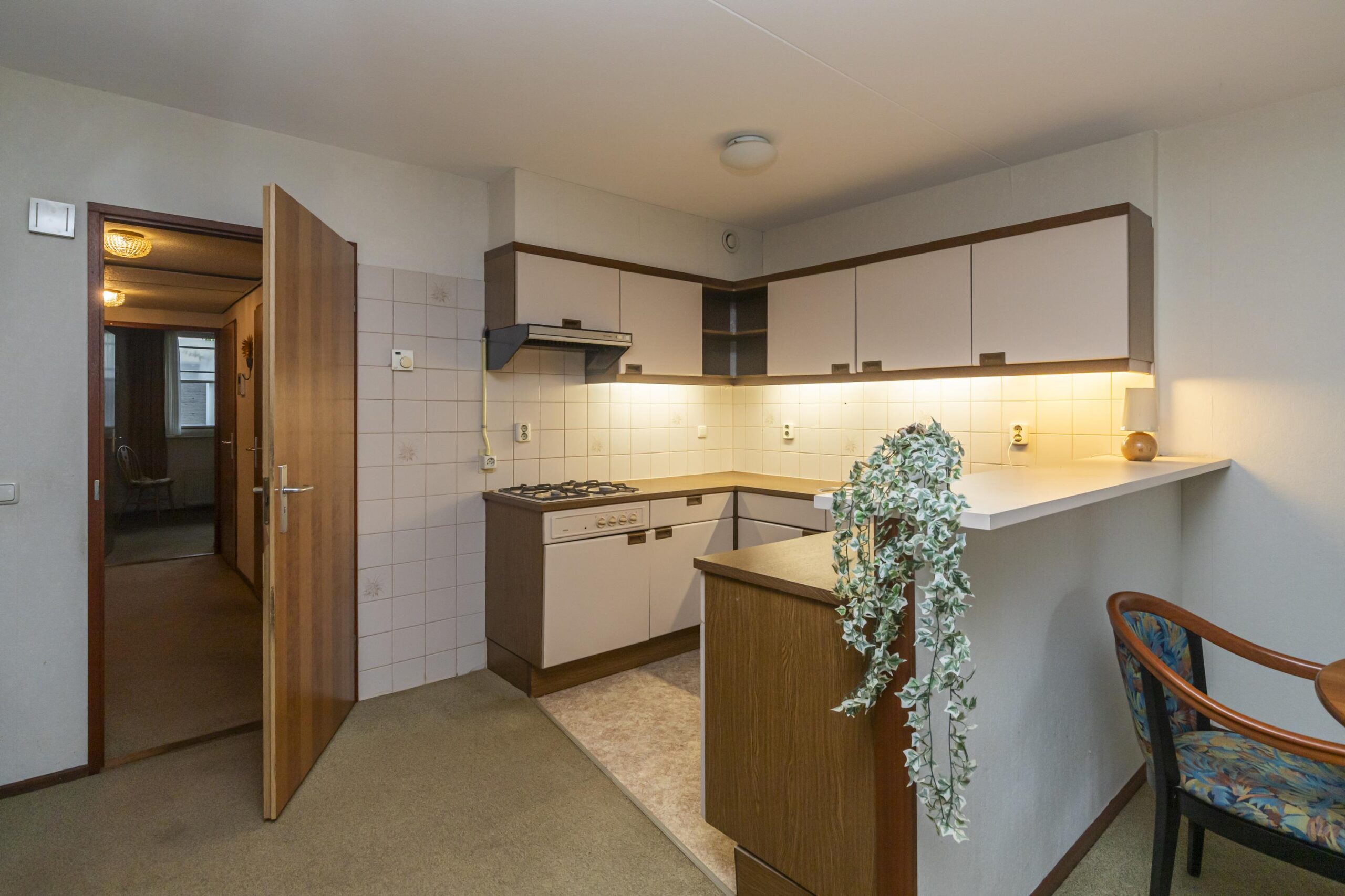 Bij binnenkomst in de woning stap je binnen in de hal, die toegang biedt tot alle vertrekken. De lichte woonkamer met open keuken biedt ruimte voor zowel een zit- als eethoek. Grote raampartijen zorgen voor een prettige lichtinval en een fijn uitzicht op de tuin. De keuken is functioneel ingericht en voorzien van een 4-pitsgaskookplaat en voldoende kastruimte.