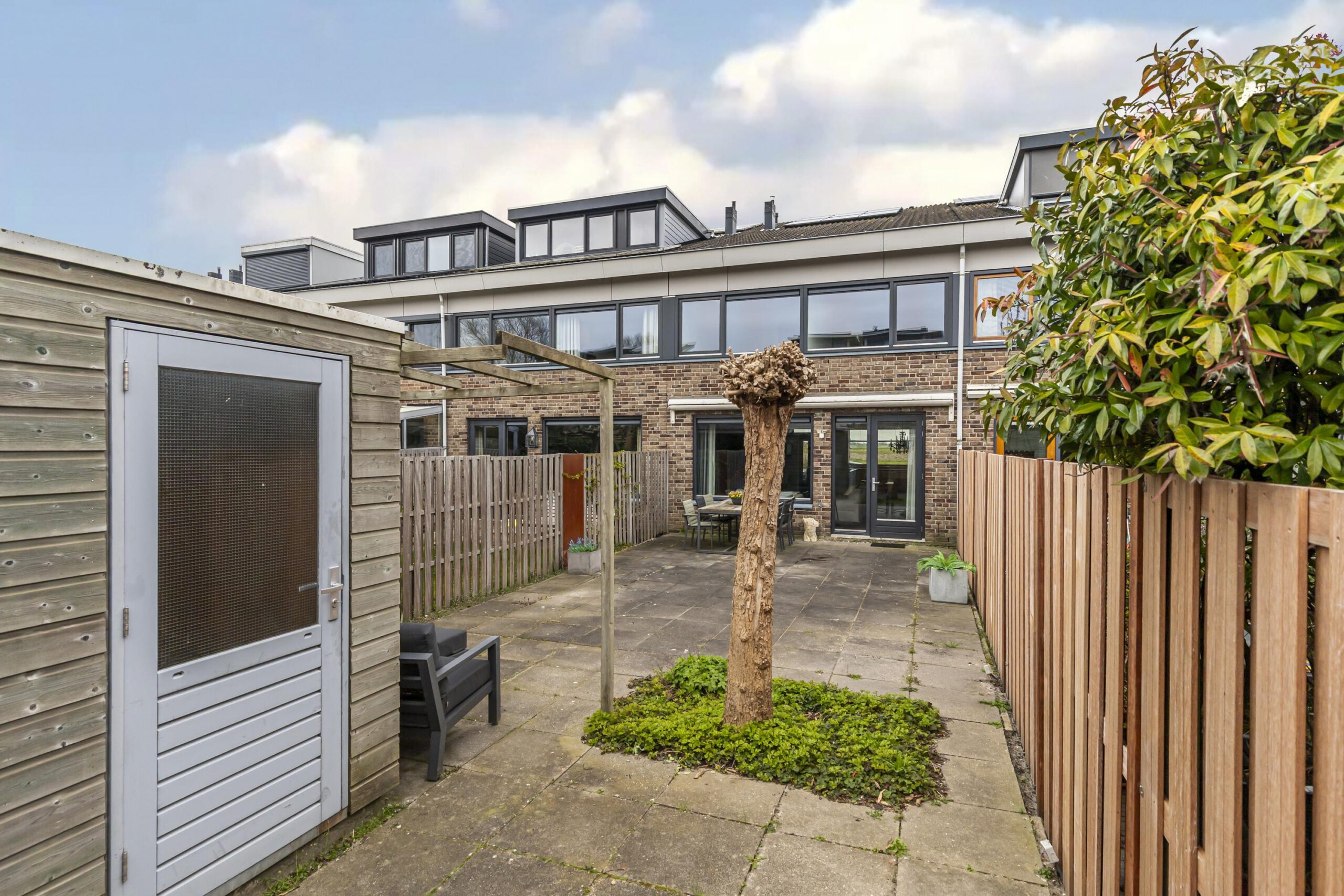 De achtertuin is gunstig gelegen op het zuidwesten, waardoor je hier tot laat in de avond van de zon kunt genieten. Een fijne plek om buiten te zitten in alle rust. Tevens is er een ruime houten berging en een achterom aanwezig in de achtertuin. Aan de voorzijde van de woning heb je vrij uitzicht over het groen en water, wat zorgt voor een ruim, open en landelijk gevoel.