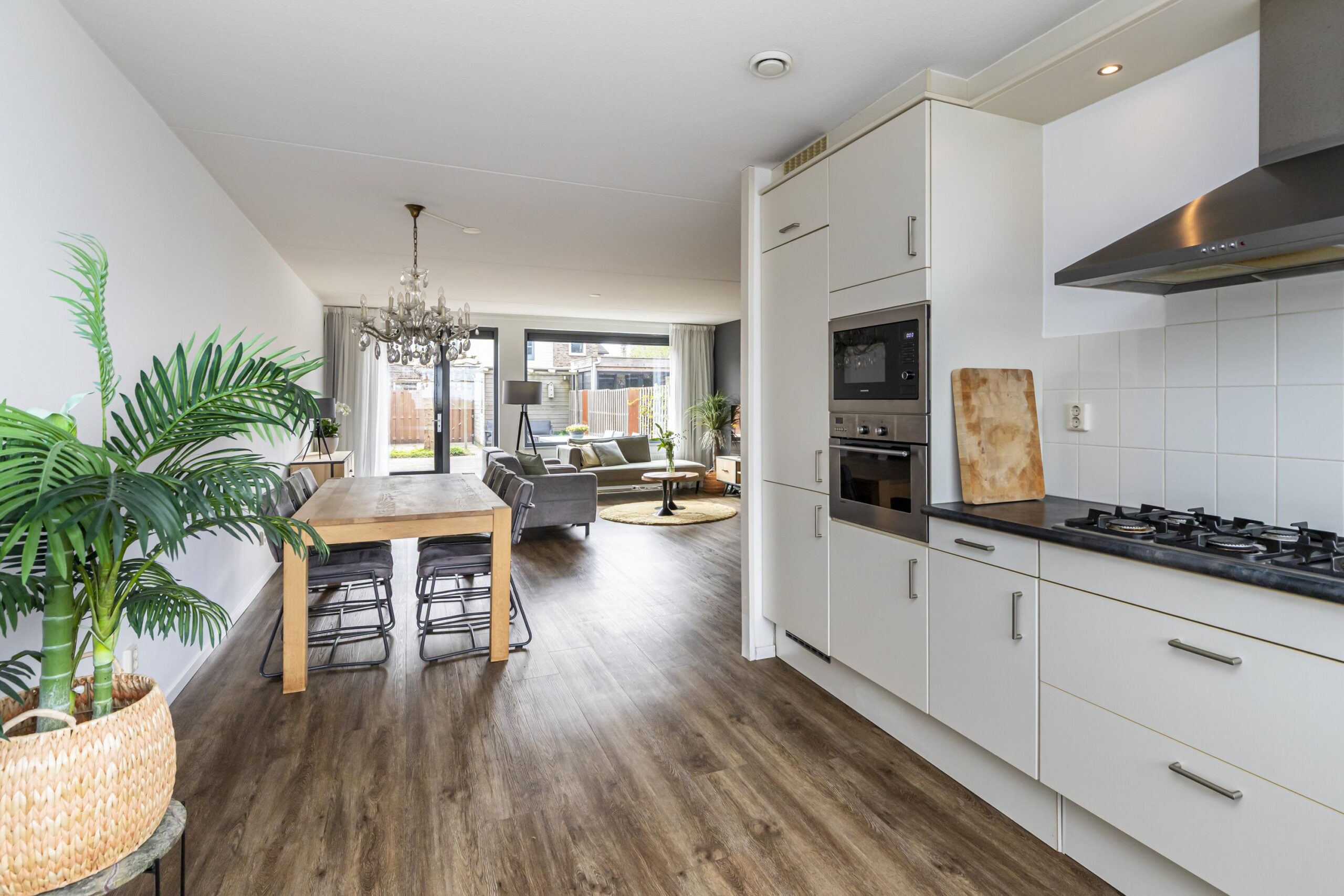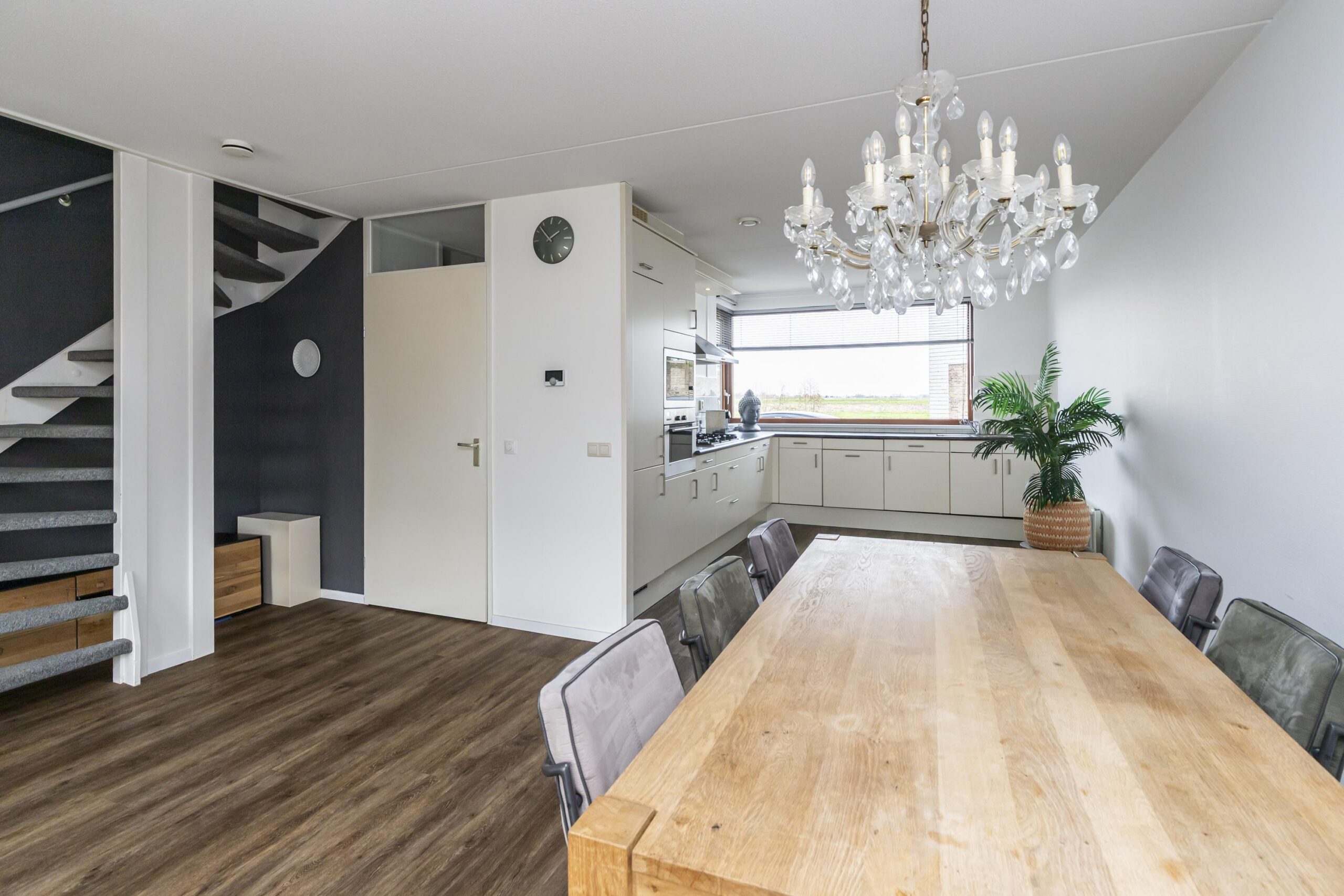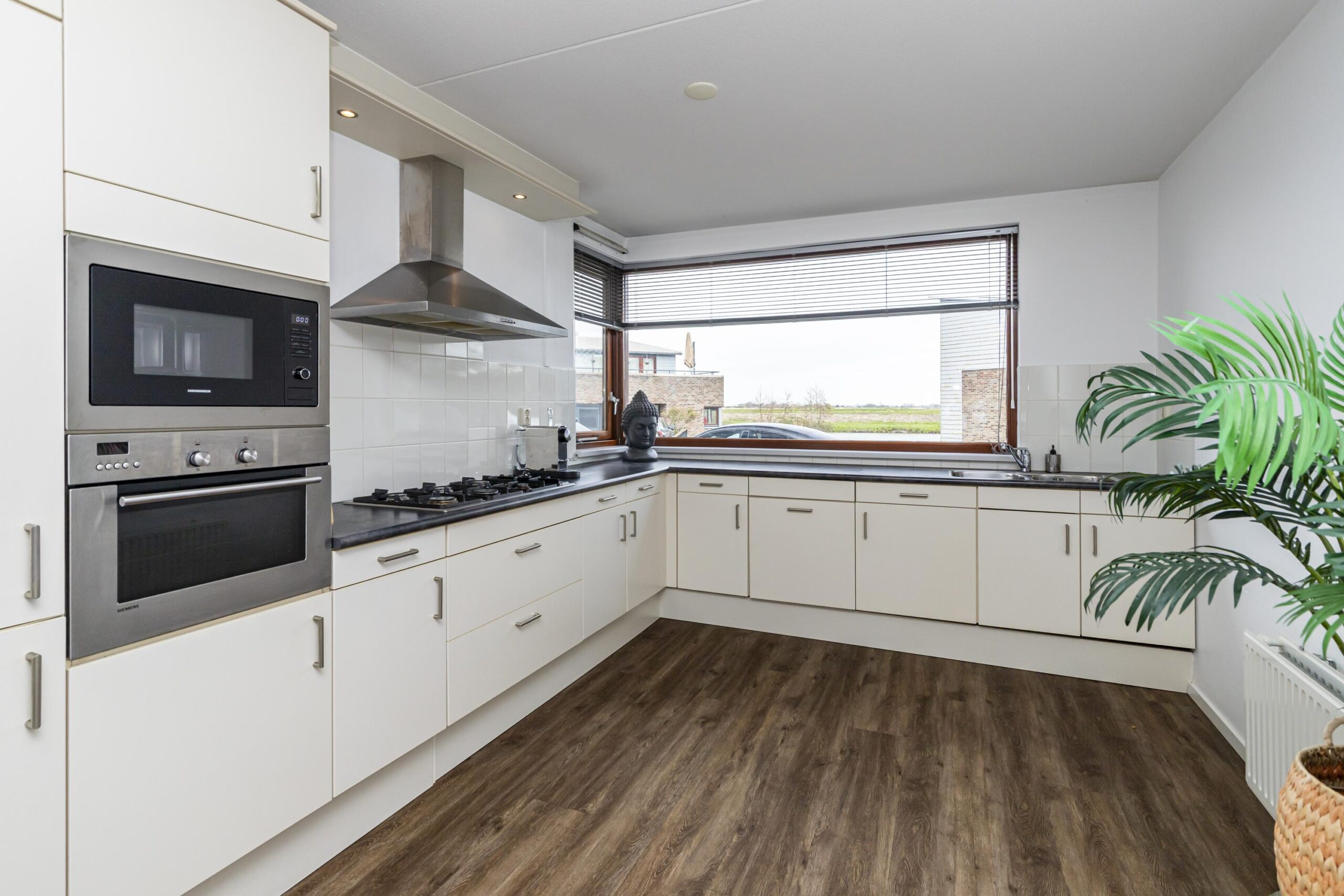 Via de entree kom je binnen in de ruime hal. Hier bevinden zich de meterkast en een toilet inclusief fonteintje. Vanuit de hal loop je door naar de lichte en ruime woonkamer aan de achterzijde van de woning. Dankzij de grote ramen komt hier veel daglicht naar binnen en er is direct toegang tot de achtertuin. De open keuken ligt aan de voorzijde van de woning. Vanuit het keukenraam kijk je prachtig vrij uit over het water en groen op de beschermde Landscheidingsdijk. De keuken is uitgerust met diverse inbouwapparatuur, waaronder een koel-/vriescombinatie, magnetron, oven, 6-pits gaskookplaat, afzuigkap en een vaatwasser.