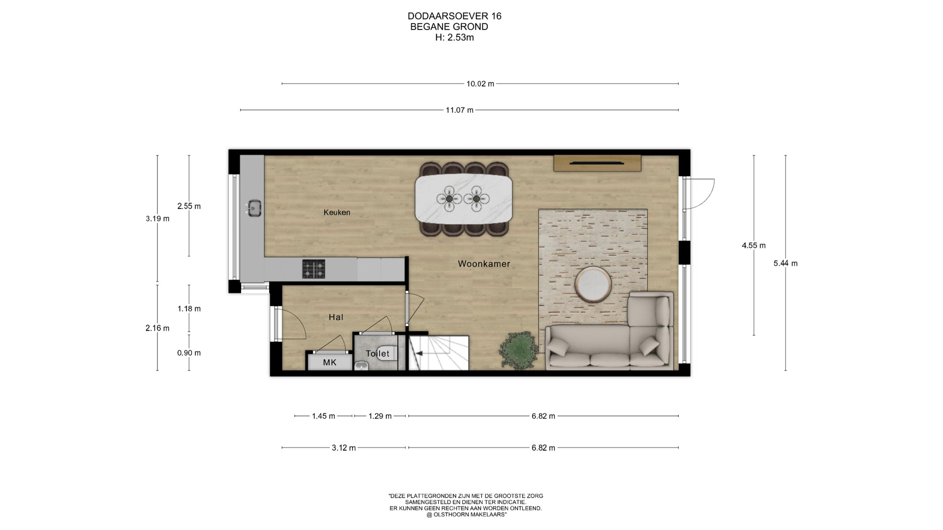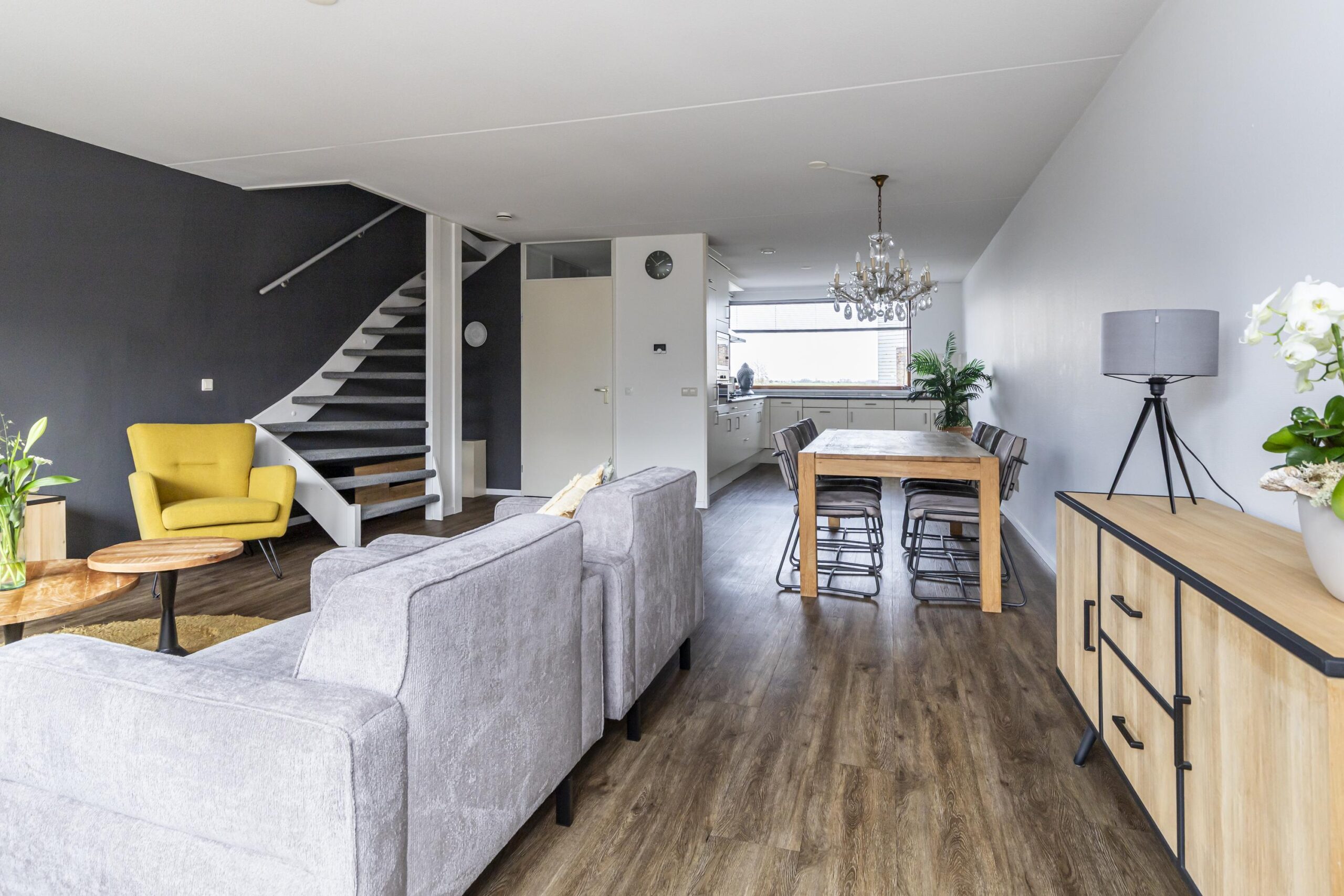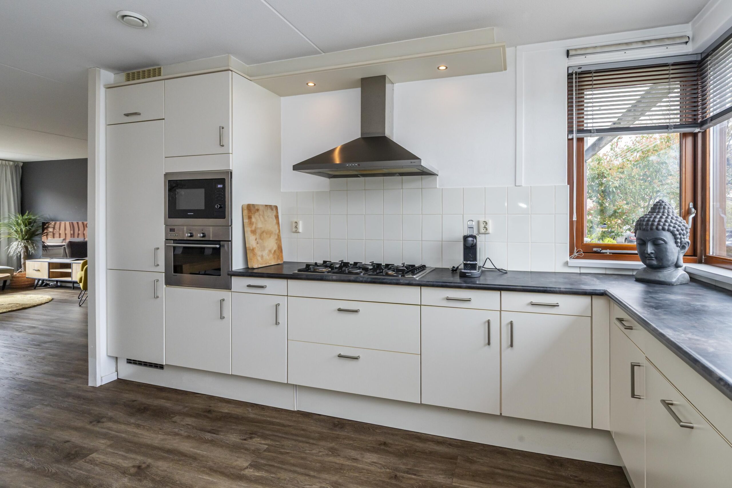 Via de entree kom je binnen in de ruime hal. Hier bevinden zich de meterkast en een toilet inclusief fonteintje. Vanuit de hal loop je door naar de lichte en ruime woonkamer aan de achterzijde van de woning. Dankzij de grote ramen komt hier veel daglicht naar binnen en er is direct toegang tot de achtertuin. De open keuken ligt aan de voorzijde van de woning. Vanuit het keukenraam kijk je prachtig vrij uit over het water en groen op de beschermde Landscheidingsdijk. De keuken is uitgerust met diverse inbouwapparatuur, waaronder een koel-/vriescombinatie, magnetron, oven, 6-pits gaskookplaat, afzuigkap en een vaatwasser.