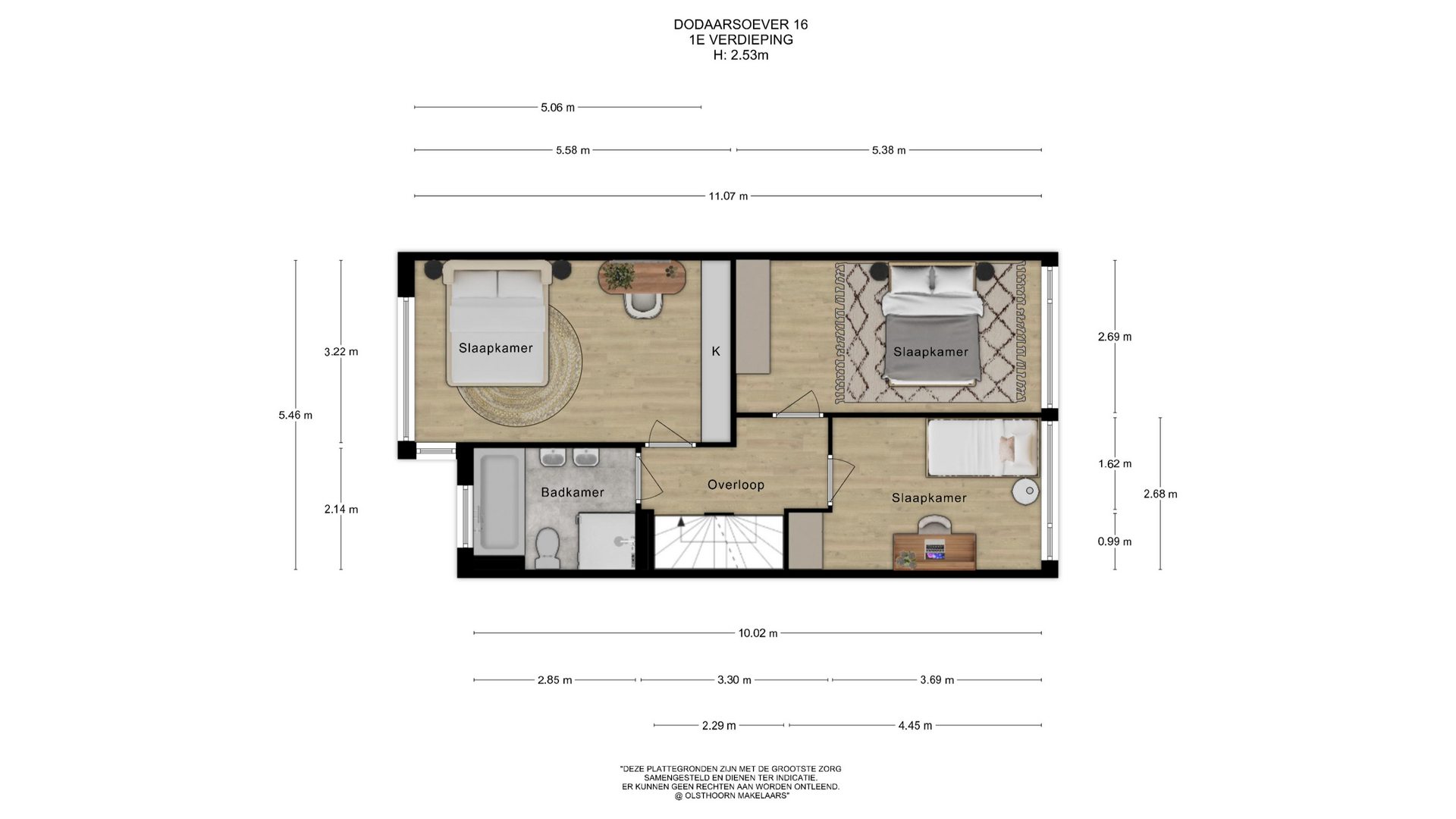 Op deze verdieping zijn drie goed bemeten slaapkamers aanwezig. Twee slaapkamers liggen aan de achterzijde van de woning en één slaapkamer bevindt zich aan de voorzijde met ingebouwde kledingkasten en schuifdeuren. Het is een mogelijkheid om bijvoorbeeld een van deze kamers te gebruiken als werk-/studeerkamer. De badkamer ligt eveneens aan de voorzijde van de woning en is compleet ingericht met een douchecabine, whirlpool met ledverlichting, toilet en dubbele wastafel, alsmede een inbouwtelevisie. Het uitzicht vanuit de slaapkamer en de zolderverdieping over de Driemanspolder is adembenemend en wisselt alle vier de seizoenen.