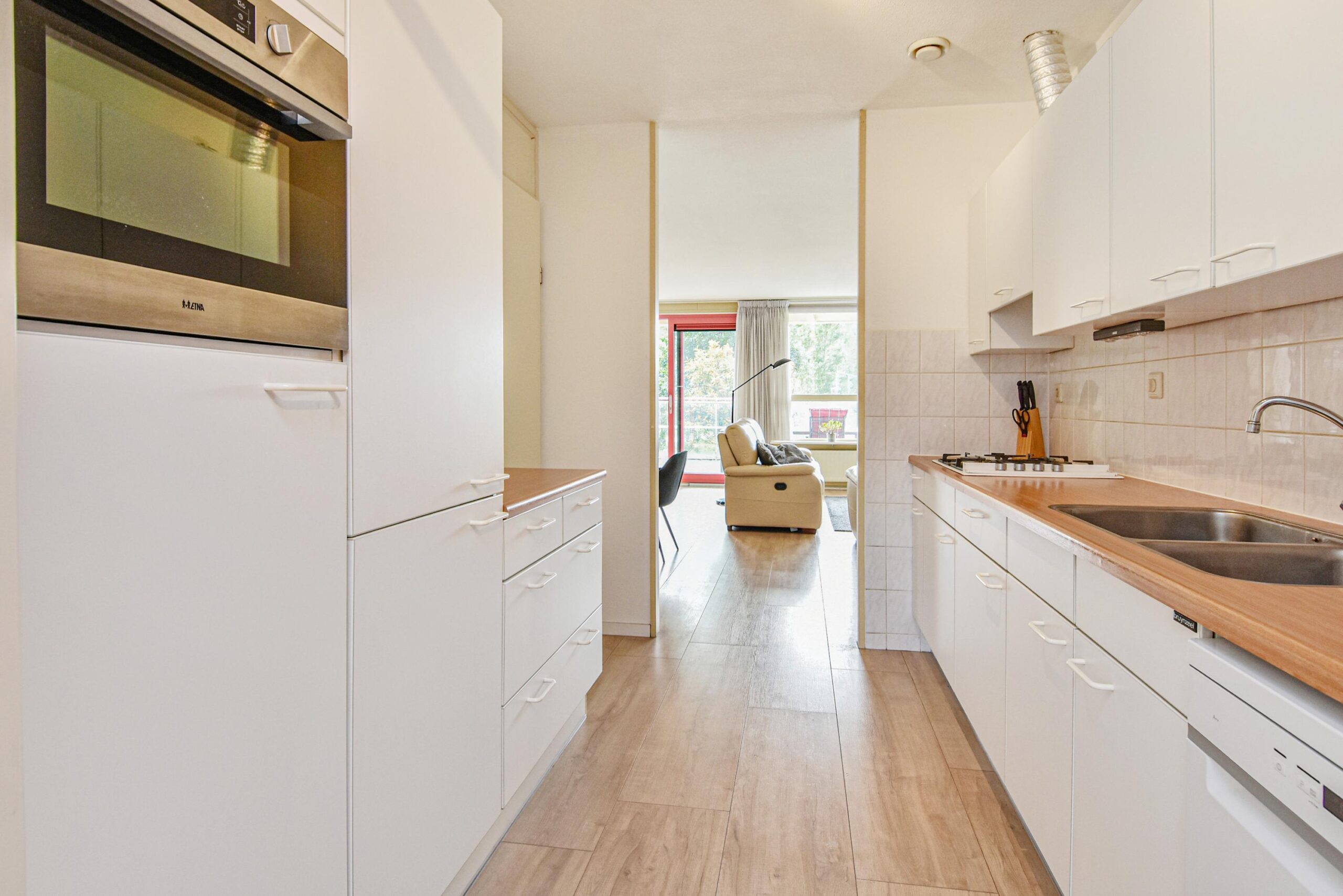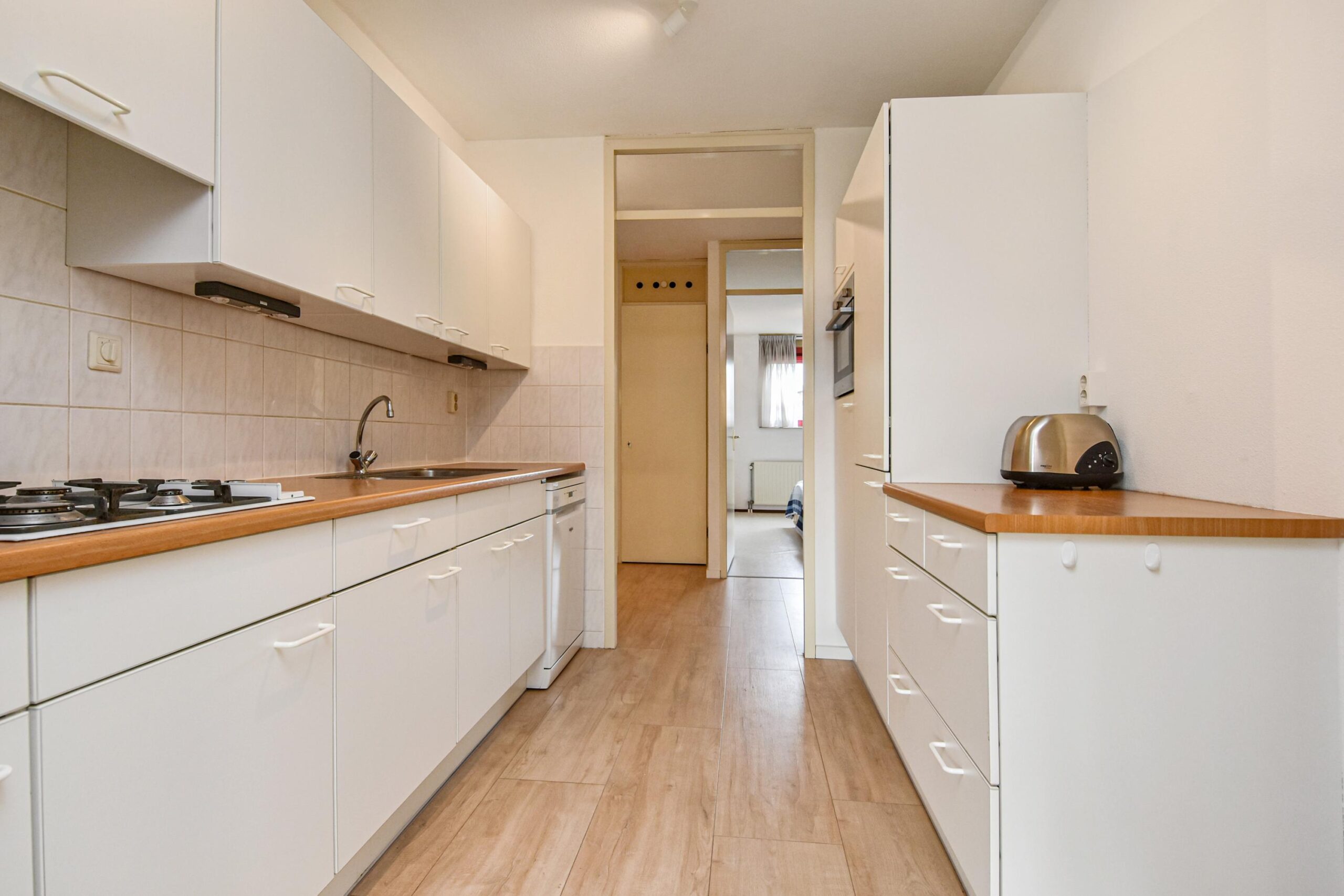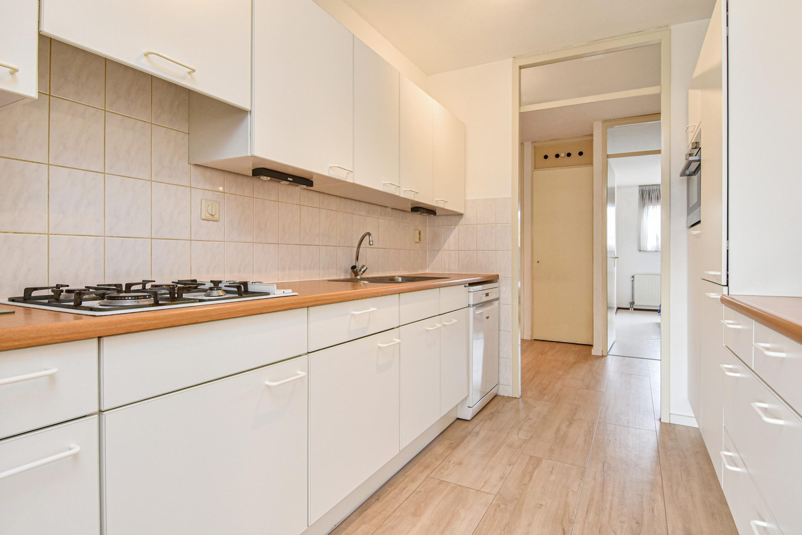 De aan de woonkamer grenzende keuken is praktisch en functioneel ingericht, voorzien van ruime kastruimte en twee werkbladen. De keuken is uitgerust met diverse inbouwapparatuur. Naast de keuken is de bijkeuken met veel bergruimte, de HR CV ketel en is er o.a. ruimte voor een wasmachine en wasdroger.