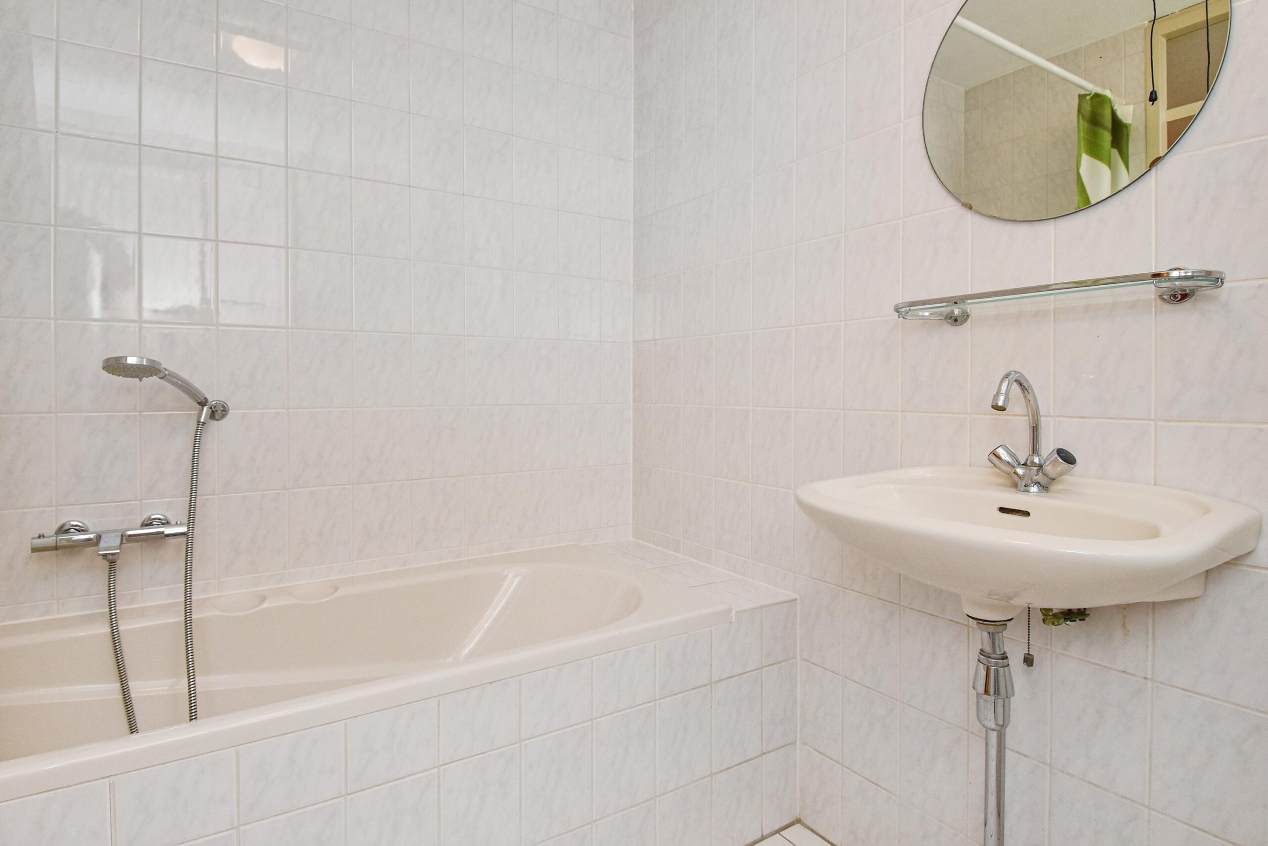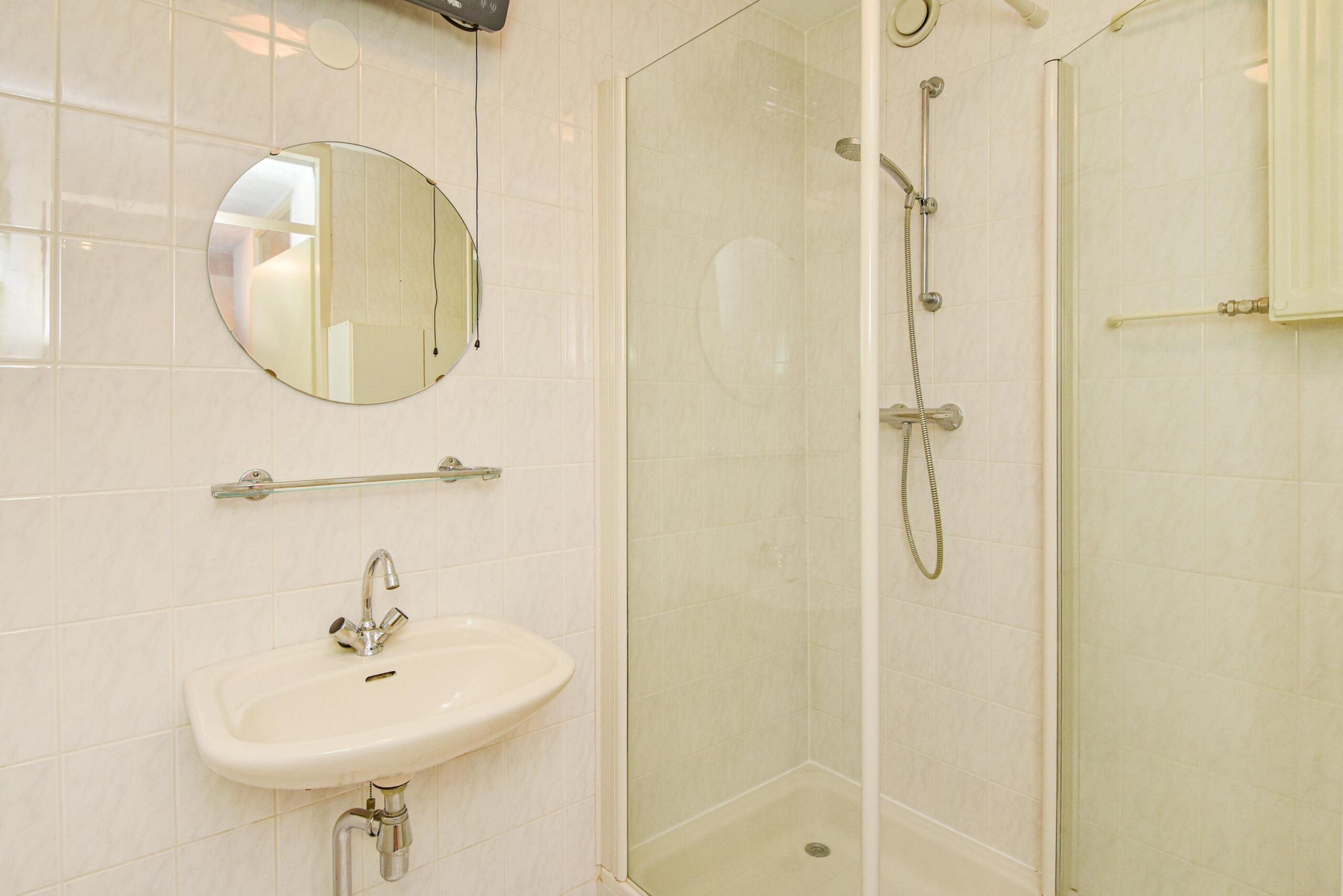 De badkamer is royaal van formaat en beschikt over een wastafel, een ruime douche en een ligbad. Het toilet is separaat gelegen, wat het gebruiksgemak verhoogt.