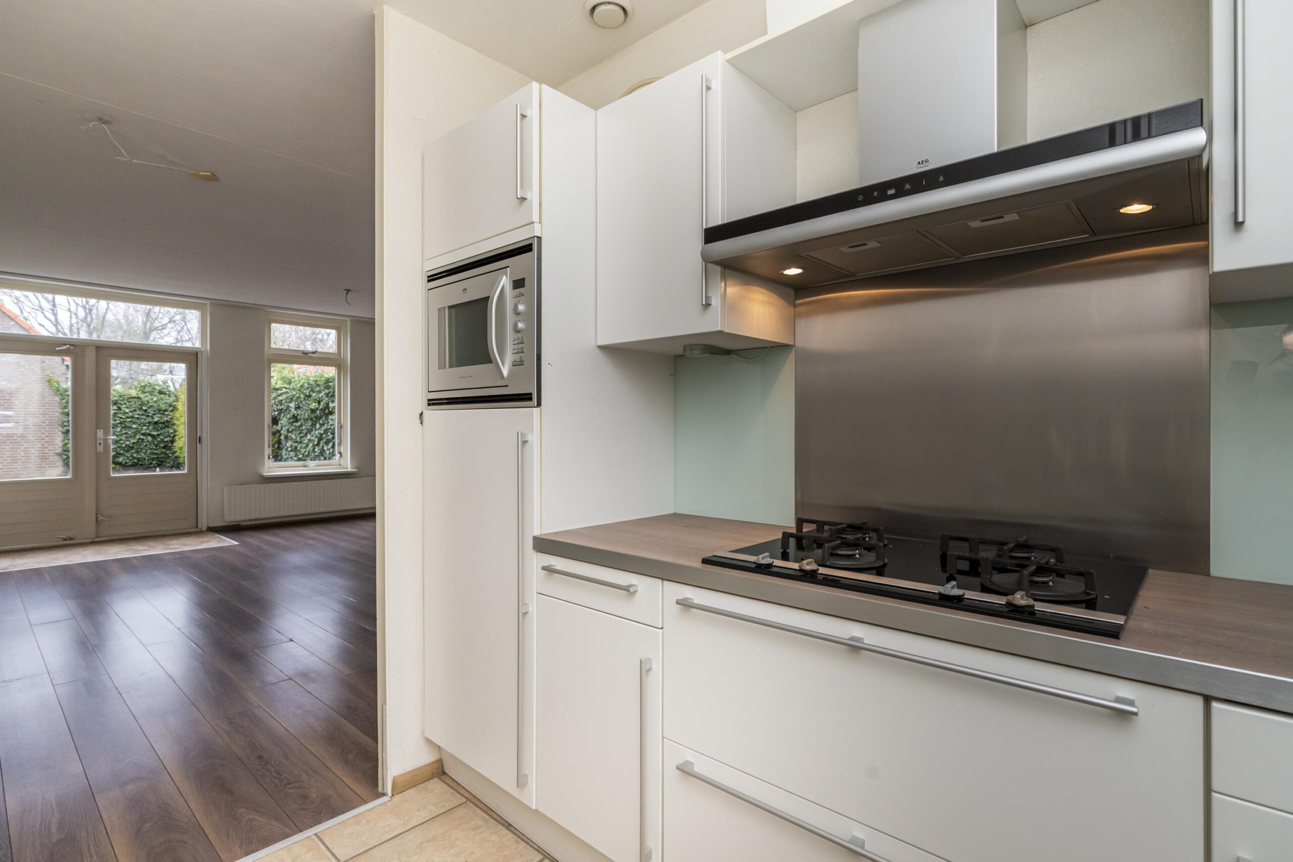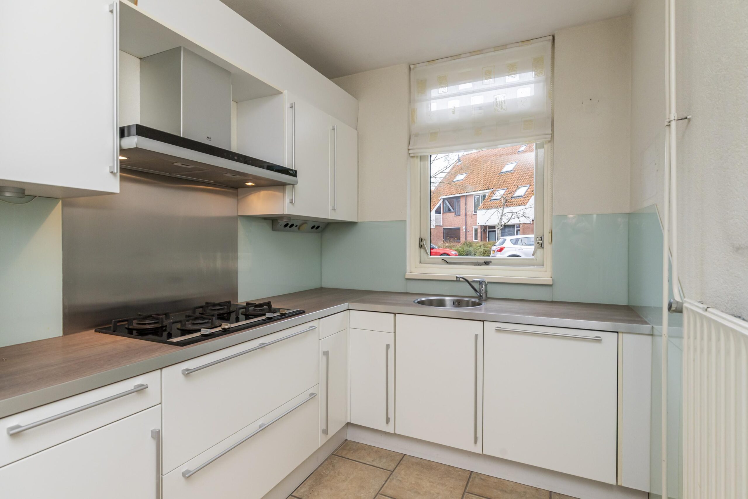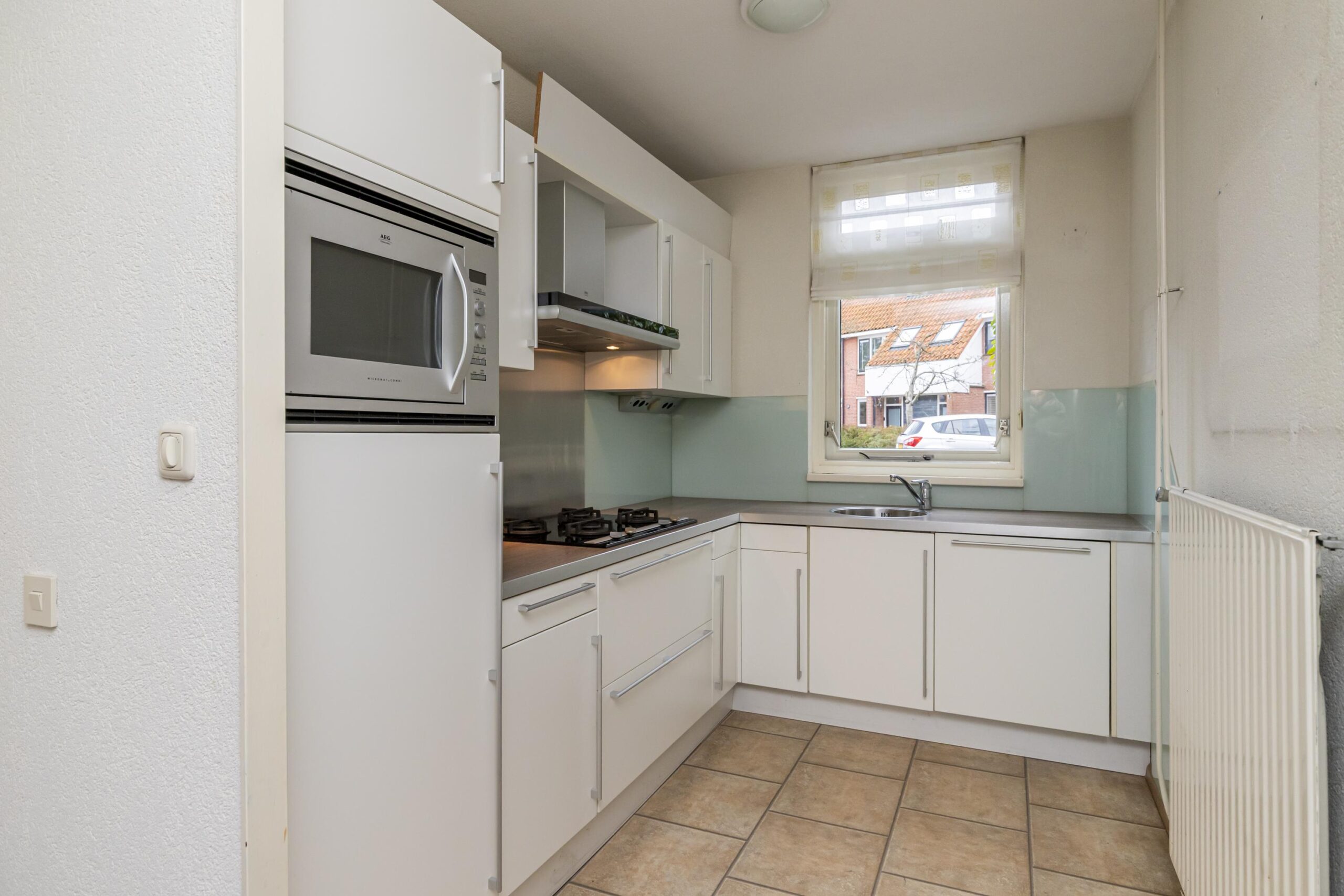 Aan de voorzijde bevindt zich de keuken in een praktische L-opstelling. De keuken is in 2024 gerenoveerd en heeft een frisse uitstraling en goede werk- en bergruimte.