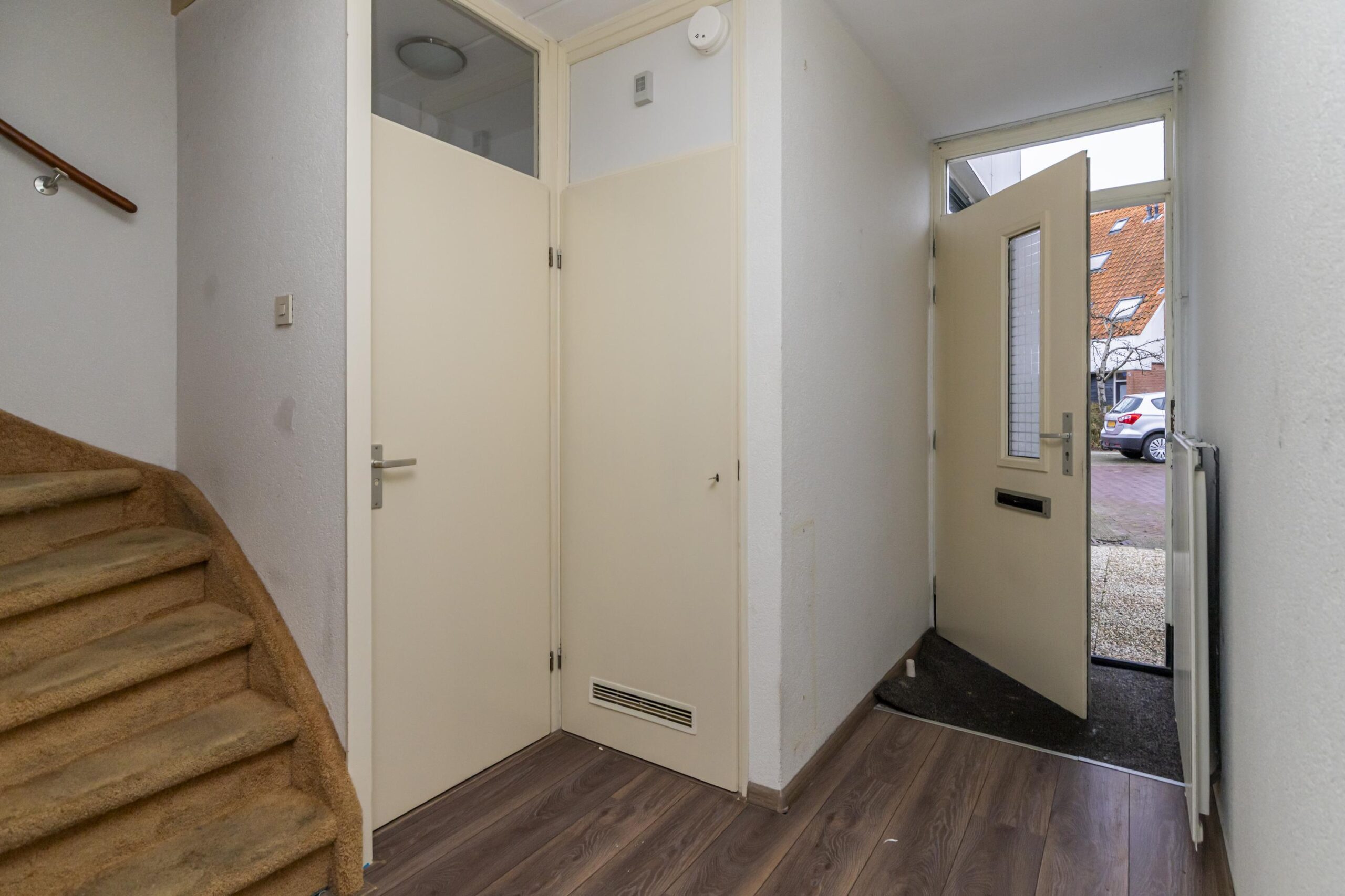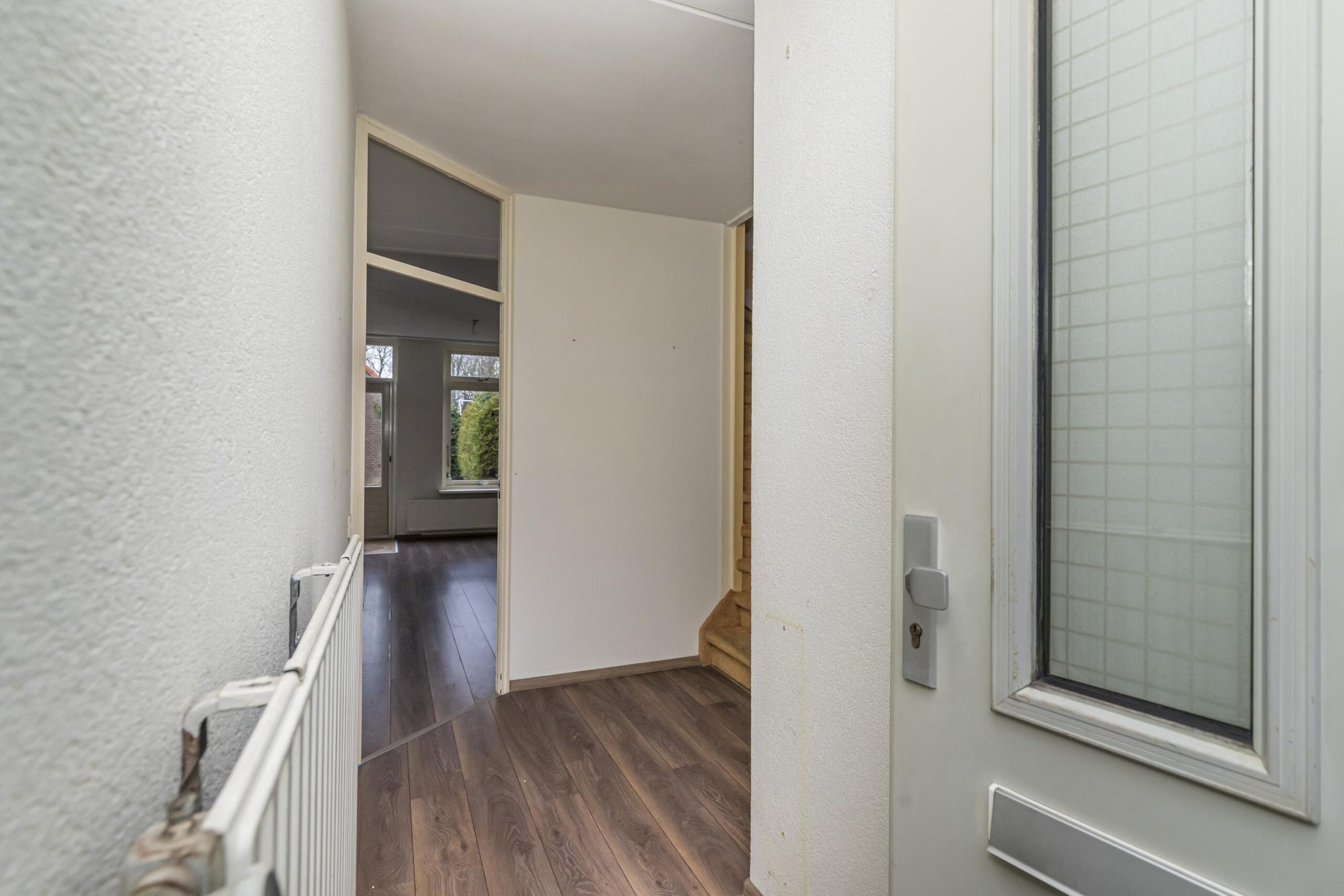 Via de voortuin bereik je de entree van de woning. In de hal bevinden zich het toilet en de trap naar de eerste verdieping. De woonkamer ligt aan de achterzijde en is heerlijk licht. Dankzij de openslaande deuren stap je zo de tuin in, wat zorgt voor een fijne verbinding tussen binnen en buiten.