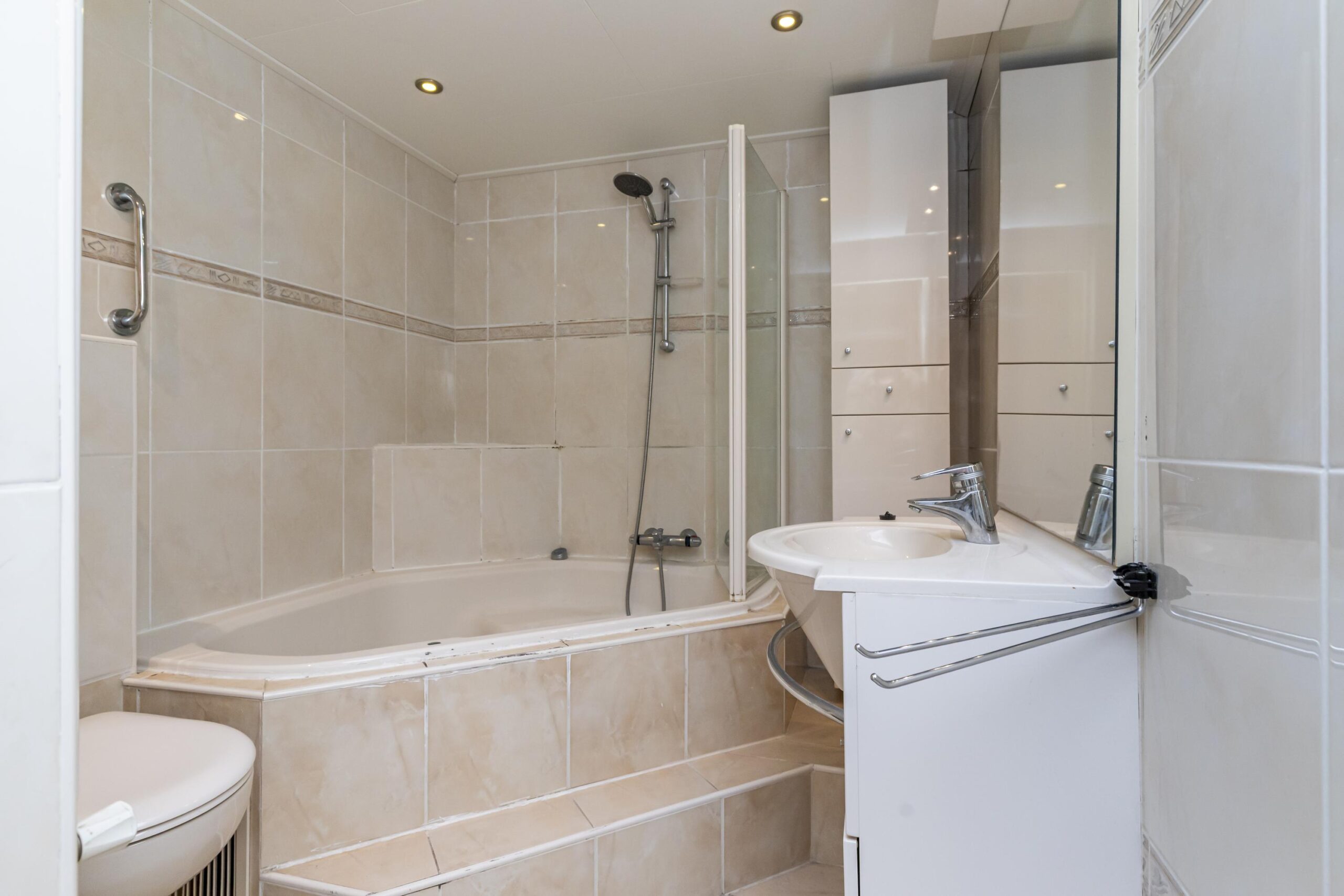 De badkamer is praktisch ingericht en compleet uitgevoerd met een ligbad, toilet en een wastafel met meubel. Een fijne ruimte voor het dagelijkse gebruik, met alles binnen handbereik.