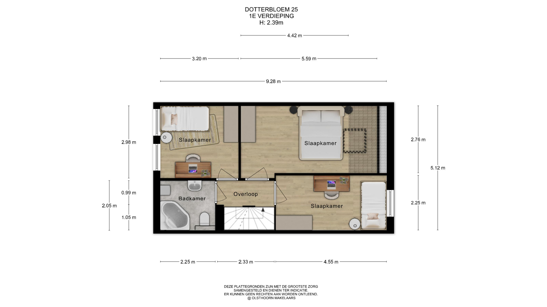 Op de eerste verdieping vind je drie ruime slaapkamers. Twee slaapkamers liggen aan de achterzijde van de woning en zijn prettig licht en goed in te delen, bijvoorbeeld als hoofdslaapkamer en kinderkamer. De derde slaapkamer ligt aan de voorzijde en is eveneens van een fijn formaat, ideaal als extra slaapkamer, werkkamer of kleedruimte.