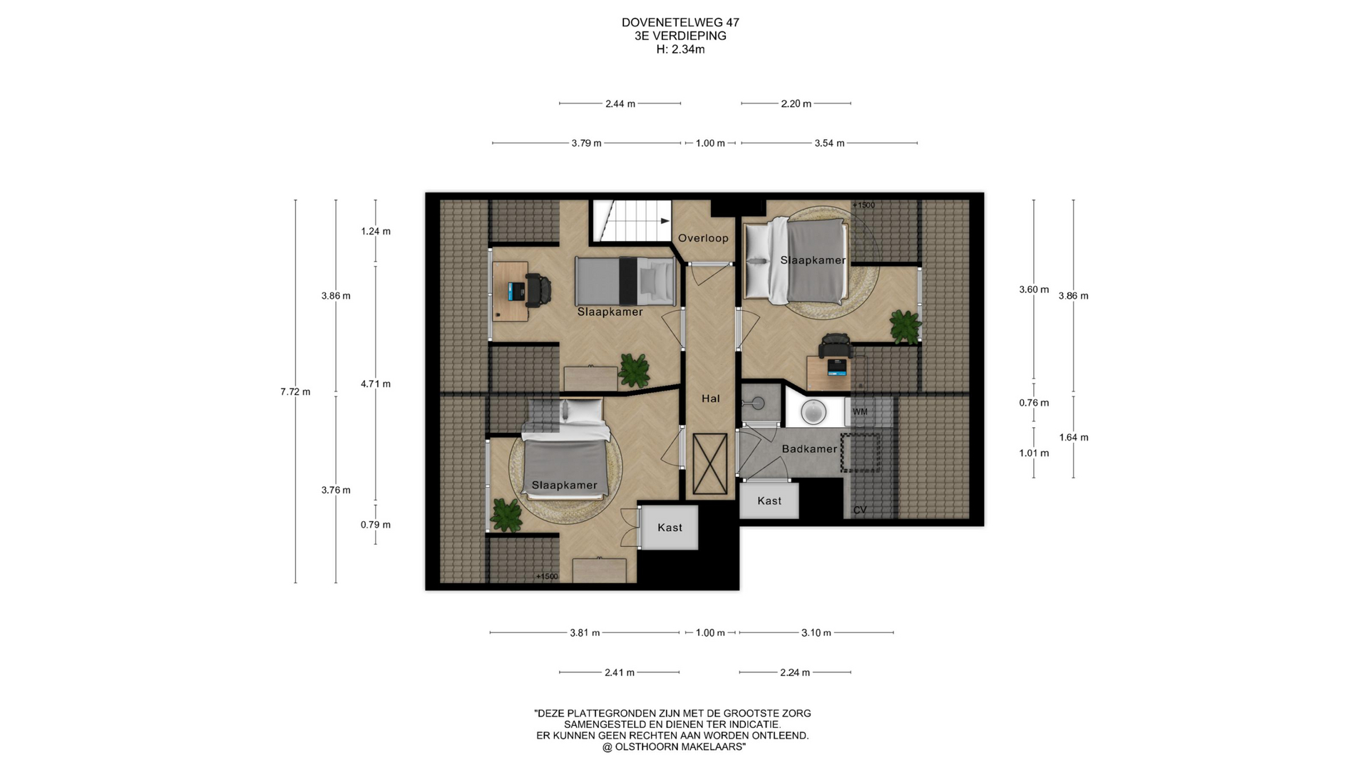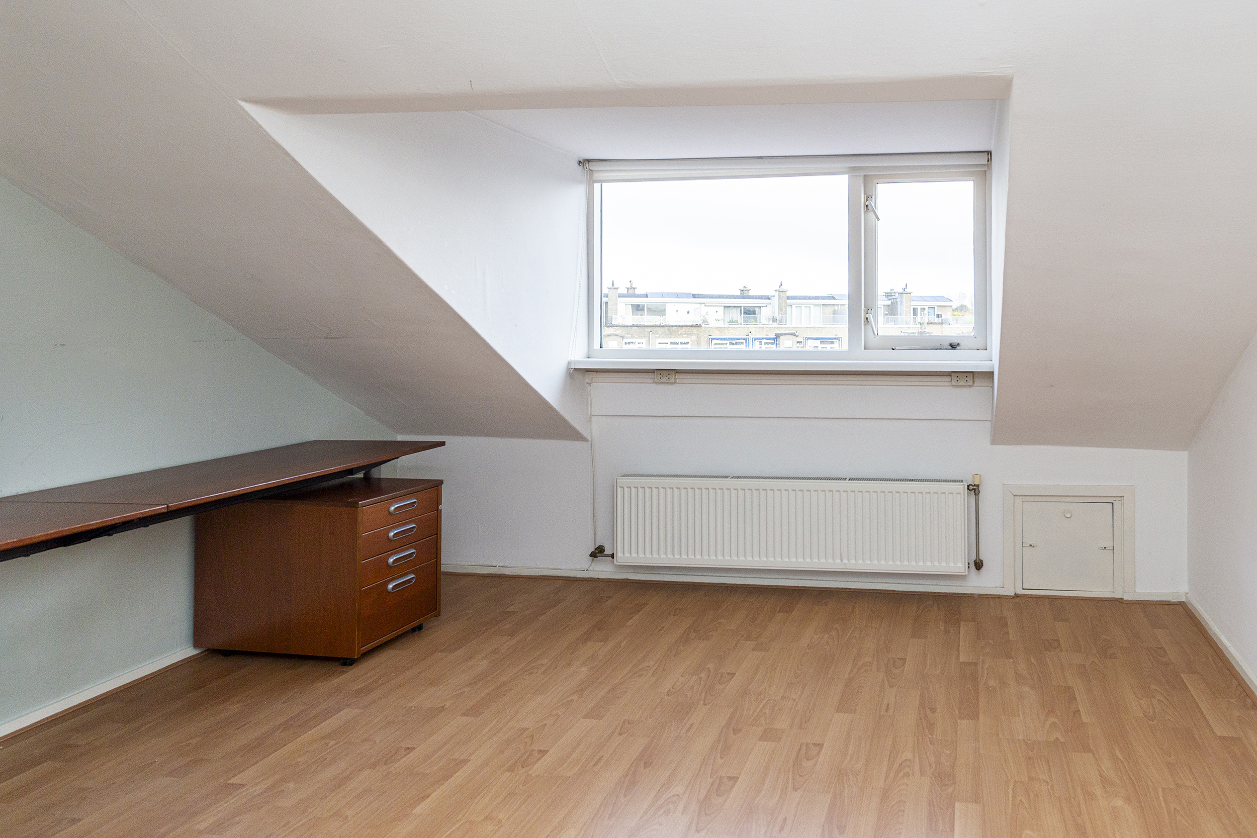 Via de open trap bereikt u de derde etage. Vanaf de overloop heeft u toegang tot de drie slaapkamers en de tweede badkamer. Beide slaapkamers aan de achterzijde hebben een dakkapel, een slaapkamer is voorzien van een ruime vaste kast. De badkamer beschikt over een Velux-dakraam, een separate douche en een opstelruimte voor de wasmachine en droger. Via een luik op de overloop heeft u toegang tot een ruime bergvliering. Tevens is er een eigen ruime berging in de onderbouw.