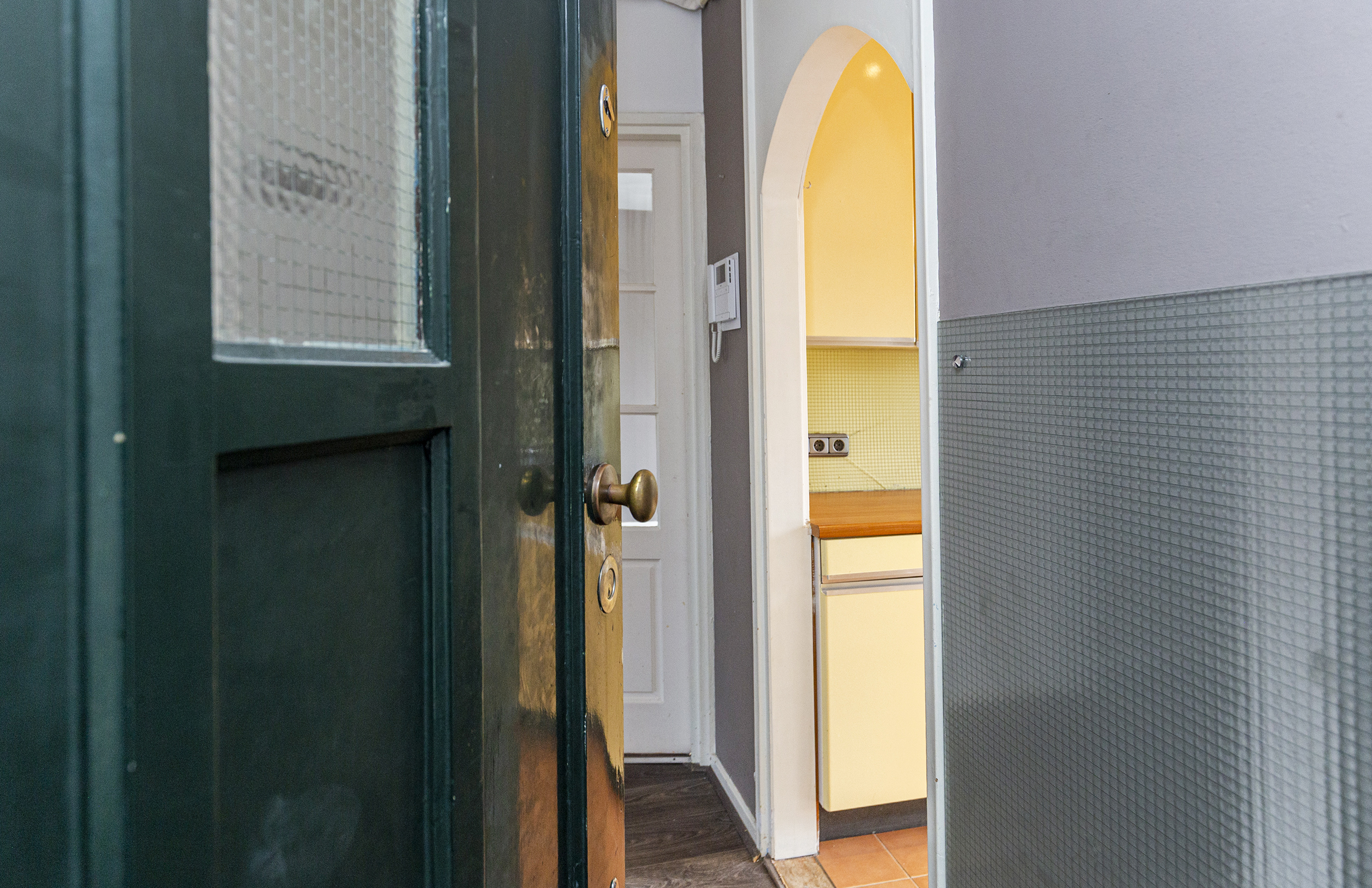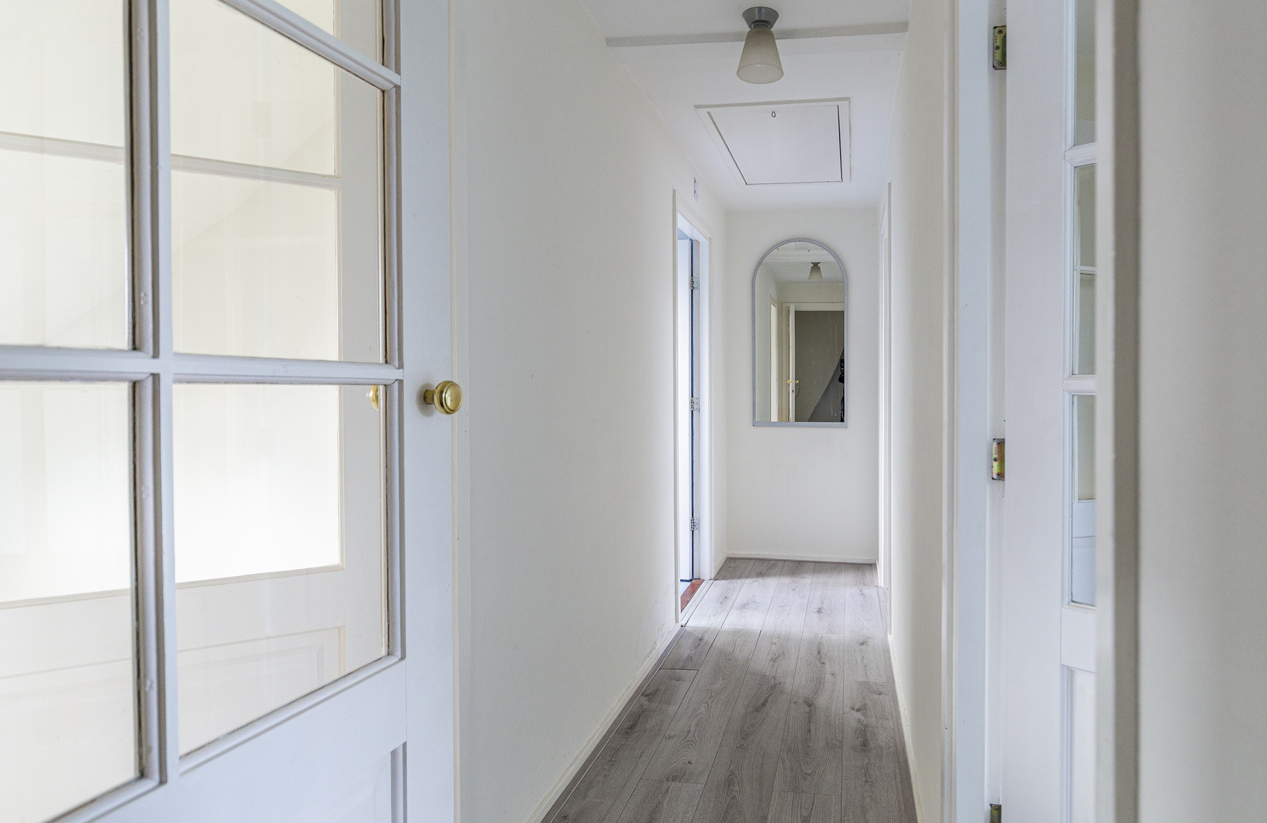 Een breed pad tussen de voortuinen leidt naar de gesloten centrale entree met videofoon. Vanuit de hal, via een trap met brede overloop, bereikt u de tweede etage.