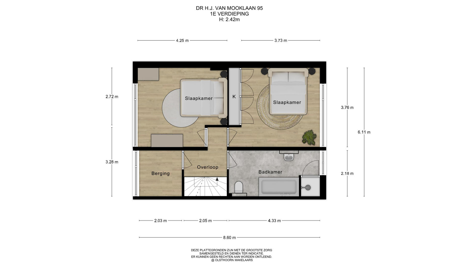 Overloop met toegang tot de drie kamers waarvan twee ruime slaapkamers en een ruime berging/studiekamer en de moderne badkamer. De hoofdslaapkamer bevindt zich aan de achterzijde van de woning. Vanuit de overloop is de ruime badkamer bereikbaar, welke is voorzien van een ruime inloopdouche, ligbad, wastafelmeubel, tweede toilet, designradiator. Aan de voorzijde zijn twee kamers gesitueerd. De voormalige badkamer thans berging en een ruime slaapkamer.